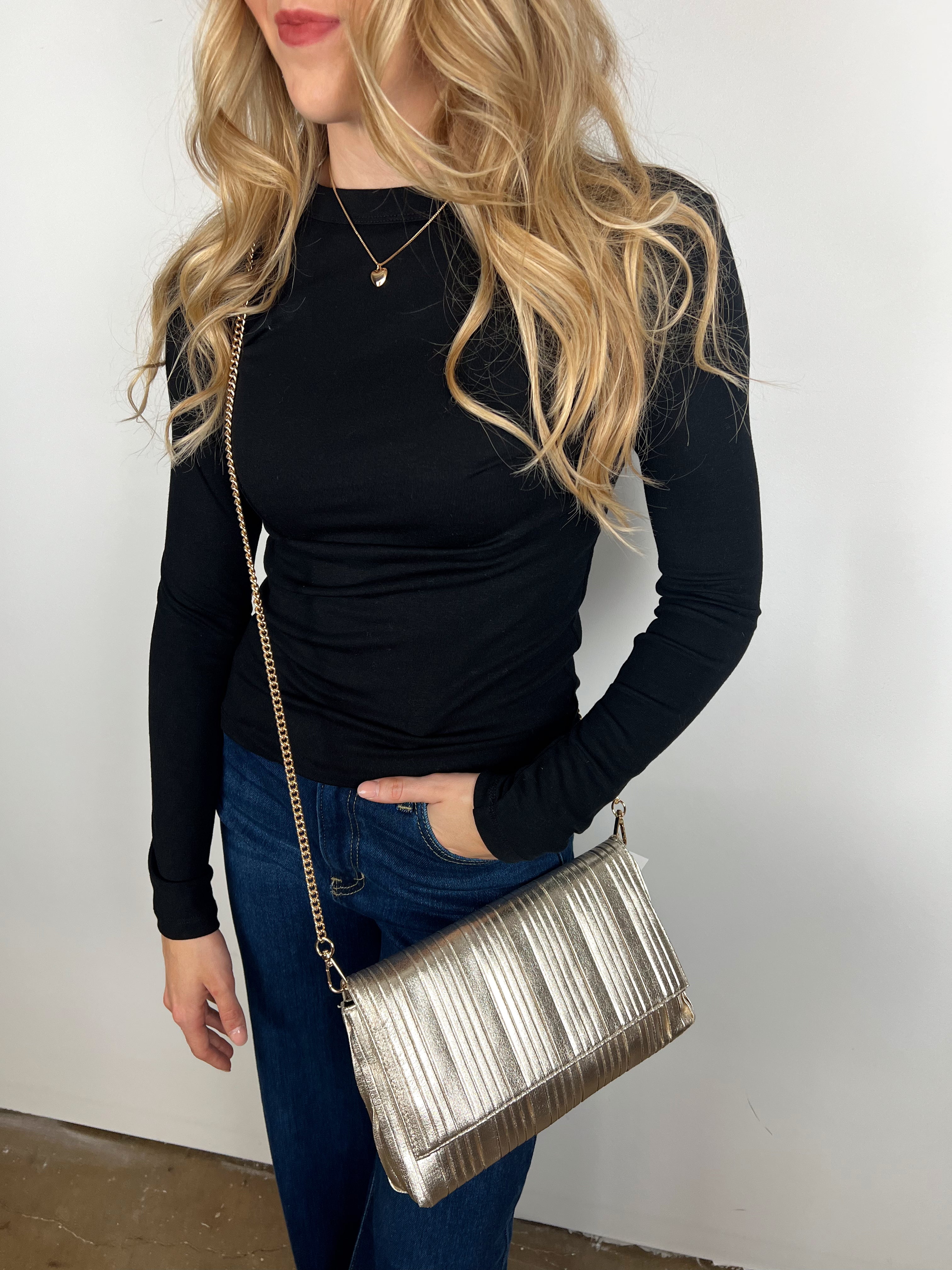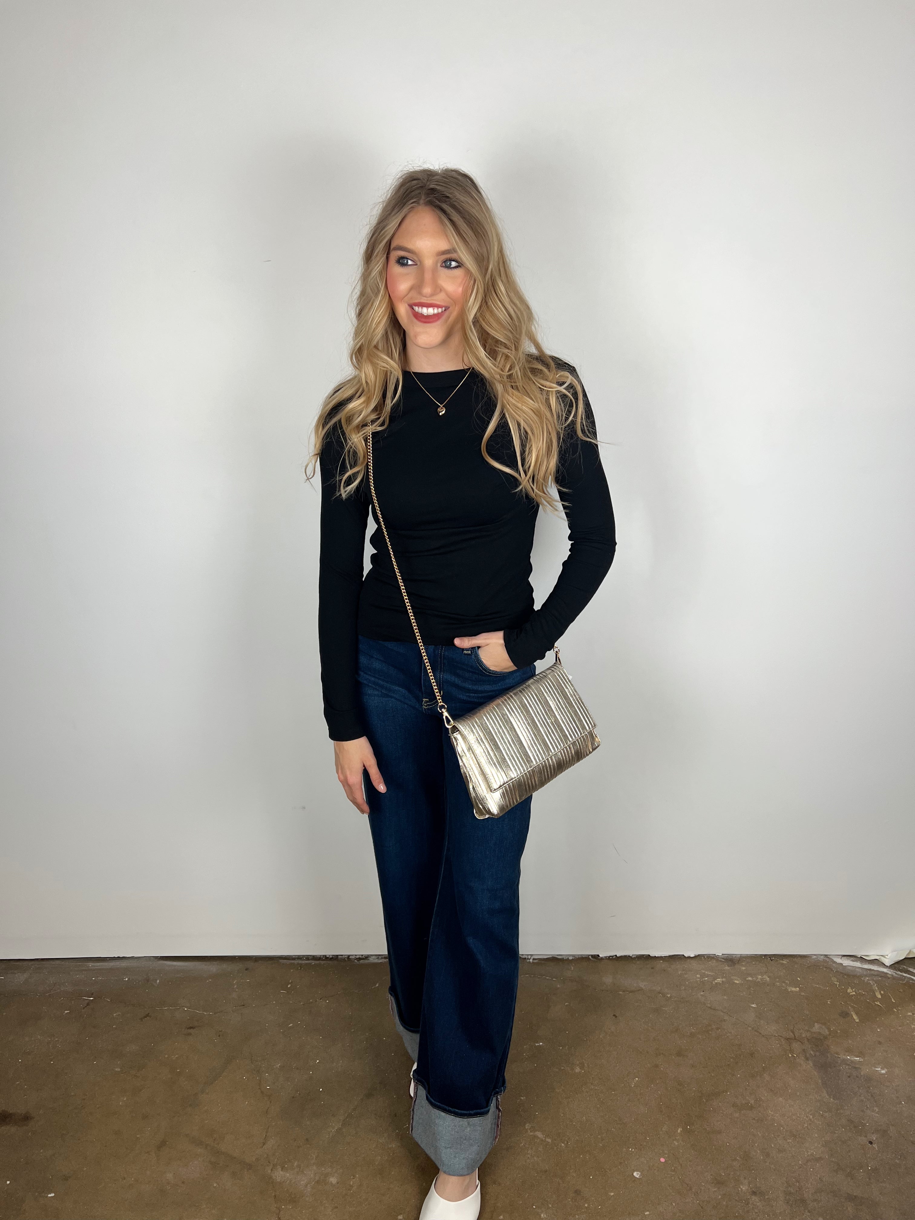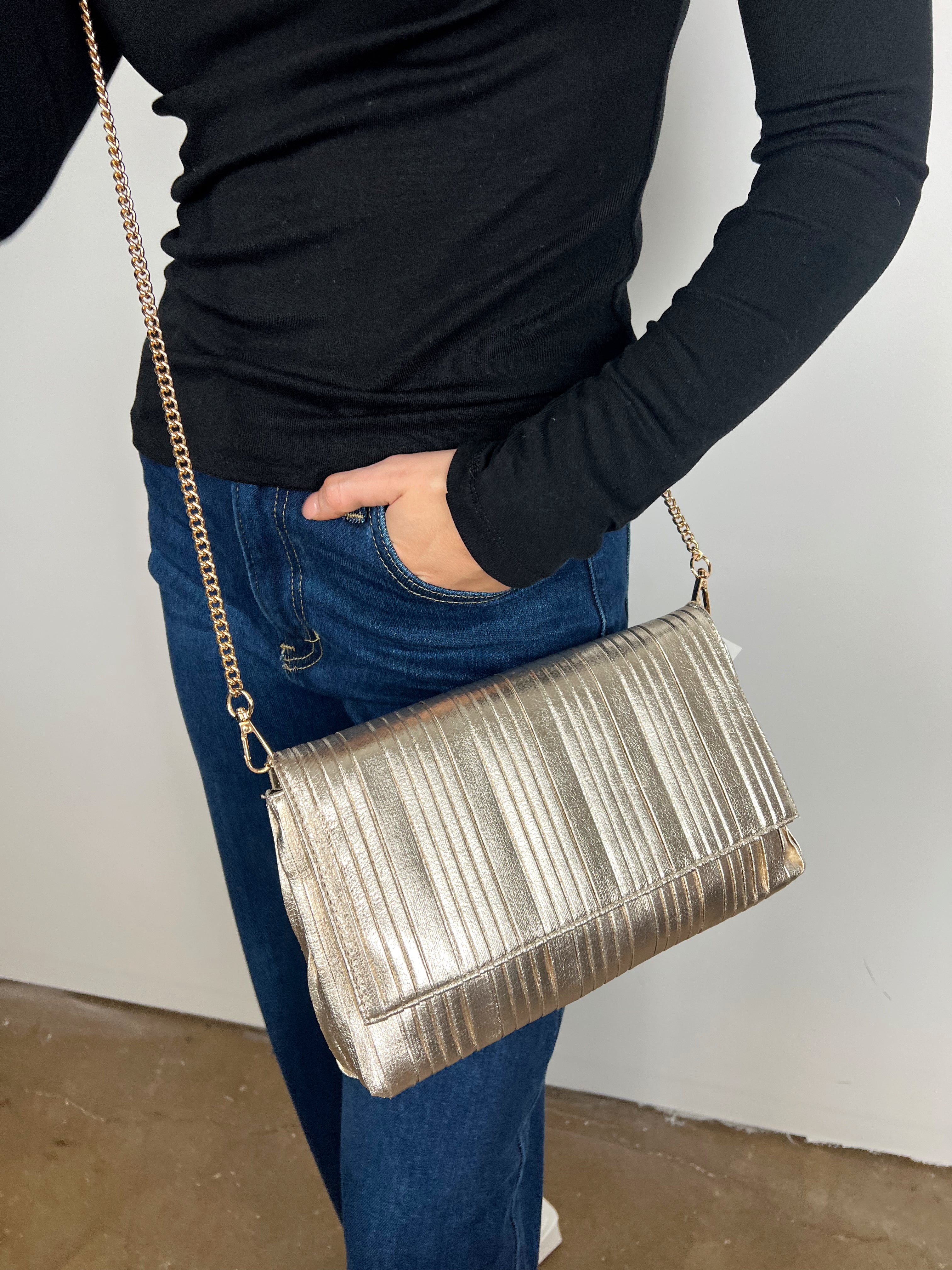 Meet your new go-to accessory — the Esmeralda Clutch Purse. This sleek gold bag instantly elevates any outfit, whether you wear it as a crossbody for hands-free style or carry it as a clutch for a polished evening look. The luxe ribbed texture and subtle sheen add just the right amount of glam to both your casual denim and your night-out dress.