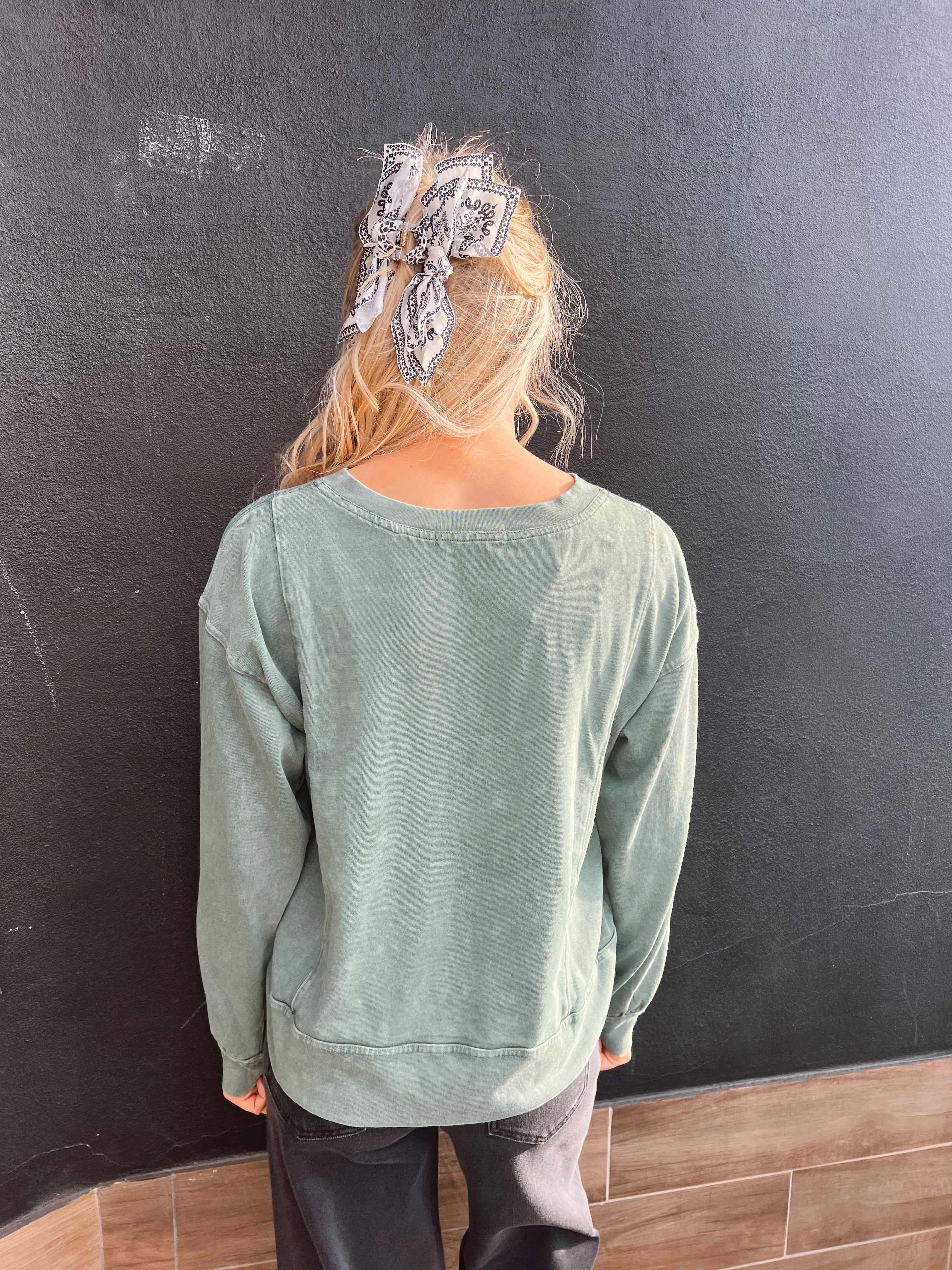 This washed sage long sleeve is the definition of easy, everyday style. With its soft, lived-in finish and relaxed silhouette, it gives that perfectly effortless “threw it on and still look cute” vibe. The dropped shoulders, comfy fit, and subtle vintage wash make it the kind of top you’ll reach for on repeat — cozy for fall, effortless for layering, and flattering on every body type!