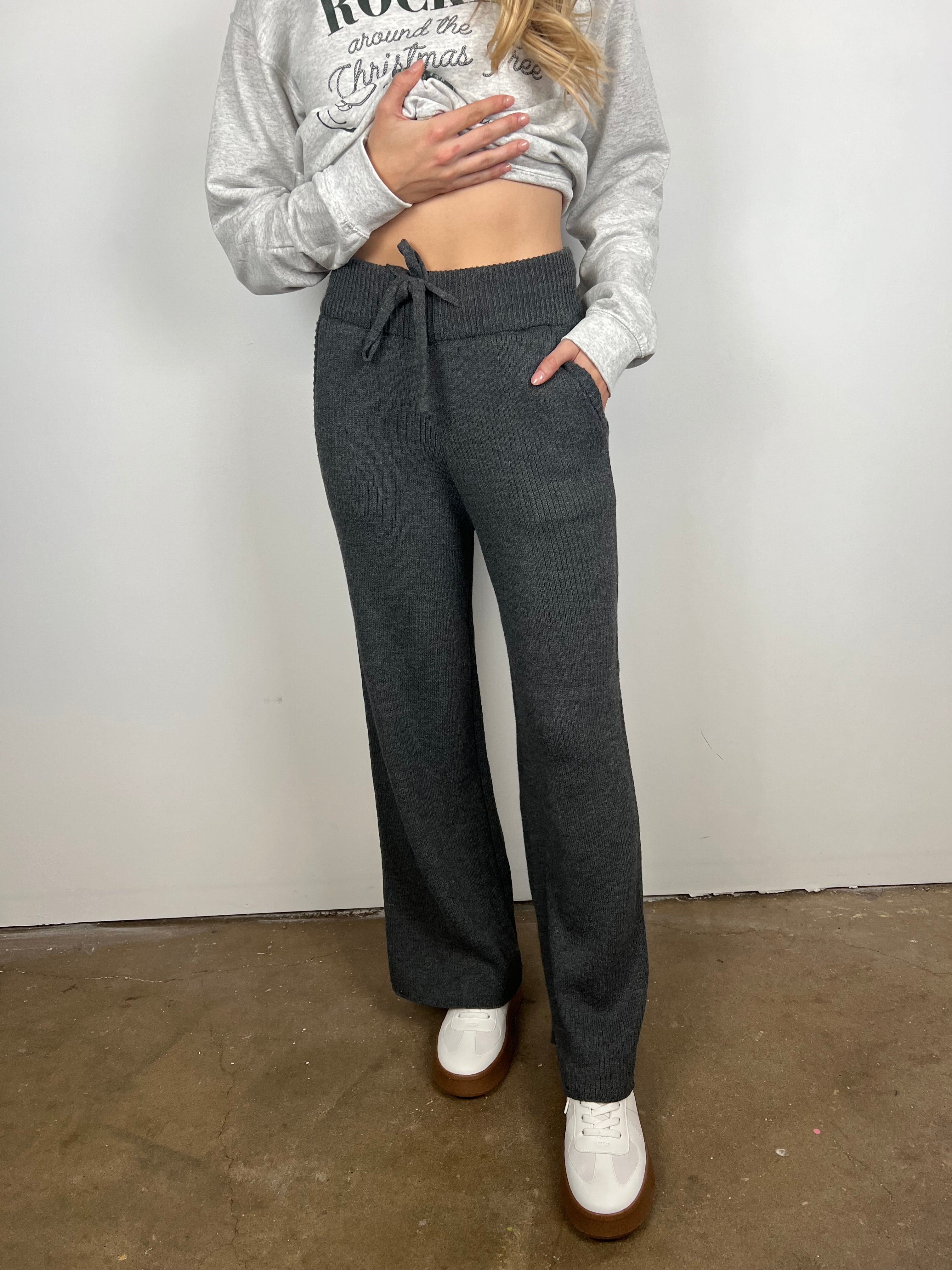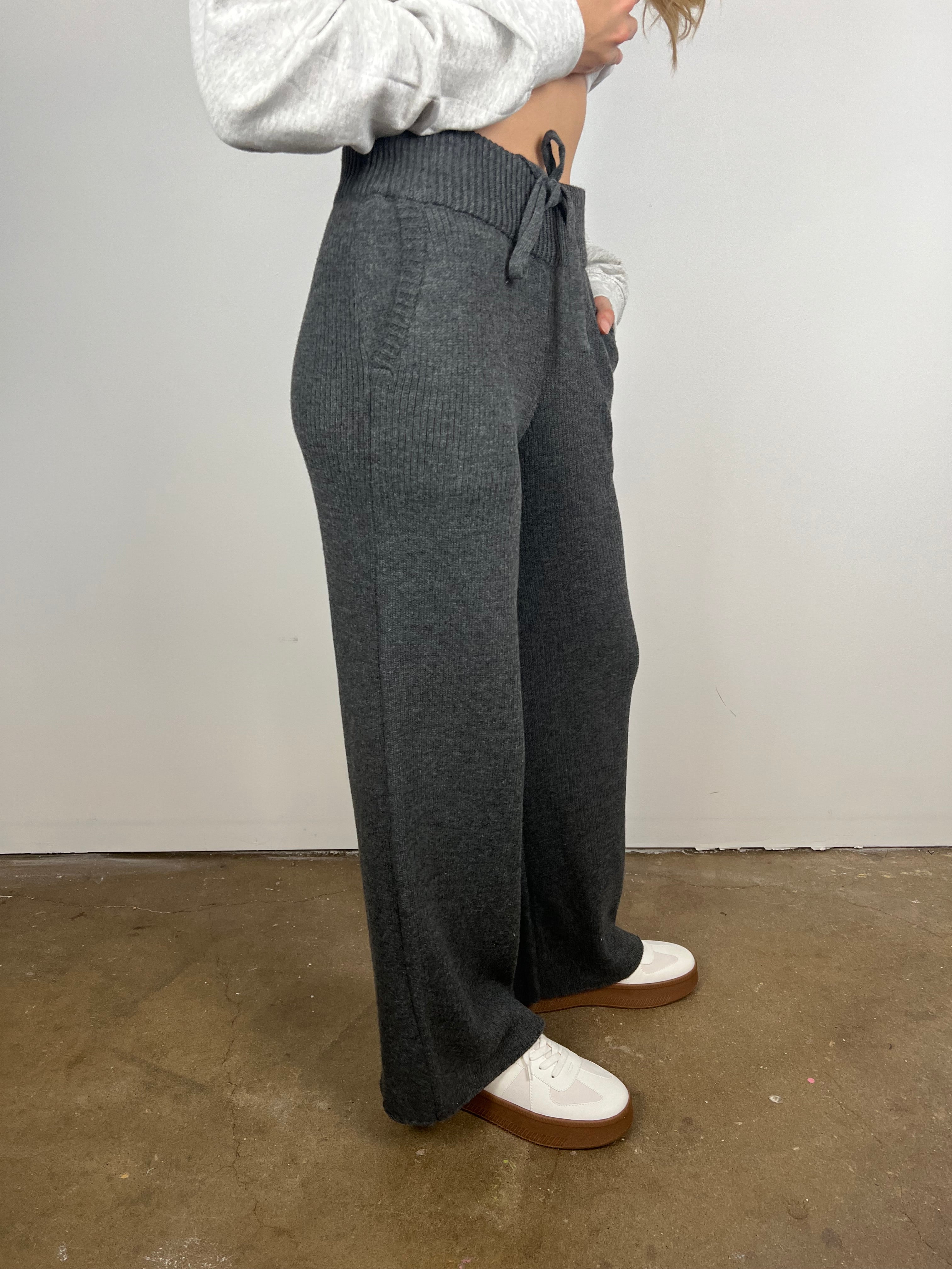 Stay chic while keeping it comfortable in these dark charcoal ribbed knit pants. Featuring a flattering wide-leg silhouette, an adjustable drawstring waist, and side pockets for everyday ease- these bottoms are the perfect blend of lounge and streetwear. Pair them with your favorite graphic sweatshirt and sneakers for laid-back days or dress them up with a sleek bodysuit and booties for casual nights out.
