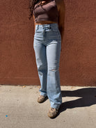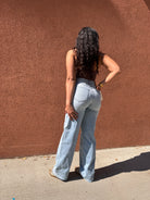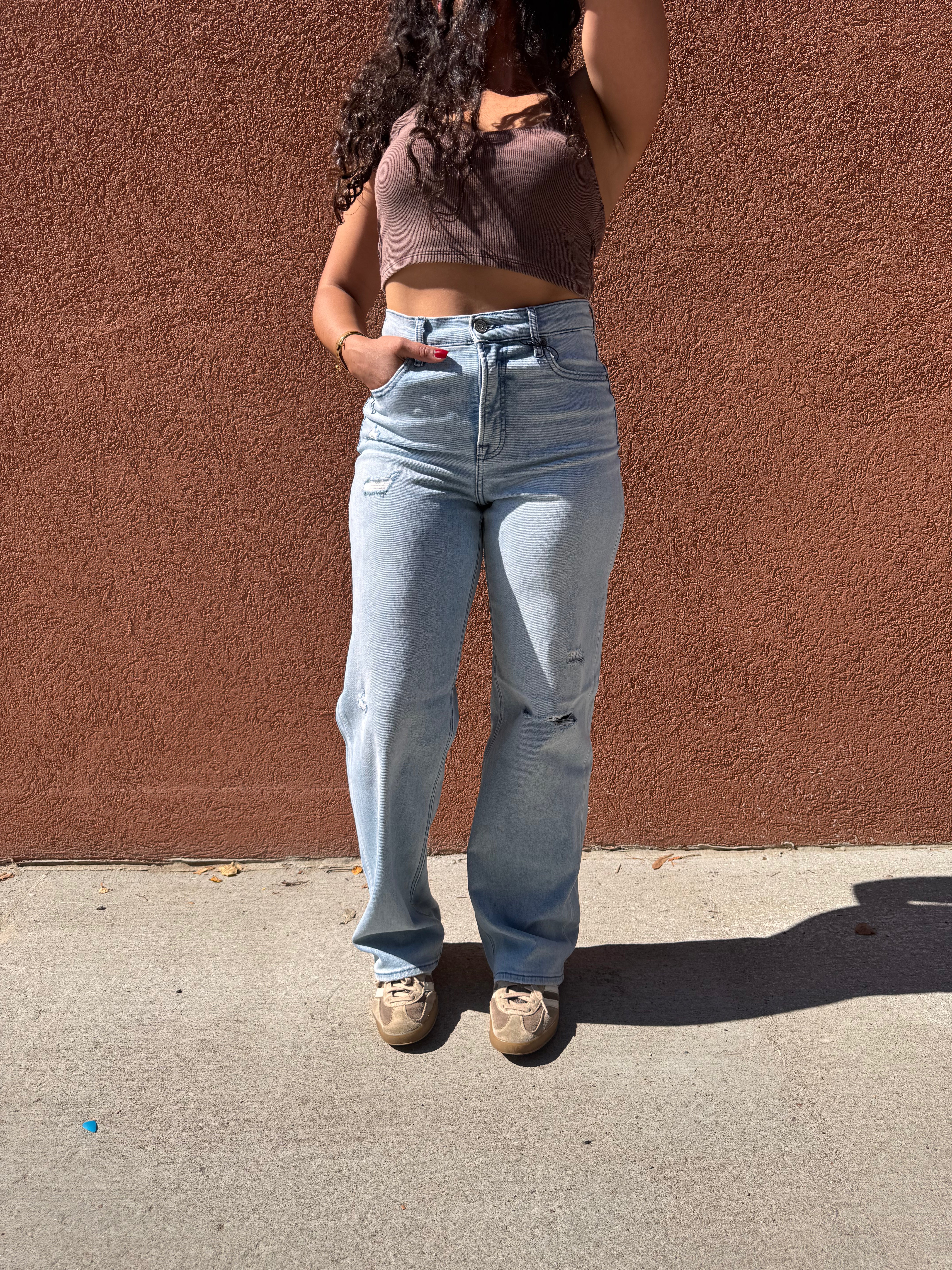 Our high-rise light wash jeans are the perfect mix of laid-back and polished. Designed with a flattering double-button waist, subtle distressing, and a straight-leg silhouette, they give you that easy-going vibe. Pair them with sneakers for a casual days or dress them up with heels for a night out- the styling options are endless.
