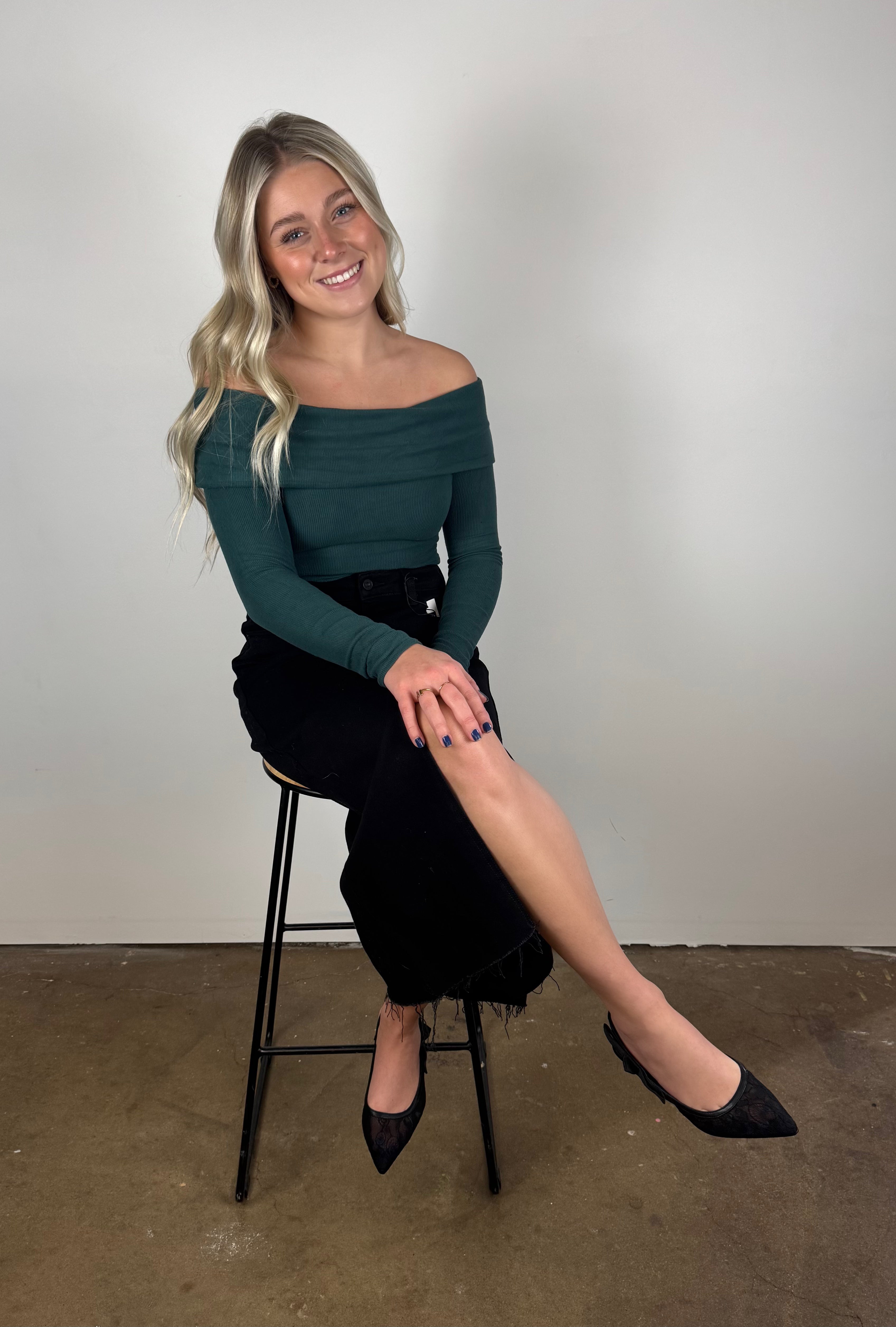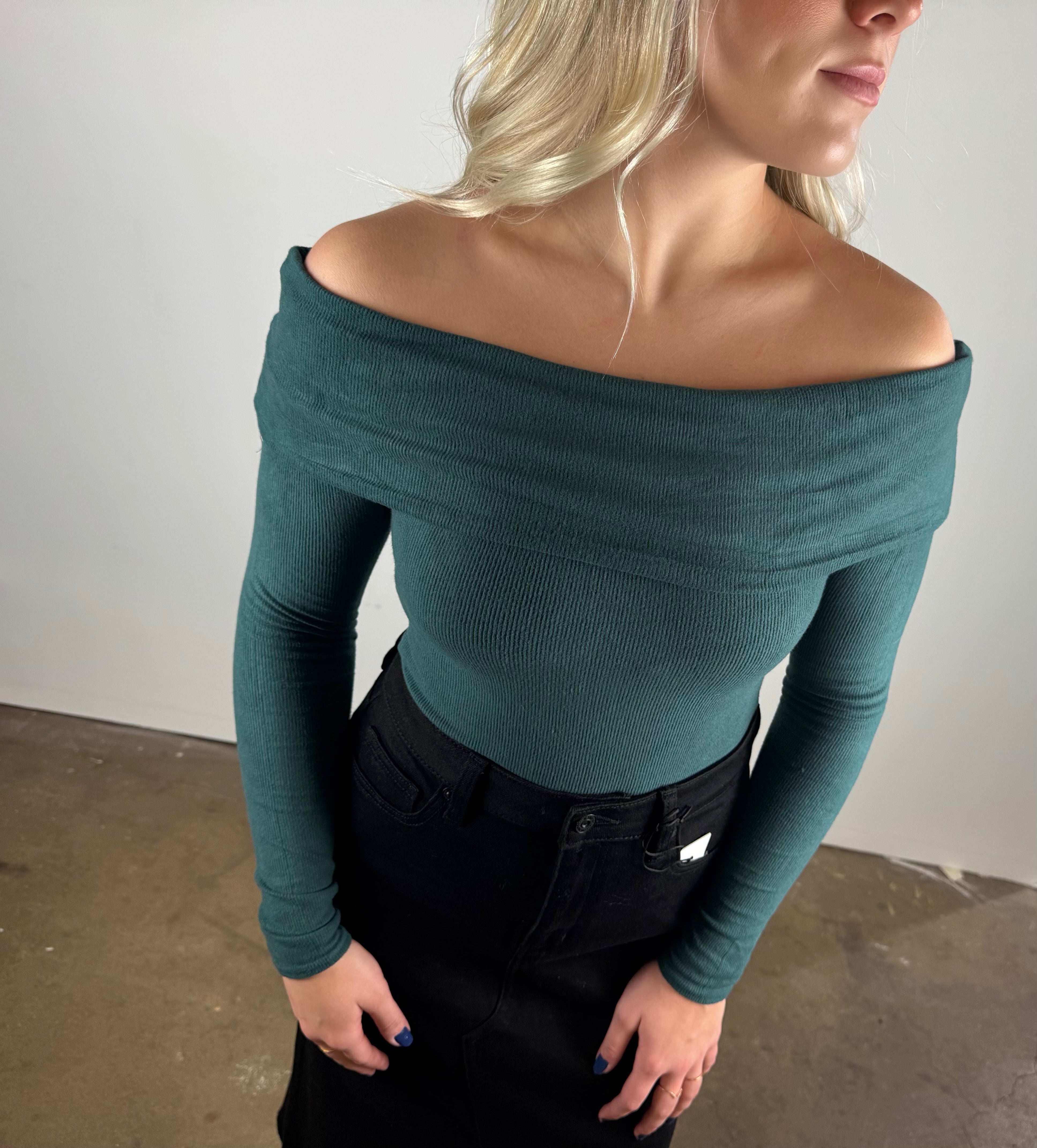 This off-the-shoulder ribbed top brings effortless elegance with a touch of sass—perfect for dressing up denim or pairing with your favorite night-out pieces.