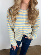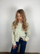 This pastel striped cardigan brings a cheerful pop of color to your everyday wardrobe. Featuring soft yellow and light blue stripes, this knit button-up adds the perfect mix of cozy and fun. With its relaxed fit and lightweight feel, it’s ideal for layering over tanks, tees, or dresses — a must-have piece that transitions effortlessly from season to season.
