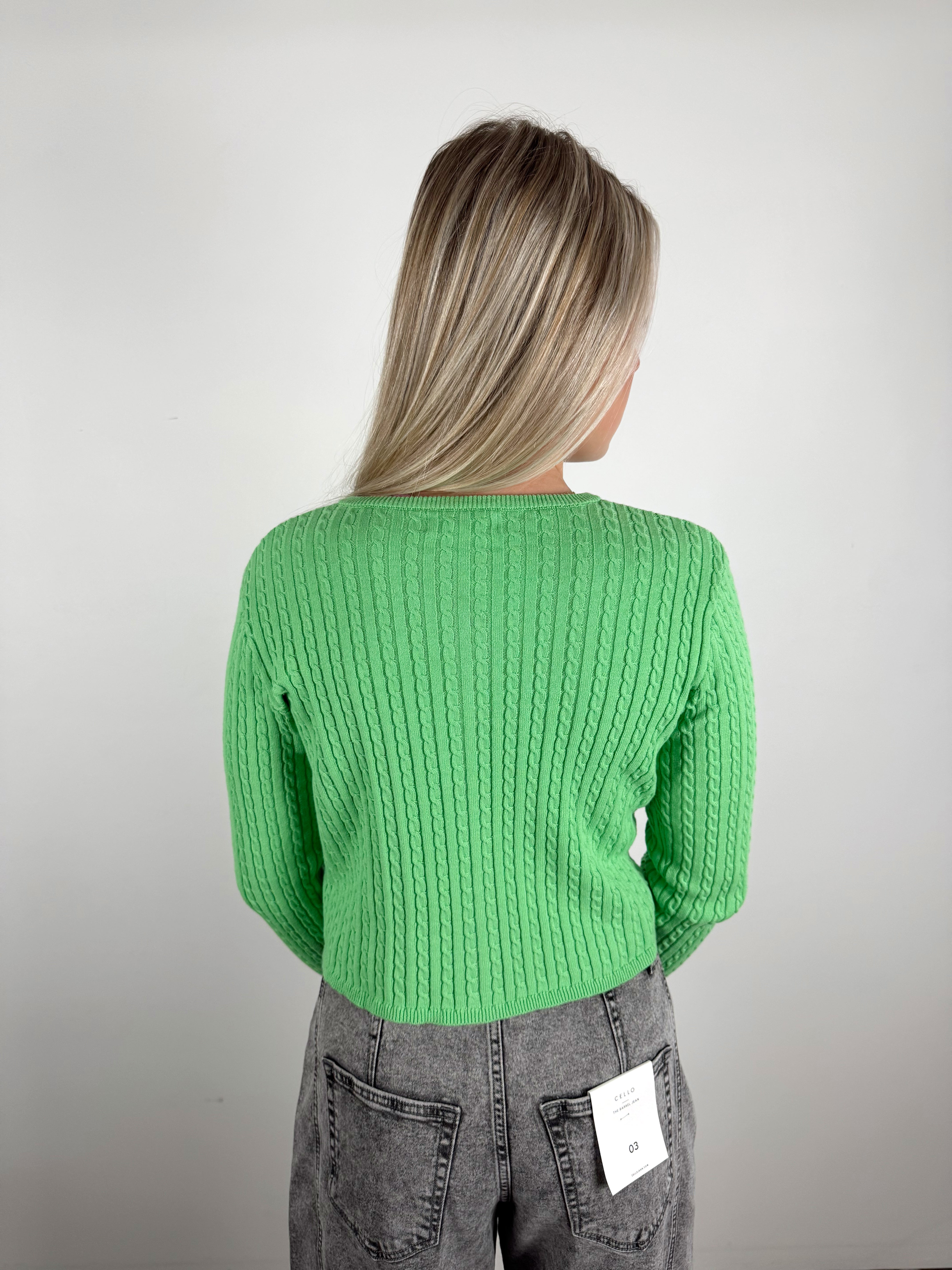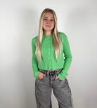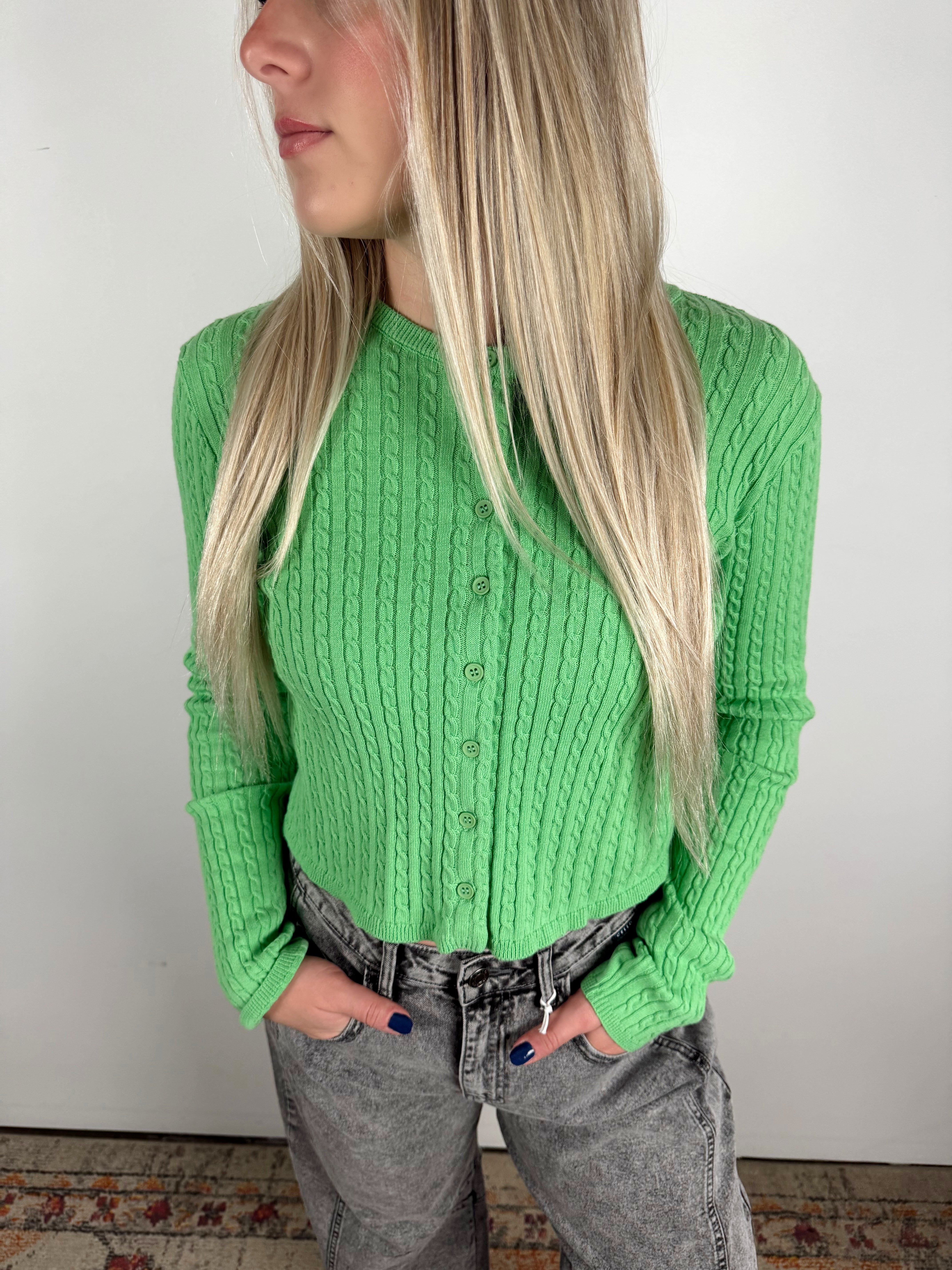 This bright green cropped cardigan is the perfect mix of cozy and cute. Featuring a soft cable-knit texture with a button-front design, it’s an easy layering piece that adds a fun pop of color to any outfit — whether you wear it buttoned up as a top or open over a tank.
