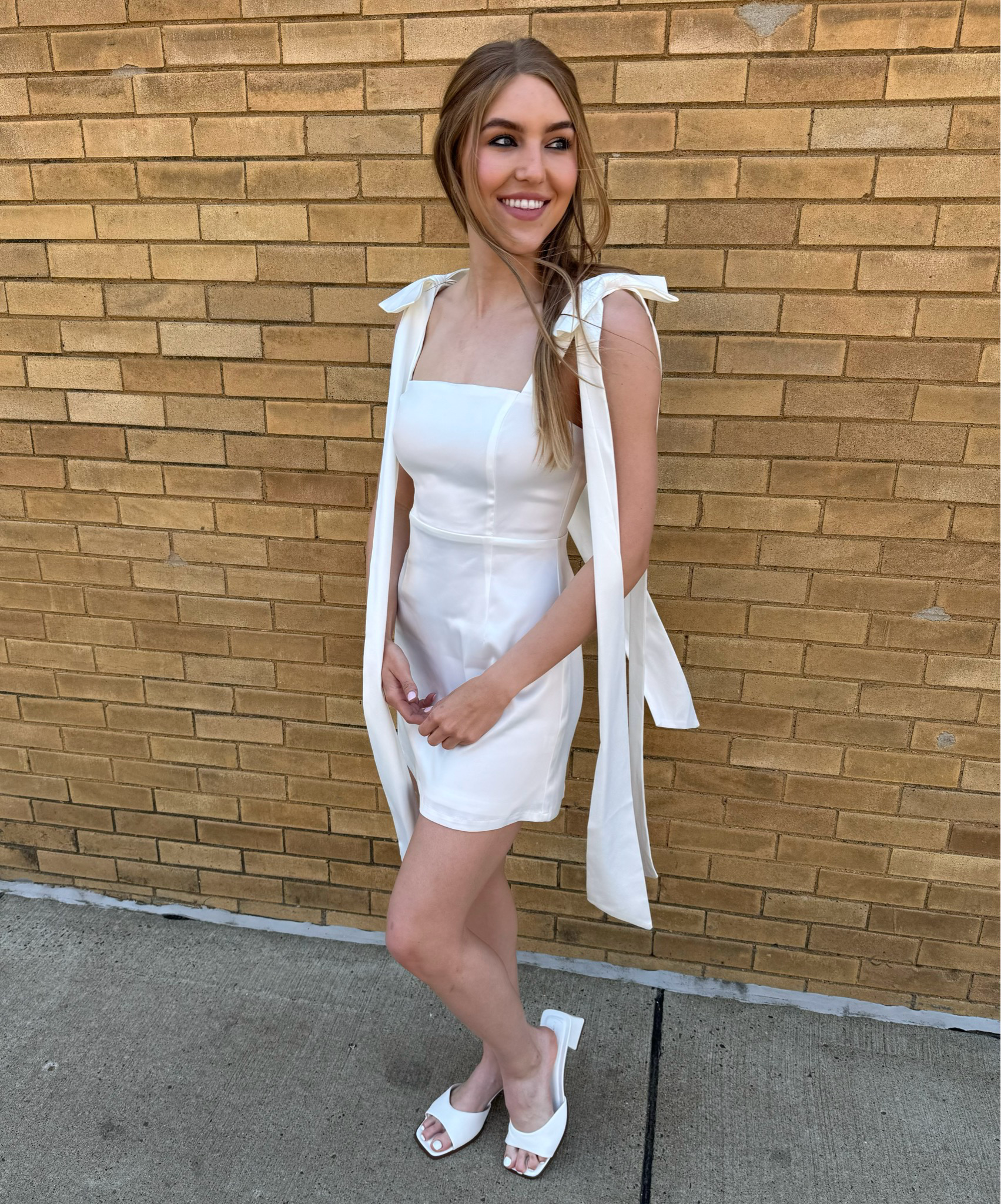 Sweet, flirty, and full of charm. This mini dress features delicate bow-tie straps and a flattering silhouette made for sunny days and fun nights. This dress brings all the glam for graduation, bachelorette parties, or wedding rehearsals.