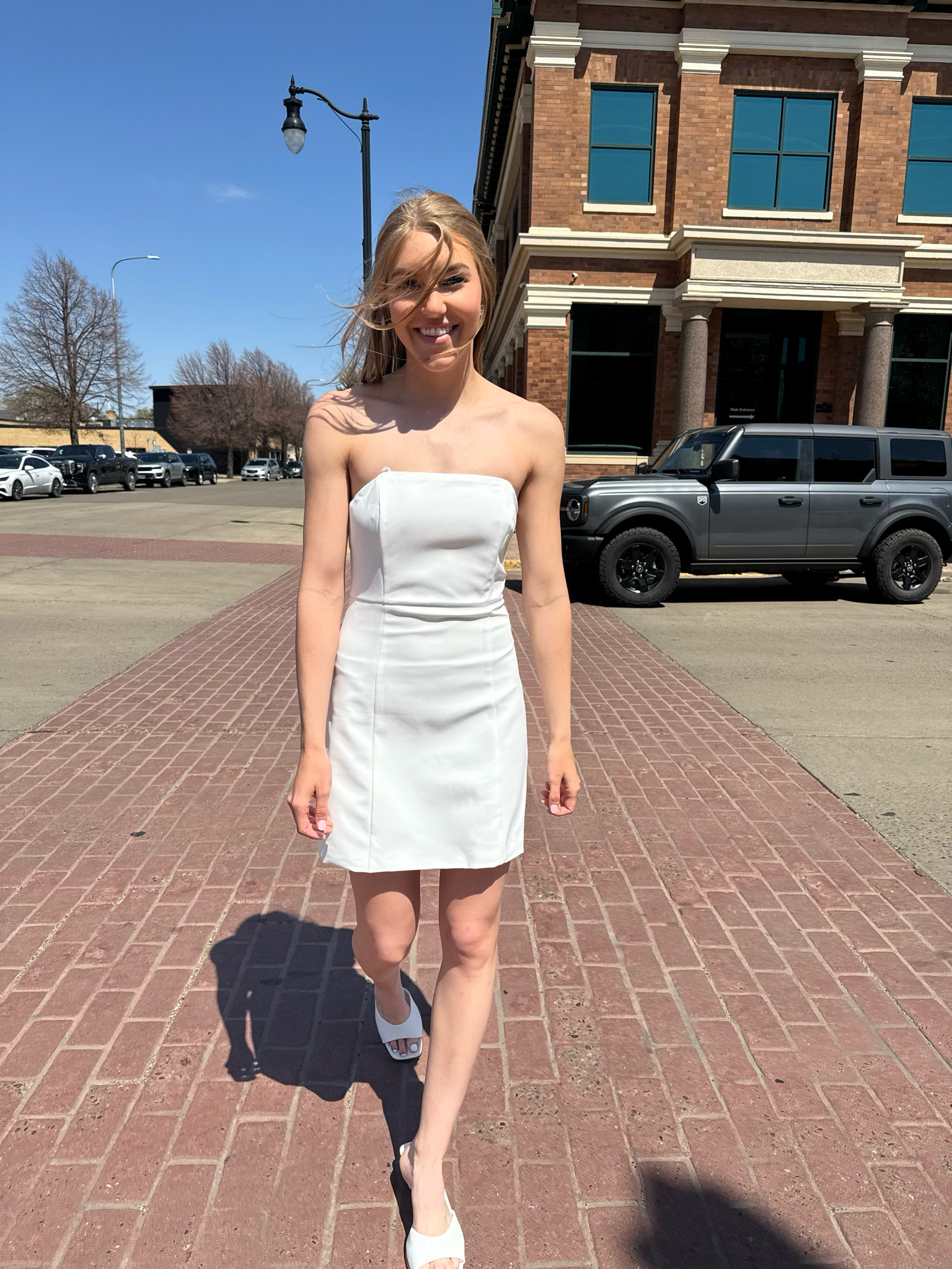 Elegant and timeless. This white dress is all about making a statement-- with a structured silhouette and a bold bow detail that steals the show. Perfect for bridal events, graduation, or any moment that calls for classic style with a modern twist.