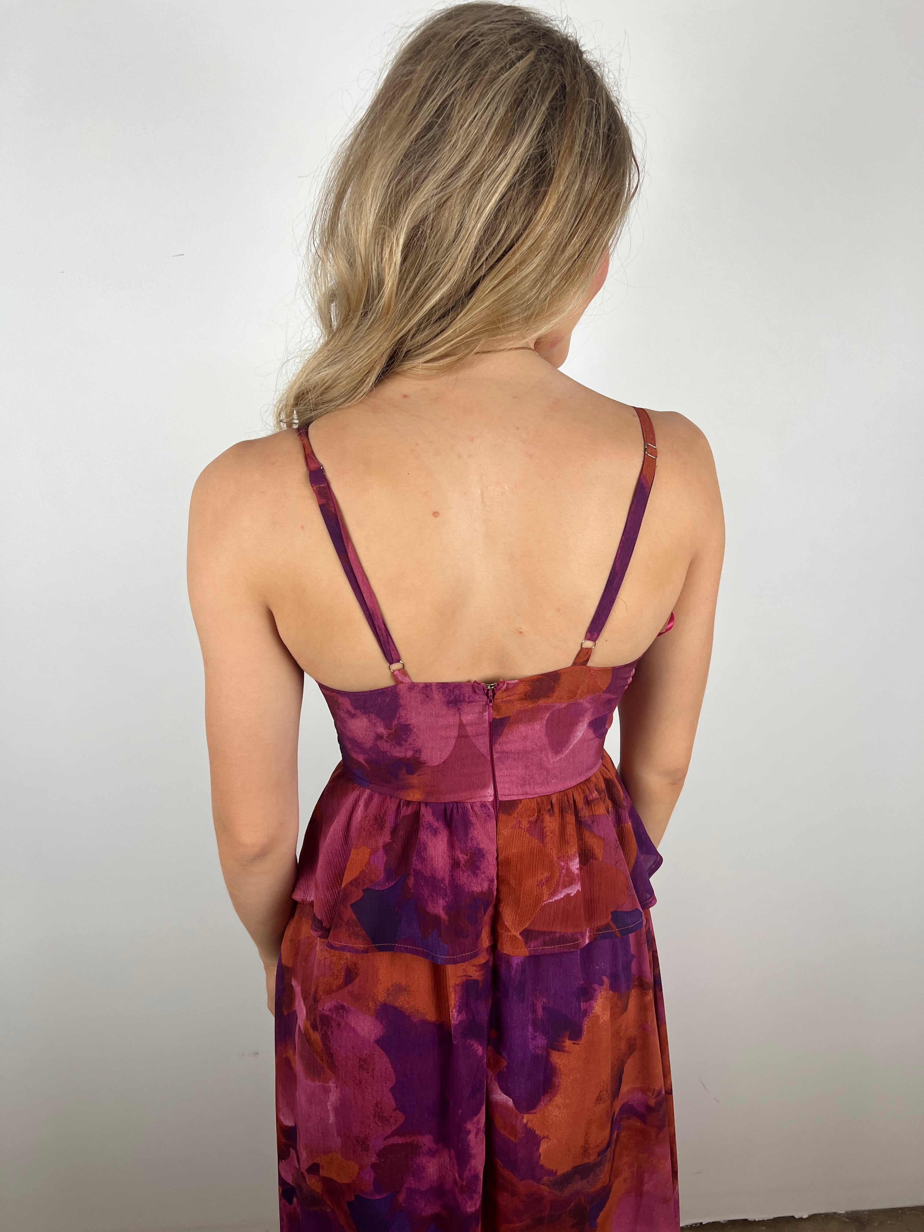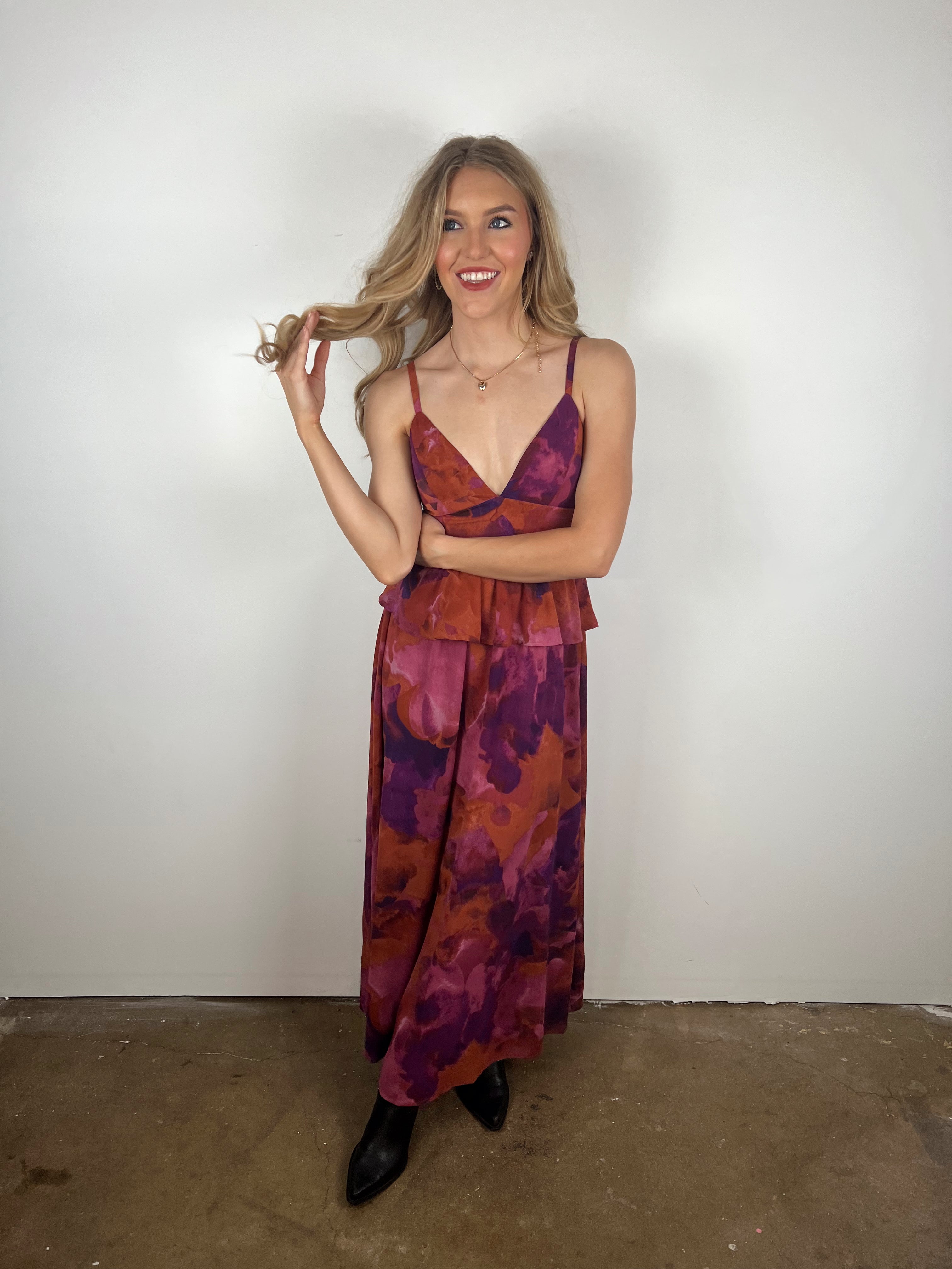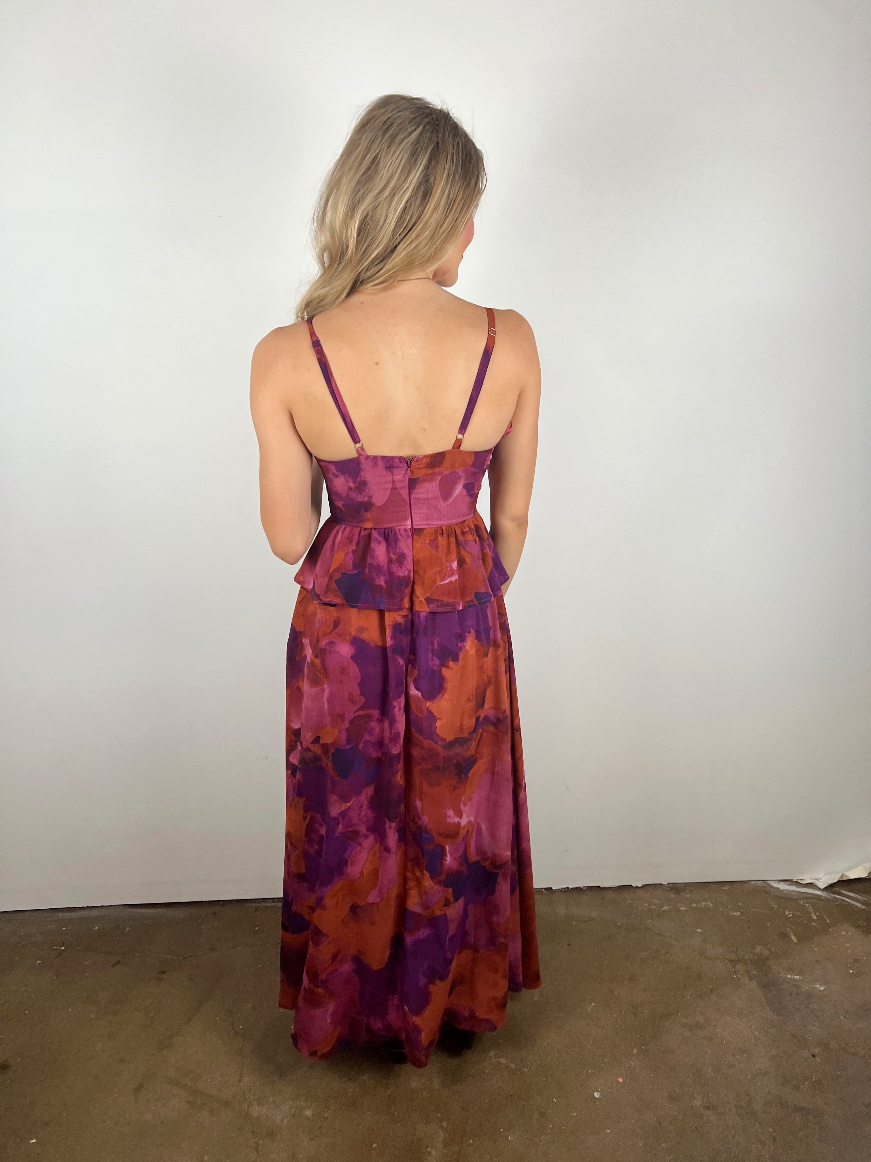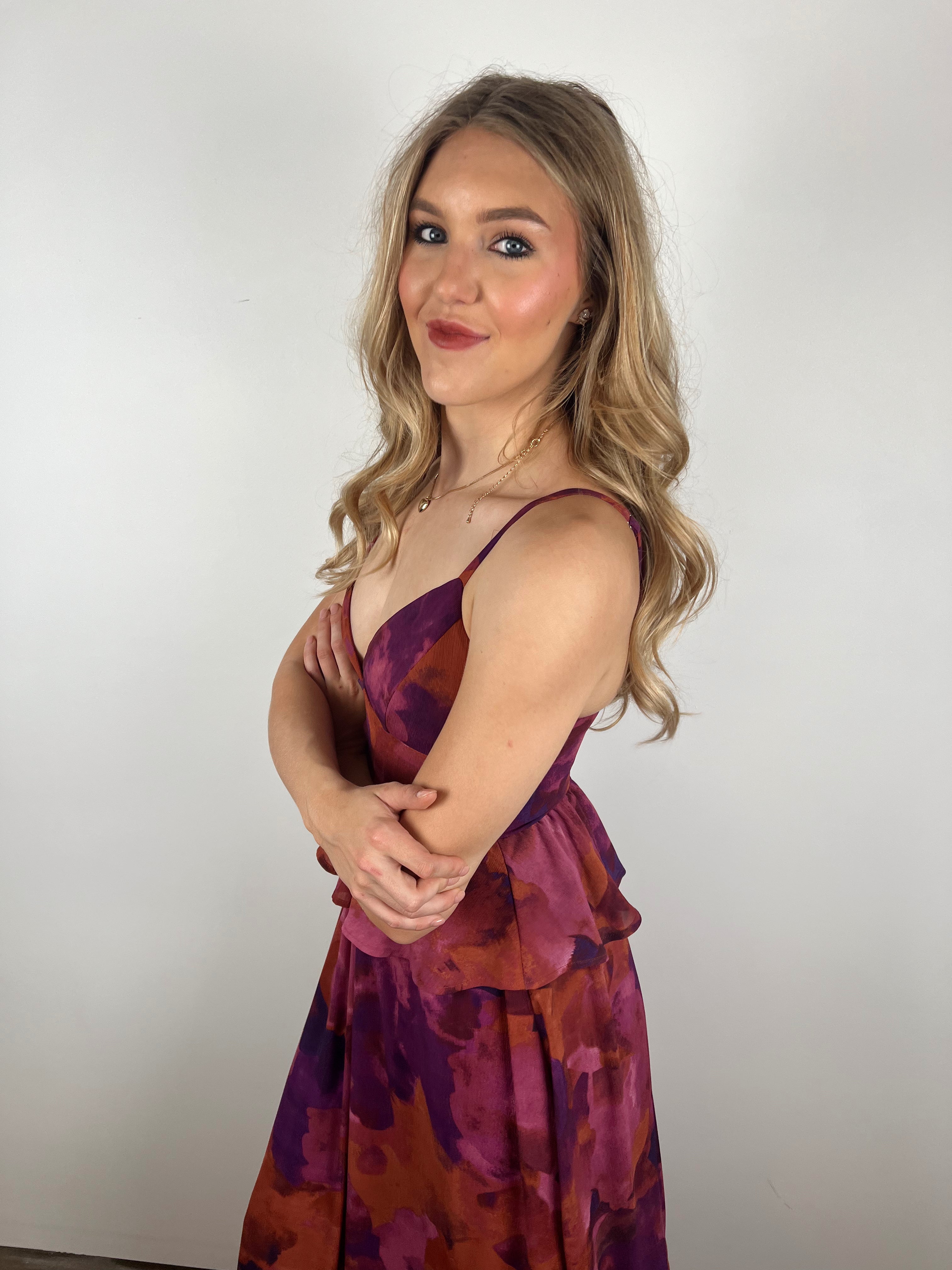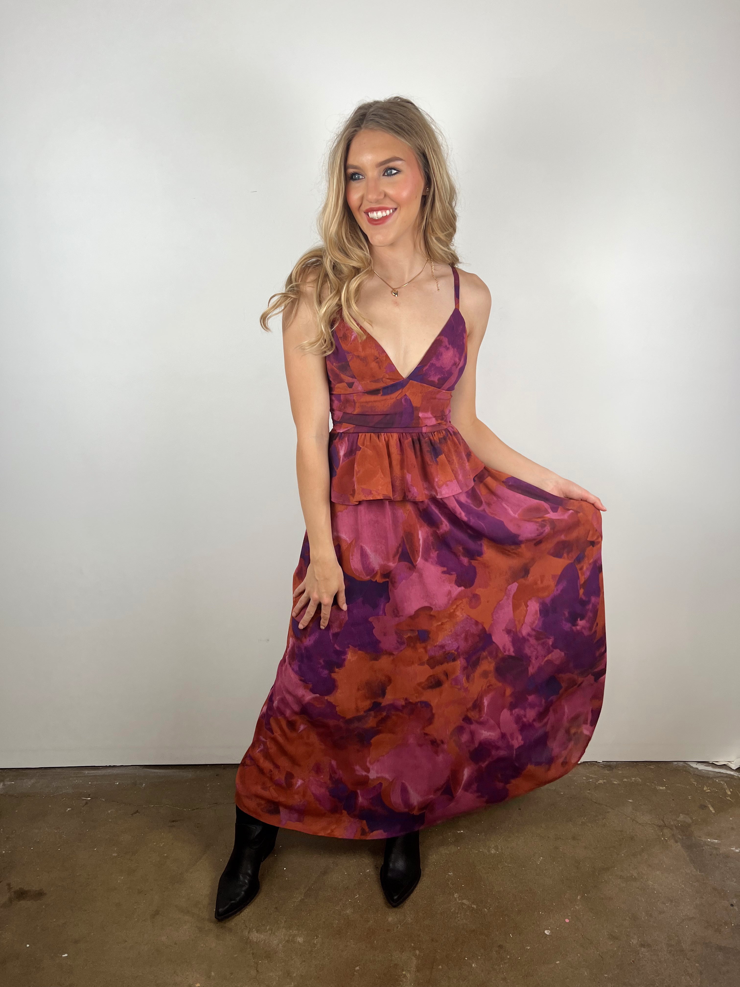 Bring the drama in this stunning watercolor maxi dress — a dreamy blend of deep plum, rose, and rust tones that feel made for fall. The silky fabric drapes effortlessly while the v-neckline and tiered waistline flatter your shape in all the right places. Flowy, feminine, and full of color — this piece is perfect for weddings, events, or a night out that calls for a little extra wow.