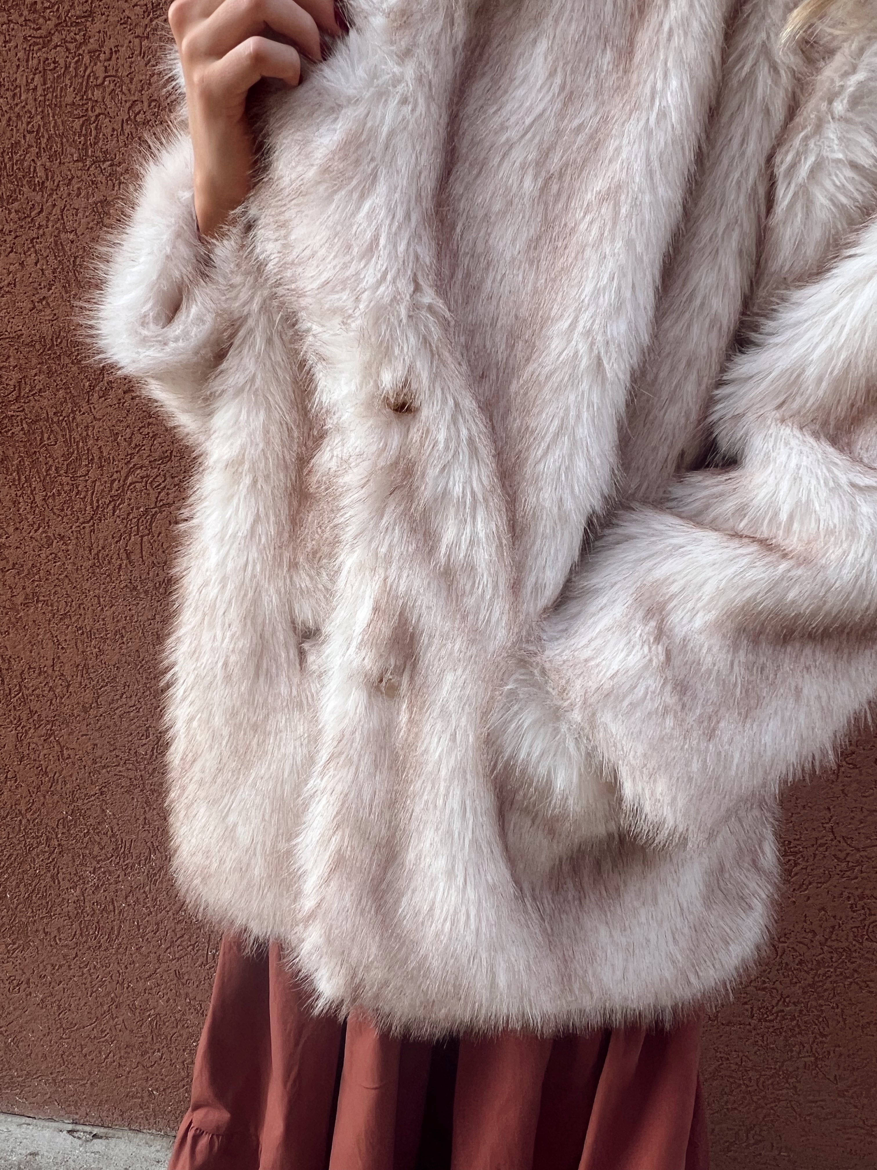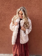 Meet the coat that instantly elevates every winter moment. This luxe faux-fur jacket brings all the glam without sacrificing warmth. The soft blush-cream tone feels feminine and modern, while the plush texture gives you that high-end, cozy-chic vibe your wardrobe has been craving. Effortless to dress up or down, this statement piece pairs perfectly with dresses, denim, and everything in between. The kind of coat that makes you feel put-together the second you slip it on—warm, glamorous, and totally Saucy Blonde approved.