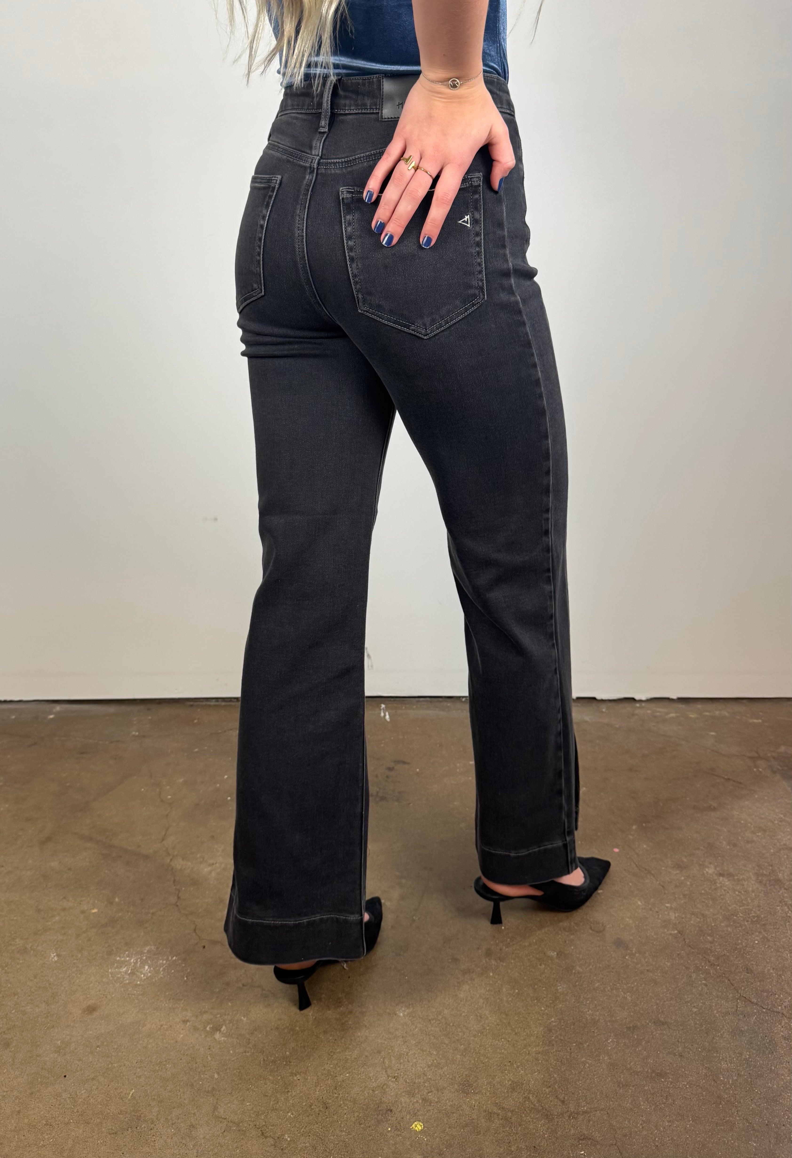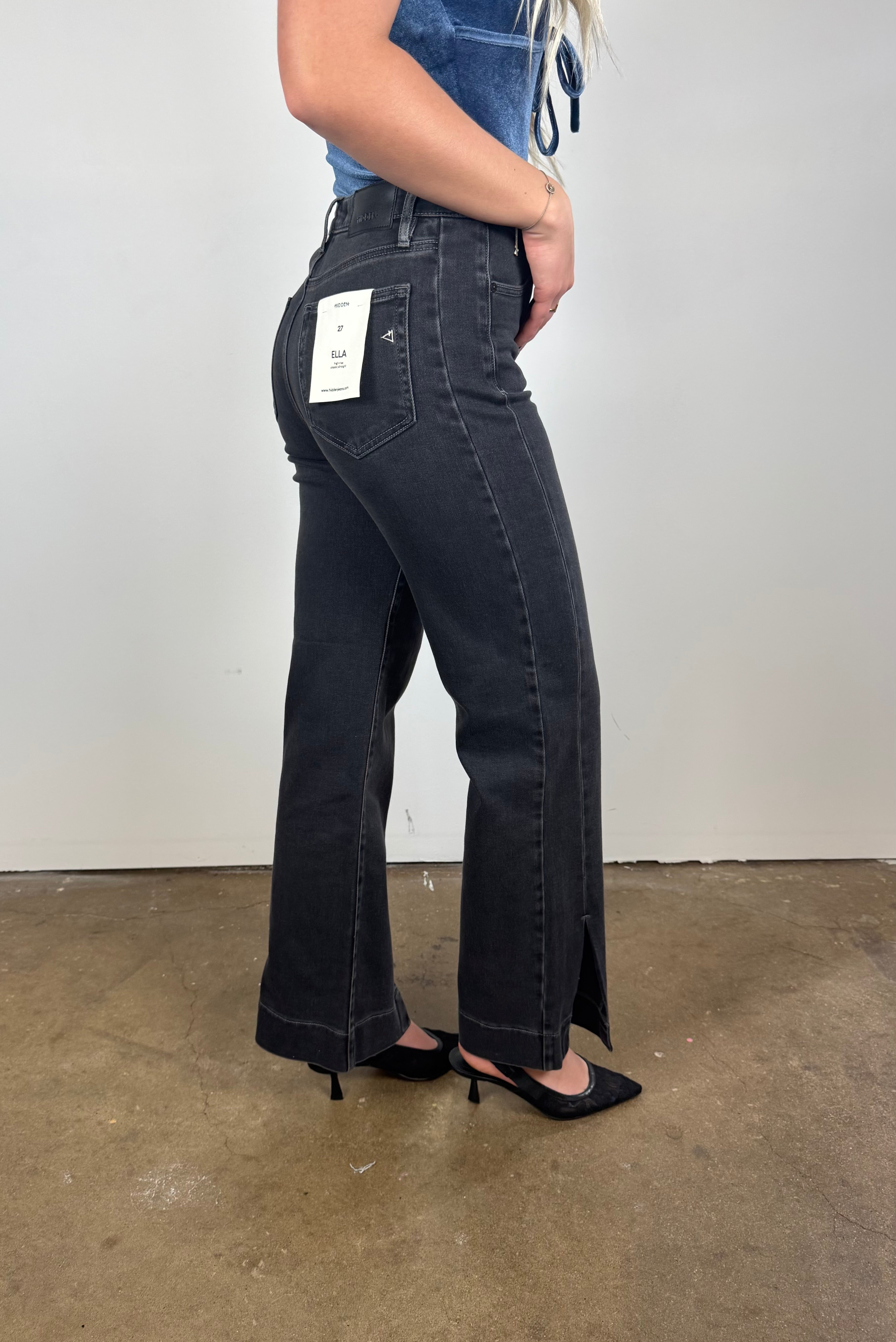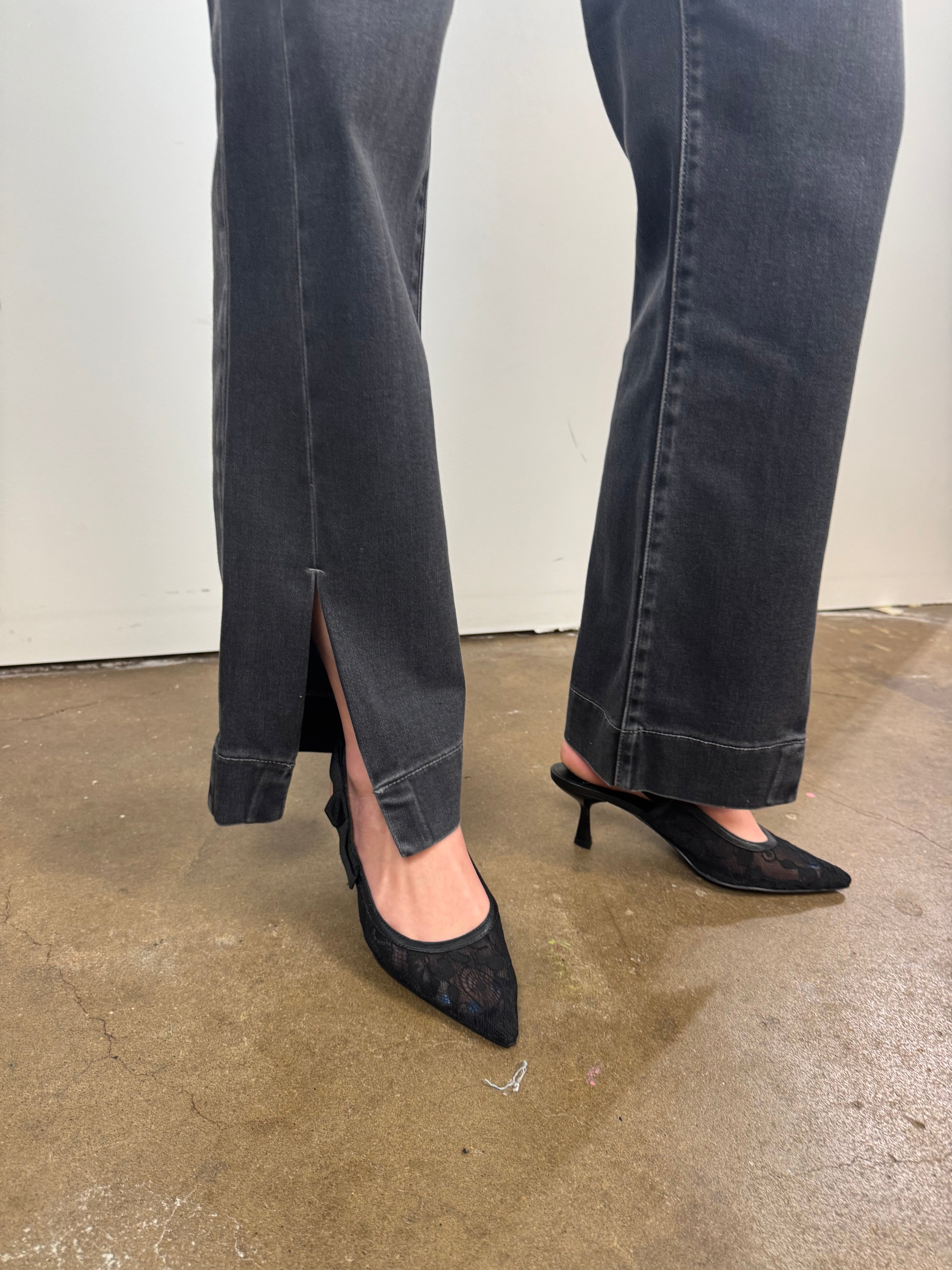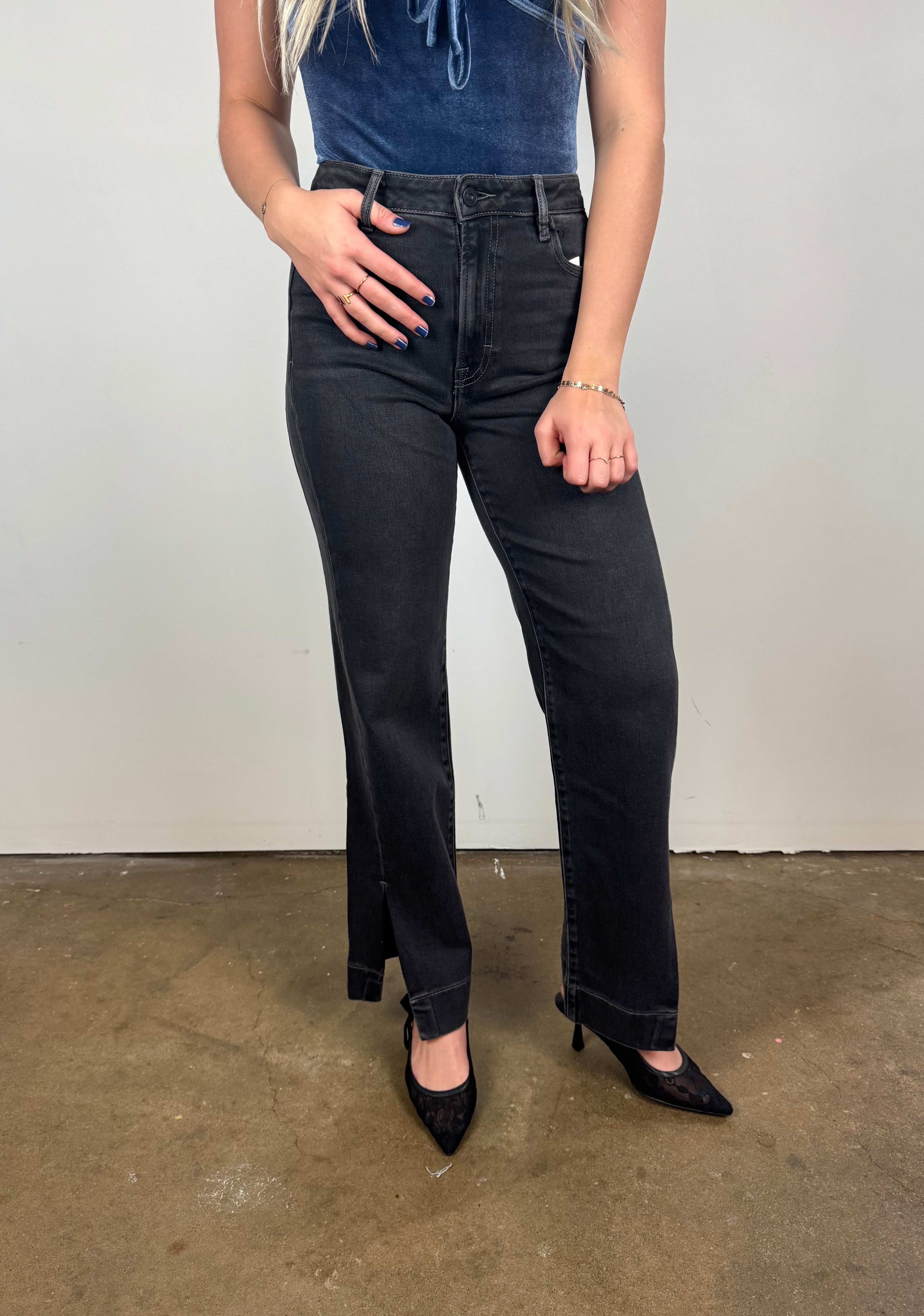 These washed-black straight leg jeans bring that perfect blend of structure and stretch, giving you a long, clean silhouette with a subtly edgy vibe. Designed with a flattering high rise and chic front slits, they elevate every outfit from daytime casual to dinner-ready polished.
