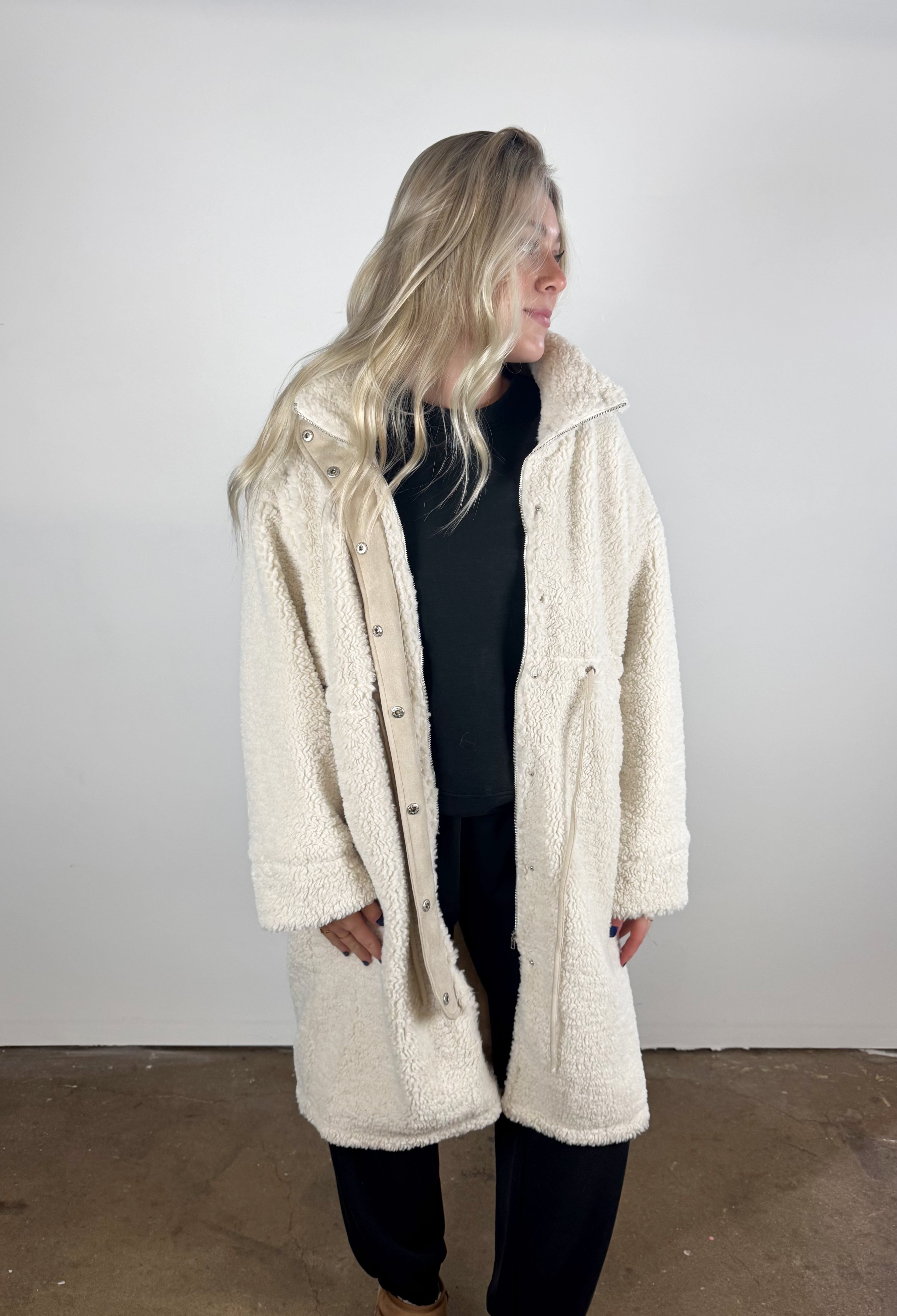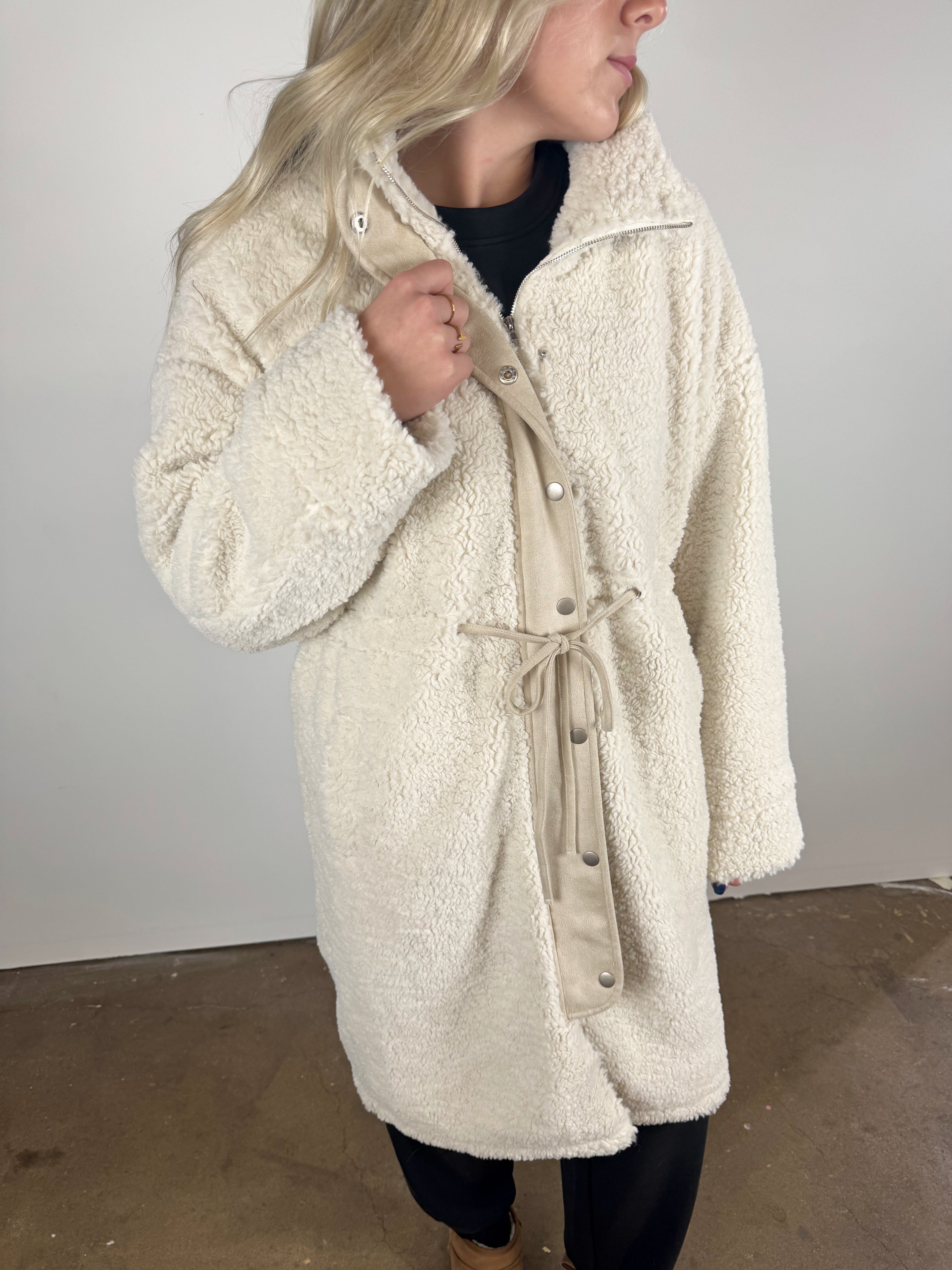 This long sherpa jacket wraps you in cloud-soft warmth with its plush texture and relaxed, easy silhouette. Finished with snap buttons and subtle drawstring details, it’s the perfect cold-weather layer for effortless, comfy-chic style.