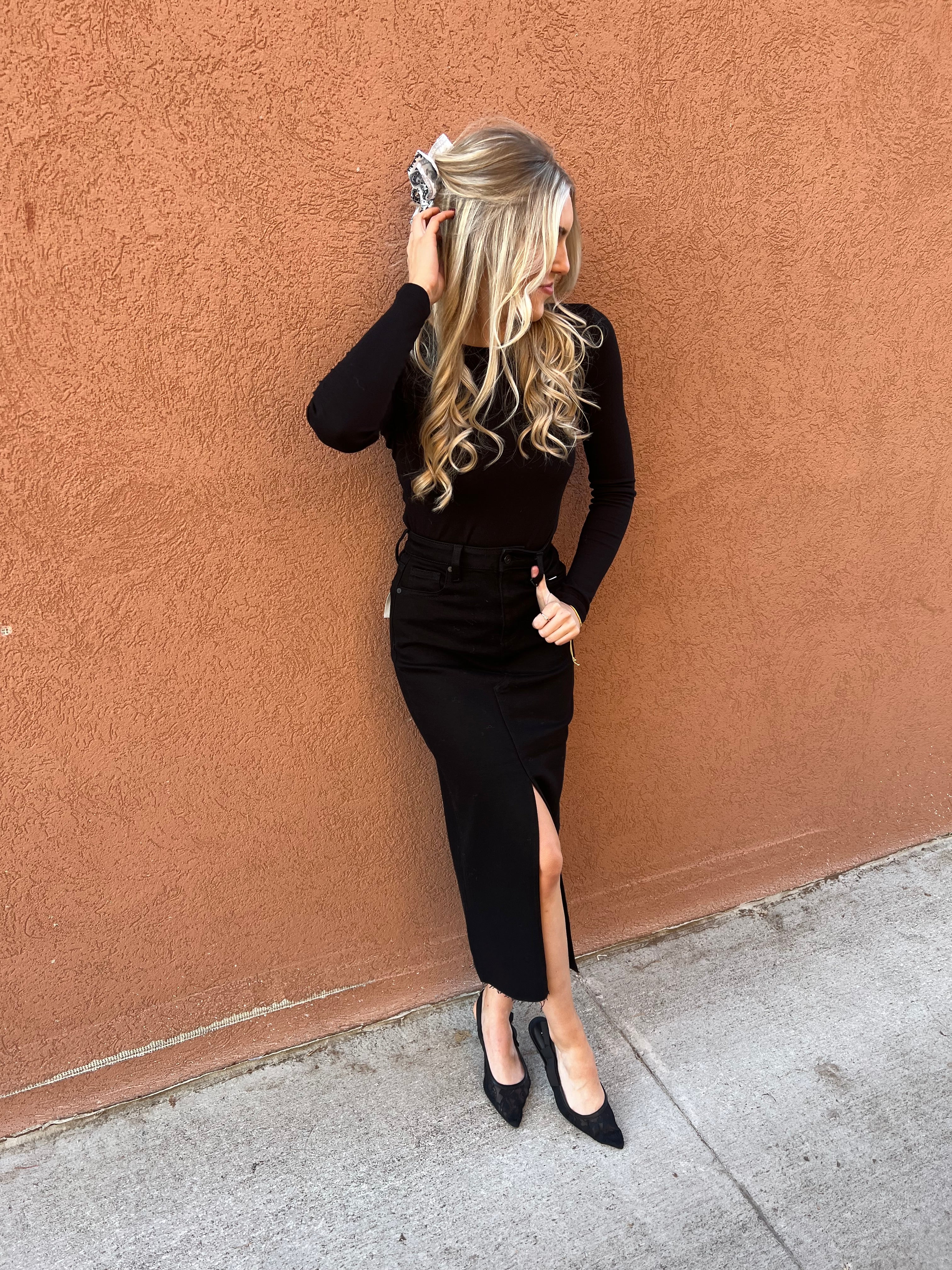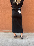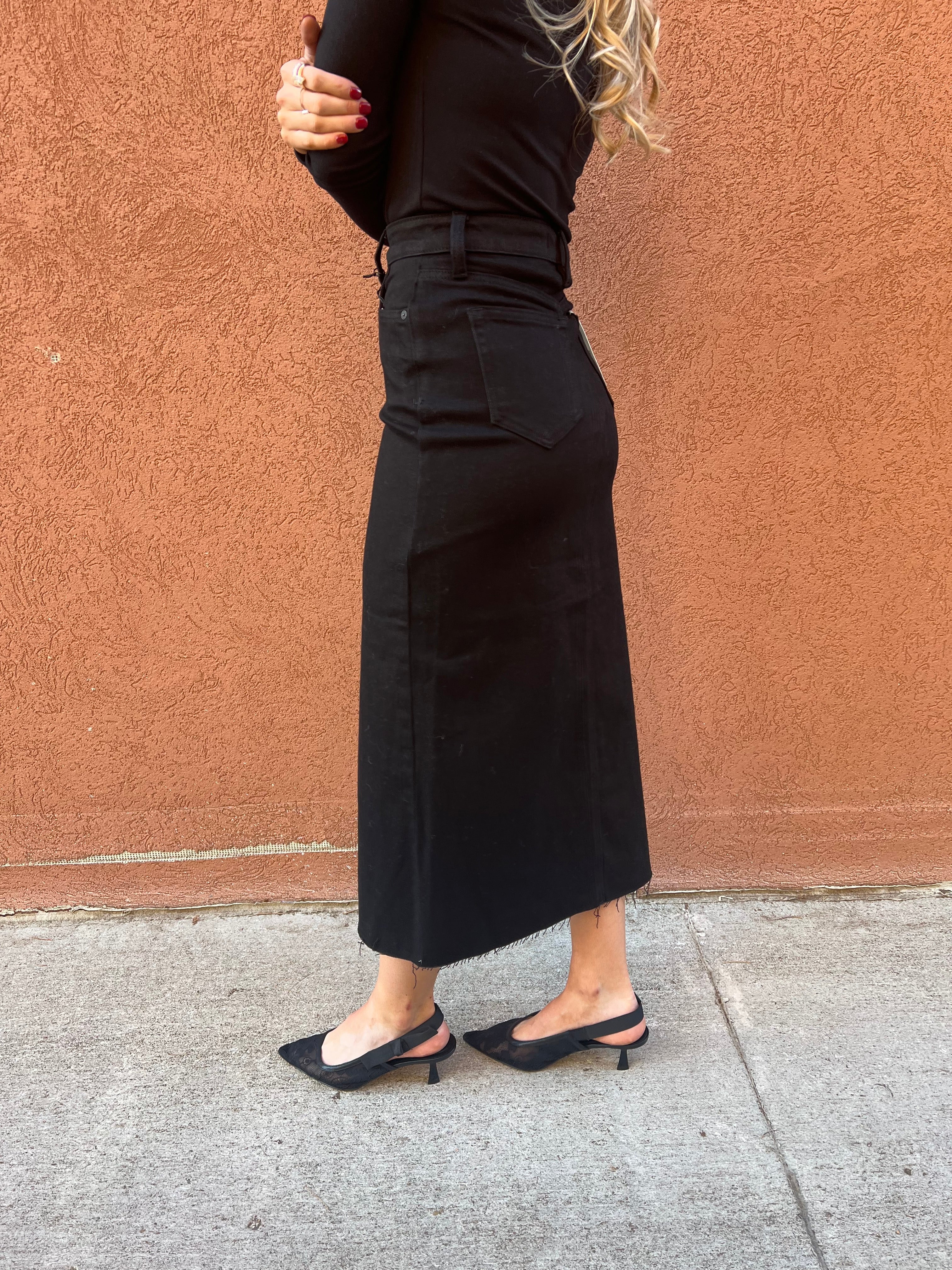 This black denim midi skirt is the perfect blend of chic structure and subtle edge. Designed with a flattering high-rise waist, it smooths and sculpts while still feeling comfortable and wearable. The straight silhouette creates that long, lean look, and the front slit adds just the right amount of movement and sass. Finished with a raw hem for an effortless touch, this skirt transitions seamlessly from daytime casual to a dressed-up night out. A timeless piece with major styling potential.