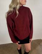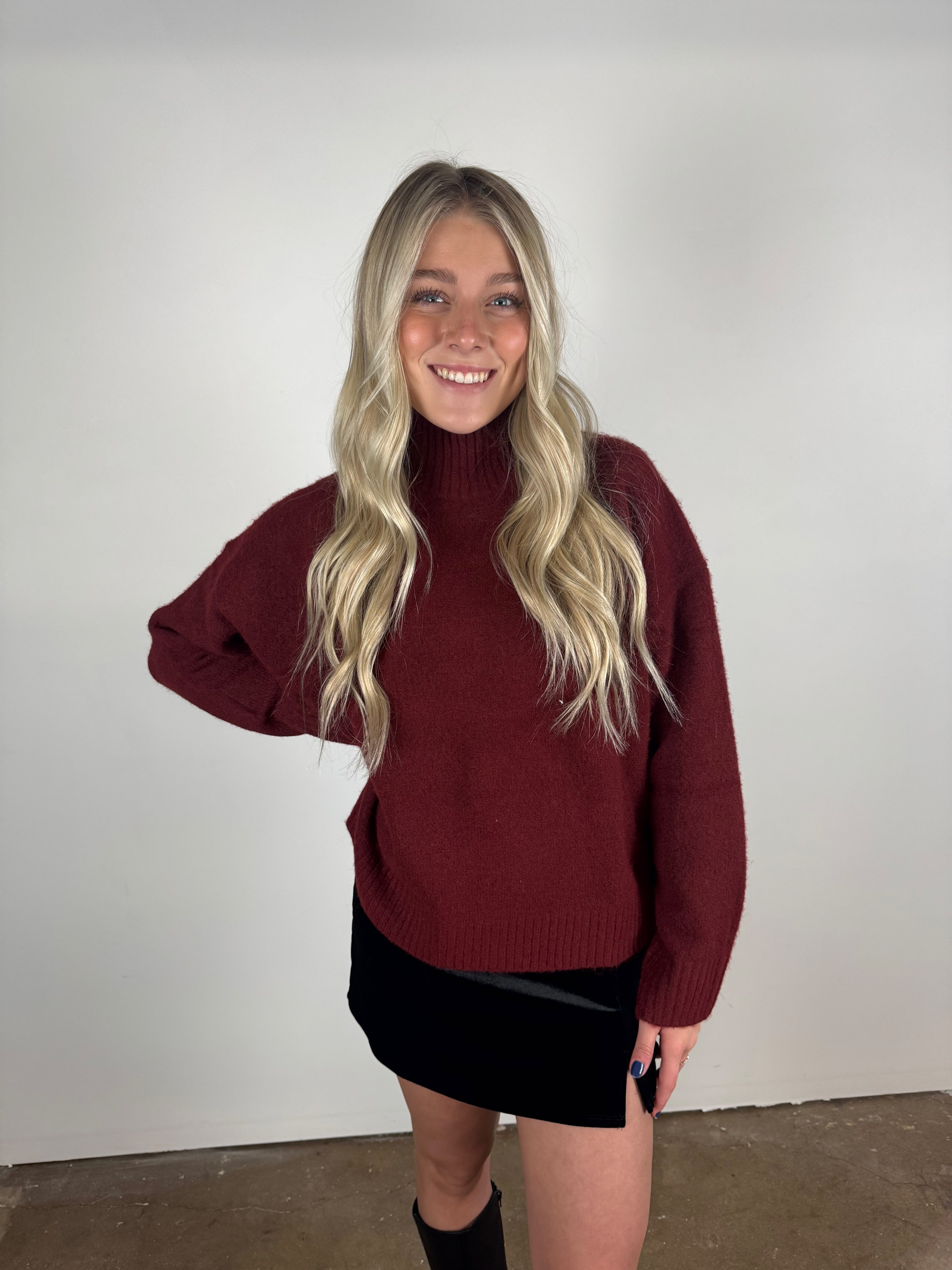 This rich burgundy turtleneck sweater brings effortless elegance to cooler days. With its soft knit, relaxed silhouette, and timeless color, it instantly elevates any outfit—from skirts and boots to your favorite denim—making it a must-have staple for fall and winter wardrobes.