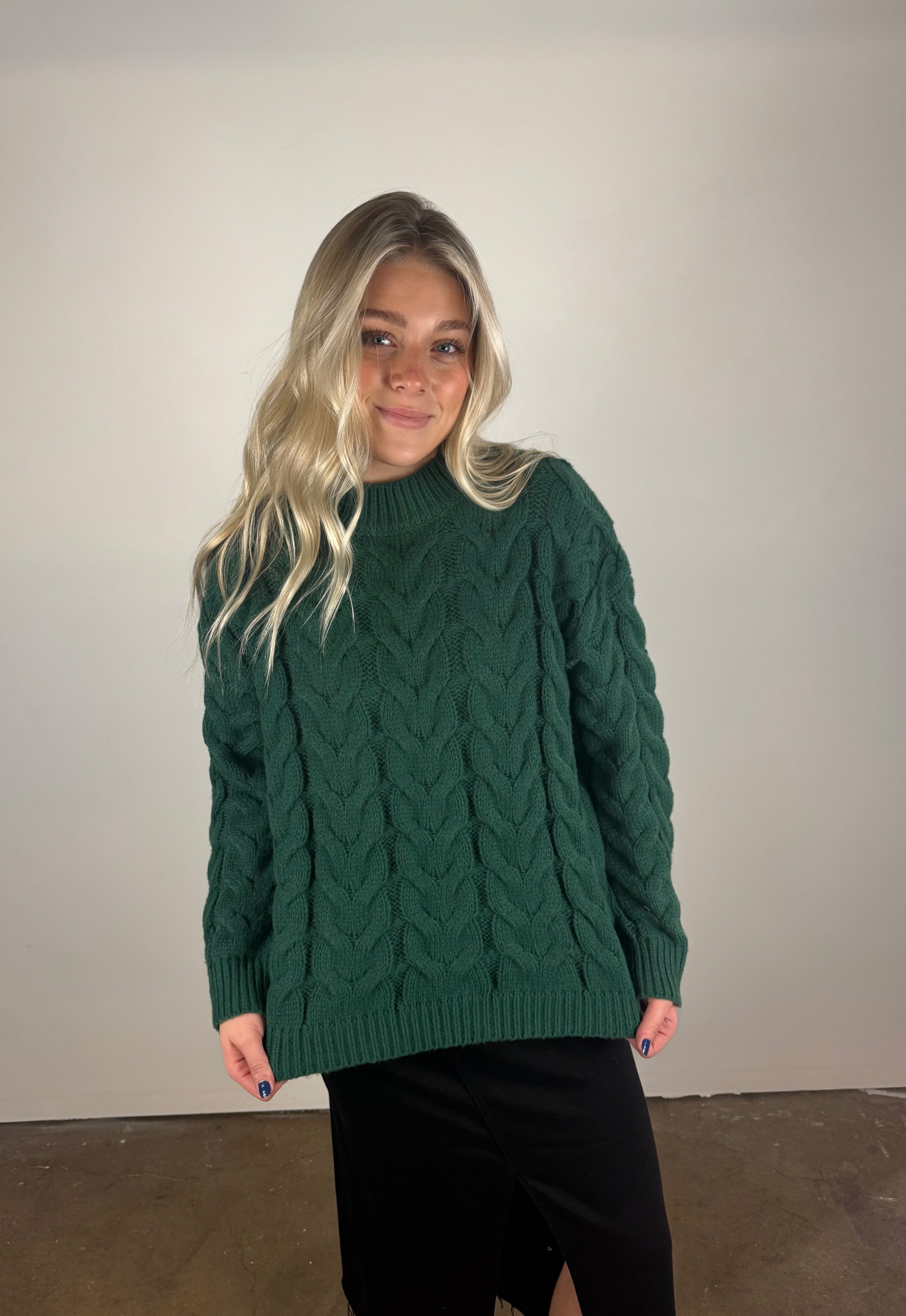 Add this stunning emerald cable-knit to your winter lineup—cozy, classic, and guaranteed to be your new favorite sweater!