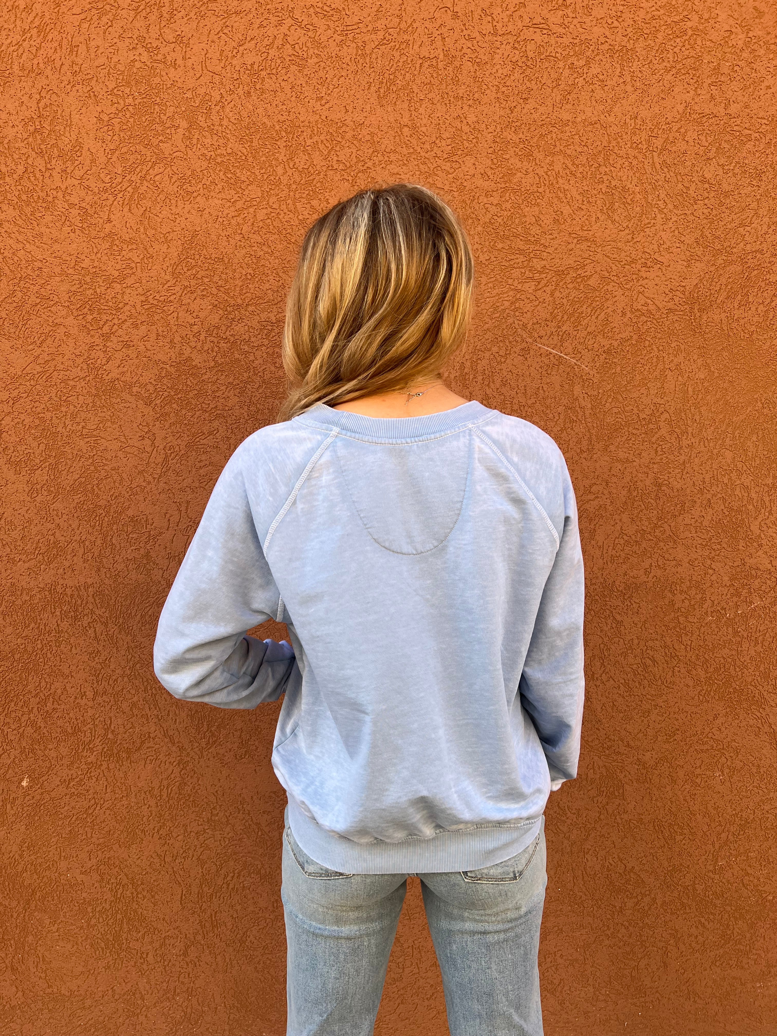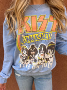 Turn up the nostalgia with this bold KISS crewneck-perfect for every rock moment. Featuring a classic band graphic on a soft, washed-blue backdrop, this relaxed fit sweatshirt brings effortless edge and comfort together. It’s slightly oversized cut and lived-in feel make it a go-to for laid-back days, concerts, or styling with your favorite denim.