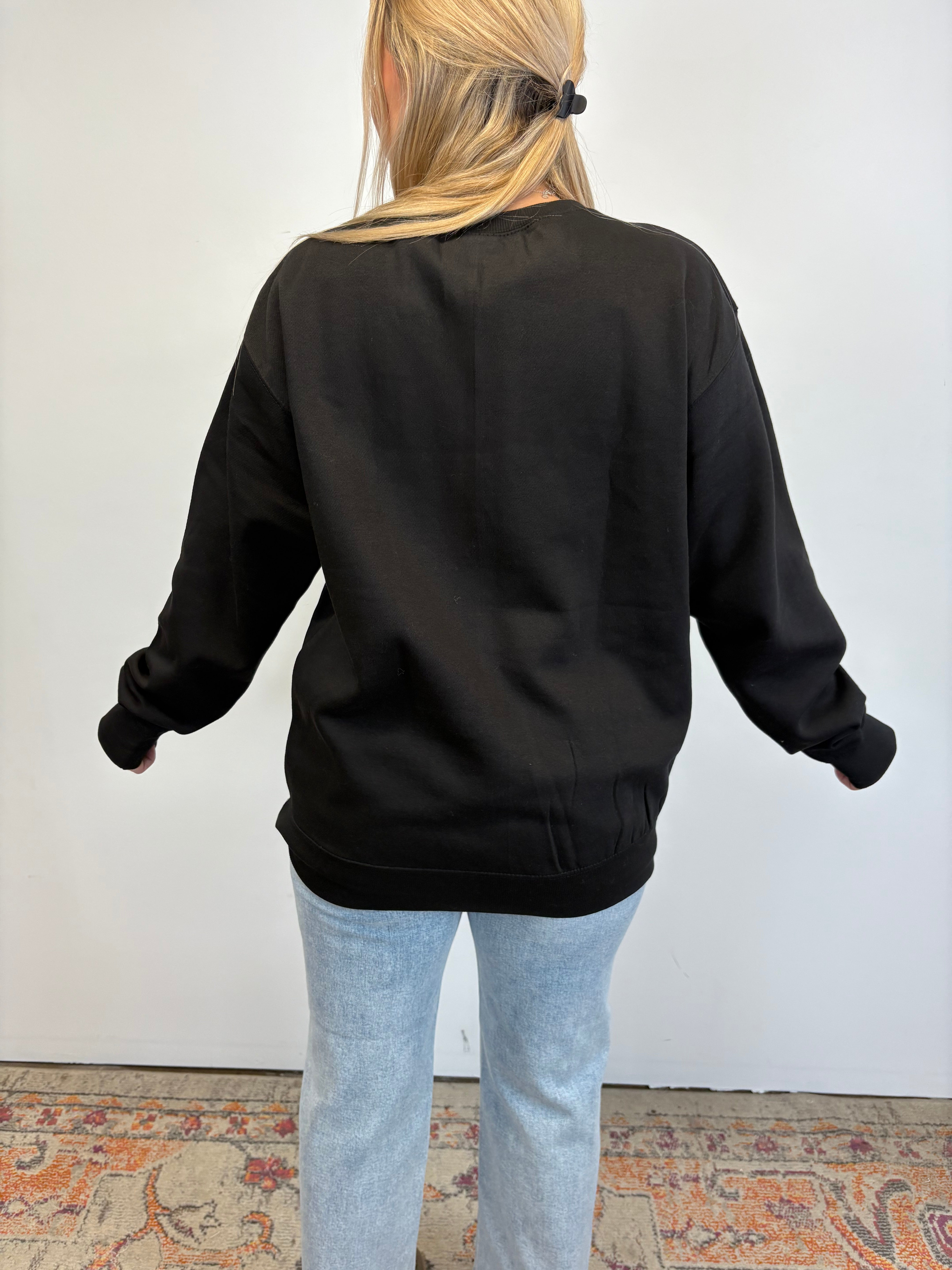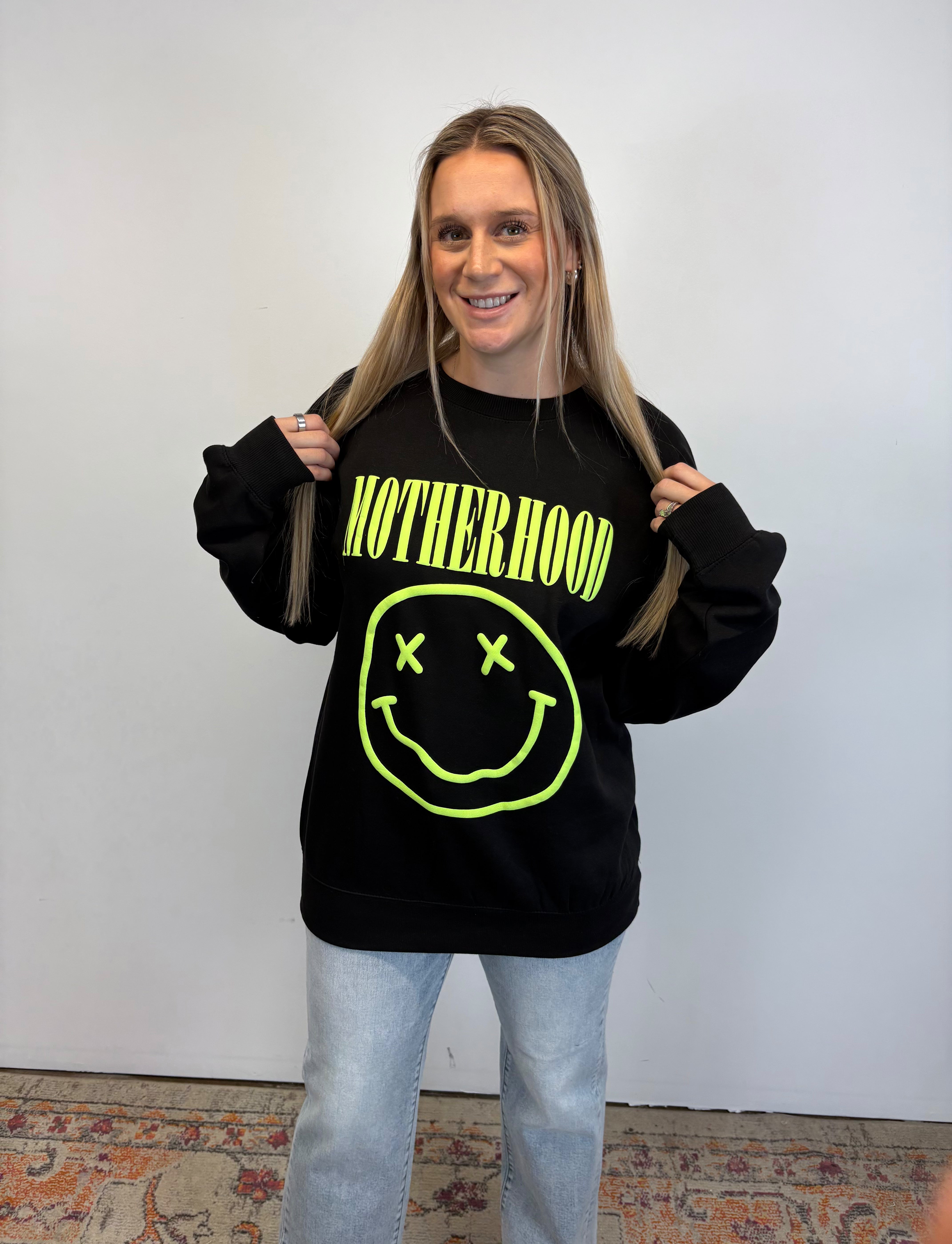 This oversized black graphic sweatshirt brings all the fun with a bright neon “Motherhood” smiley that makes a statement. Cozy, relaxed, and effortlessly cool, it’s the perfect throw-on layer for busy days, coffee runs, and mom life on repeat.