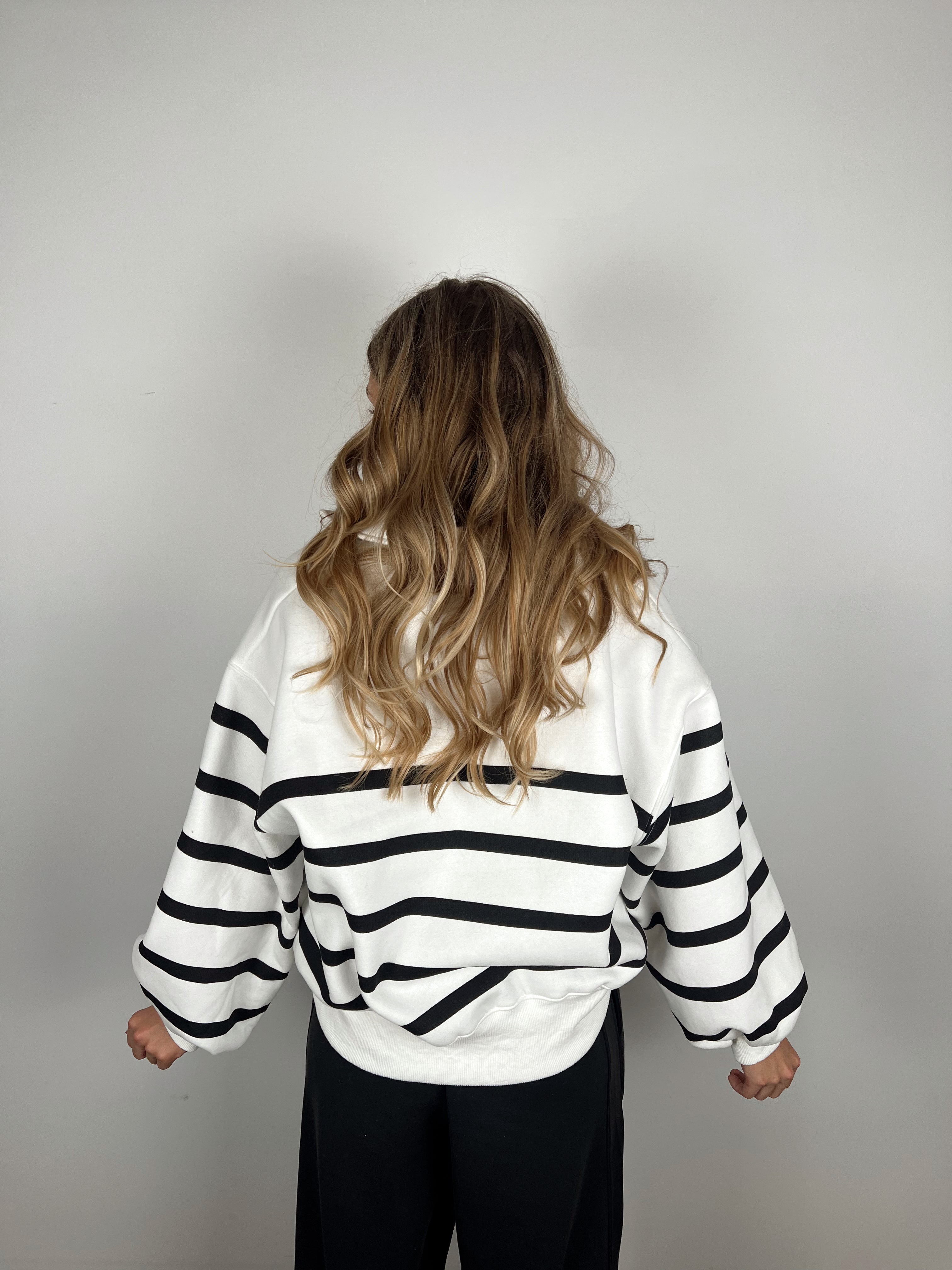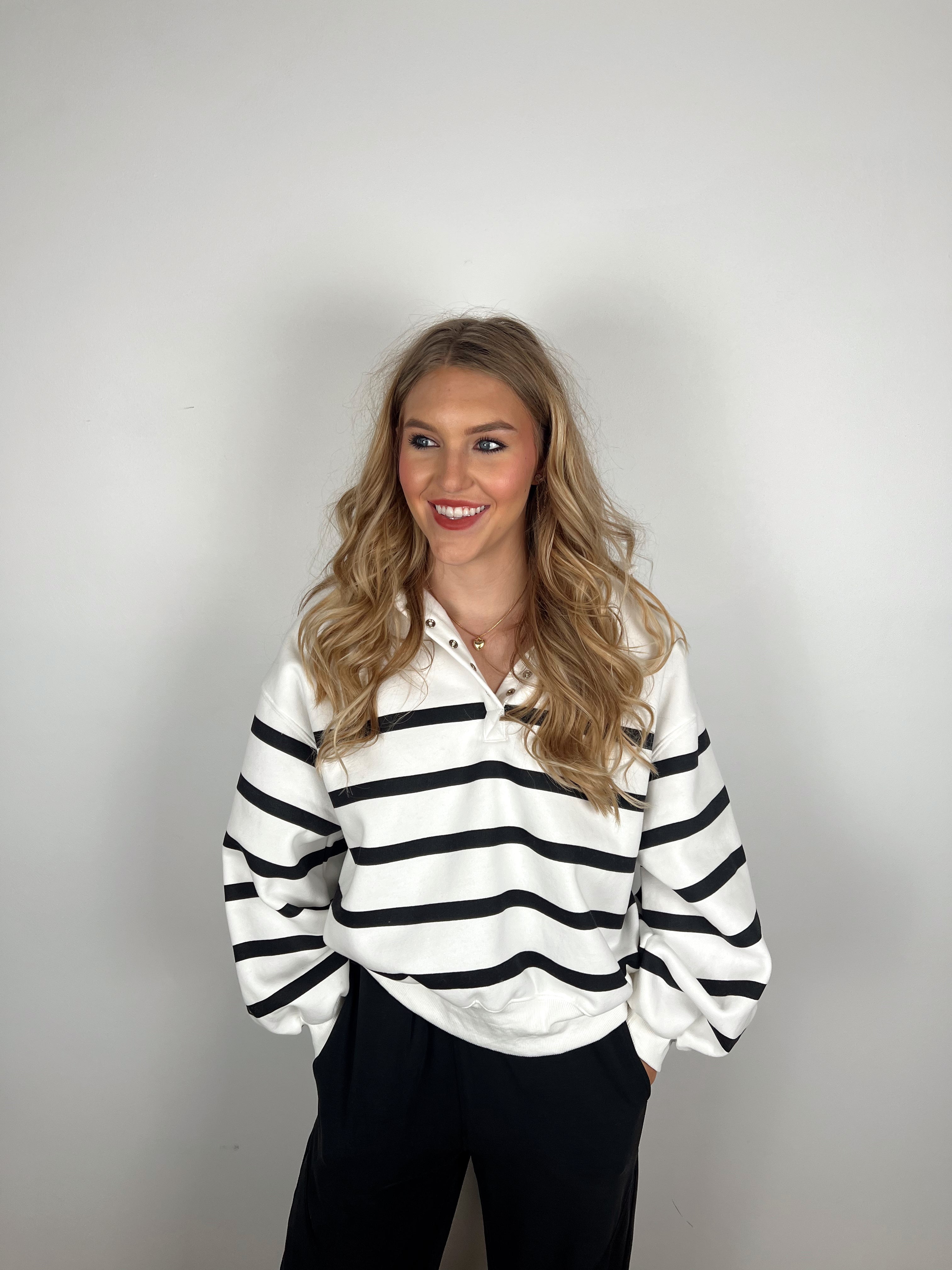 This striped pullover brings effortless cool to your casual wardrobe. With its relaxed fit and classic black-and-white stripes, it’s the perfect blend of sporty and chic. The collared neckline with snap buttons adds a polished touch, while the soft fabric keeps it comfy all day long. Whether you’re running errands or heading out for weekend plans, this pullover nails that laid-back yet put-together look every time.