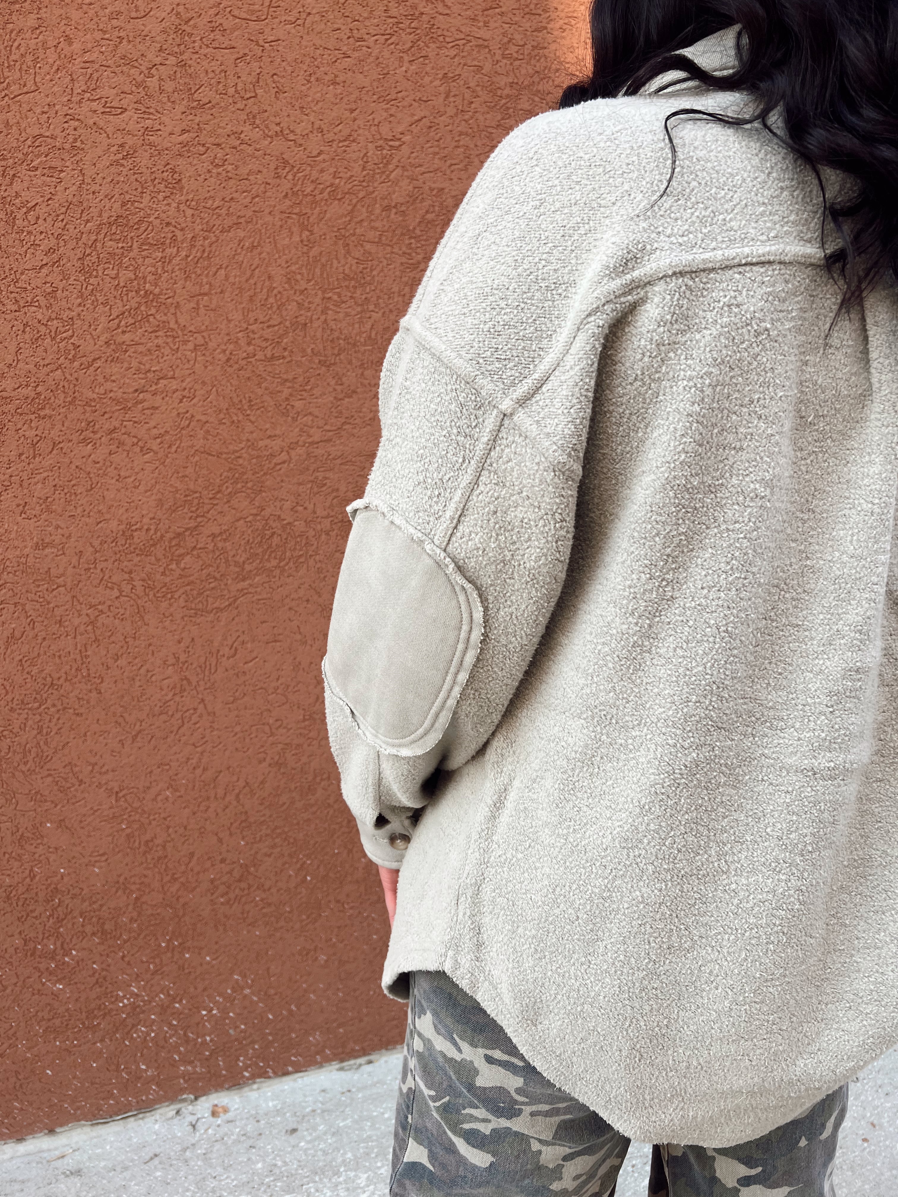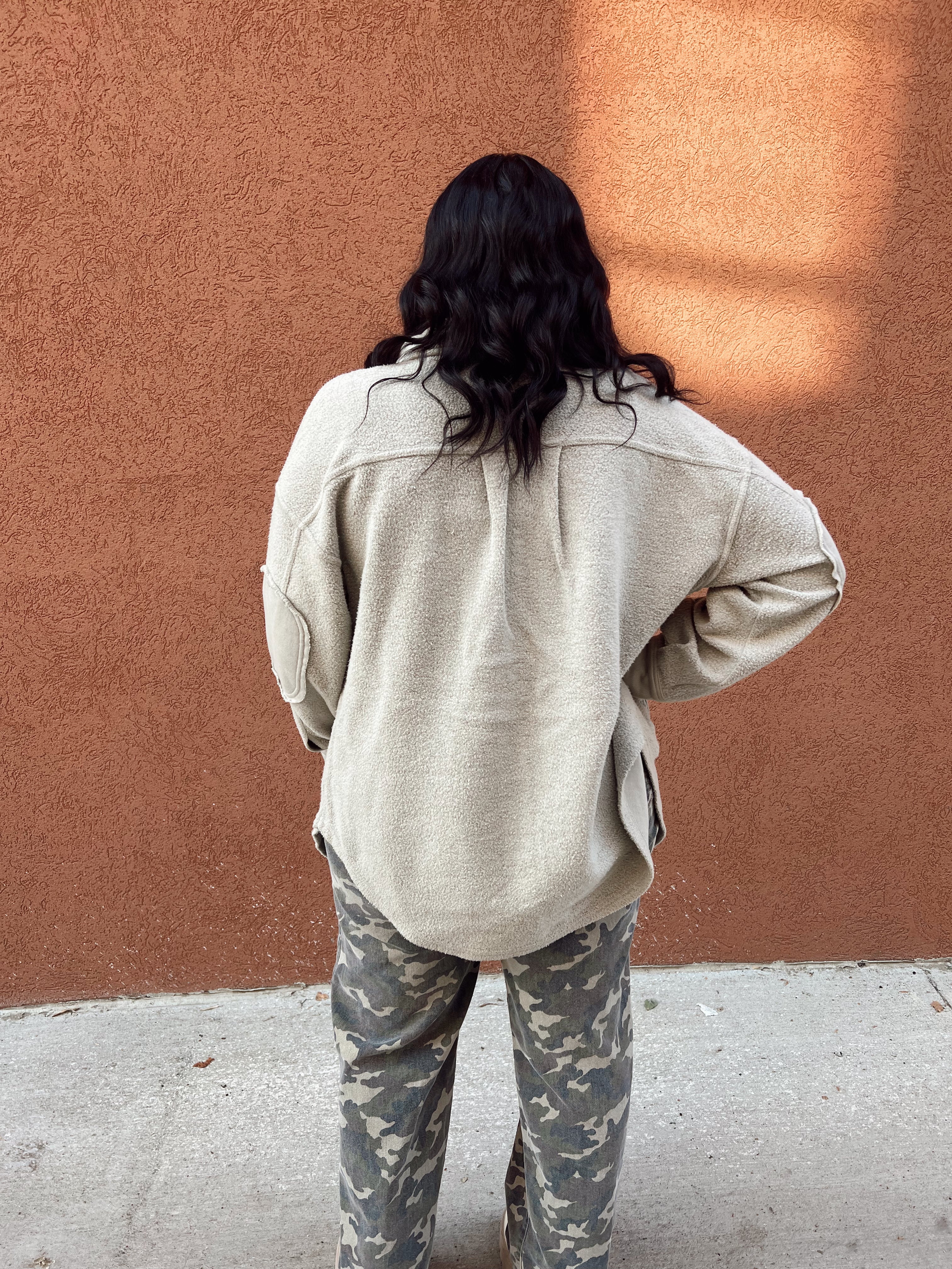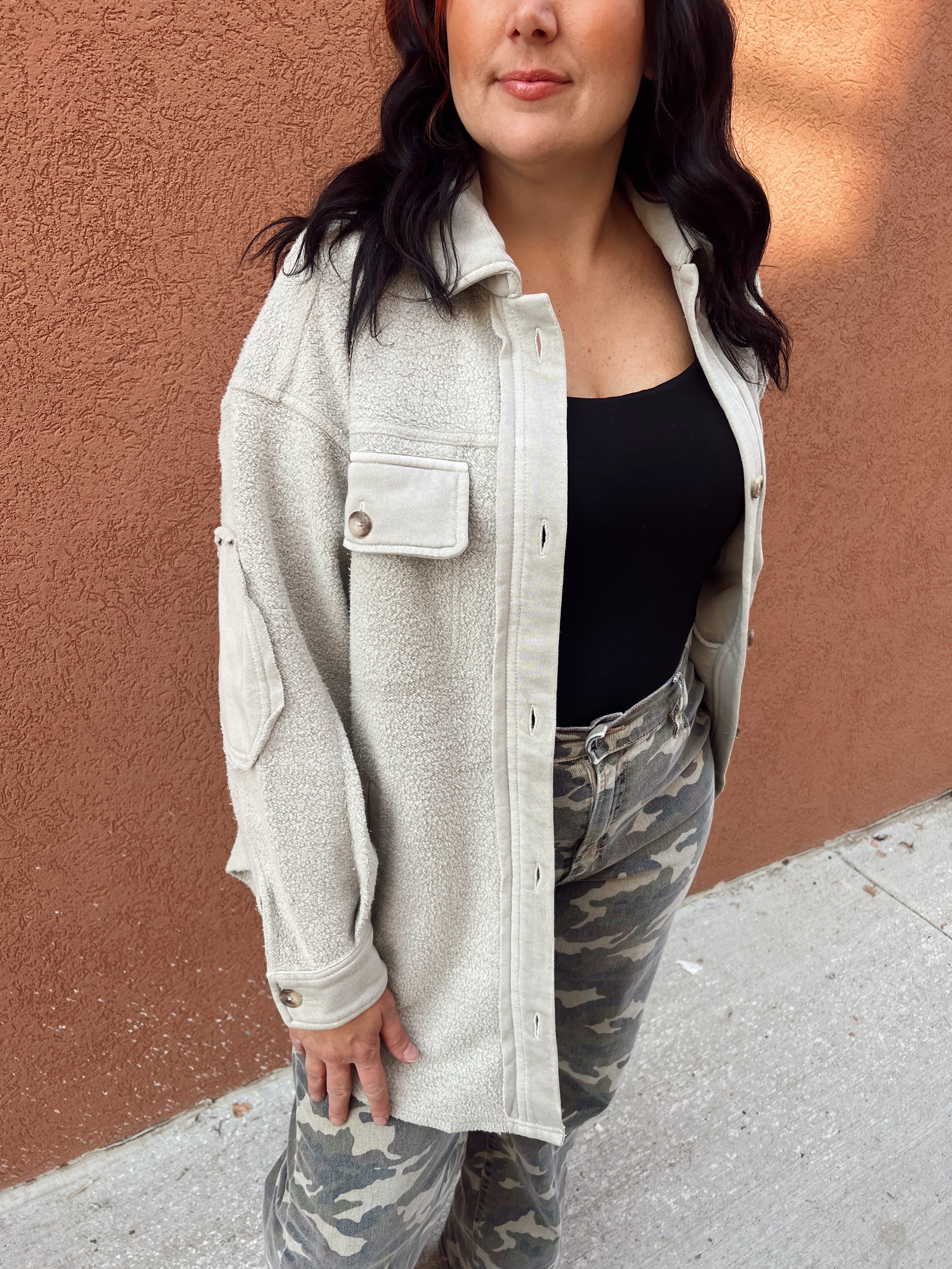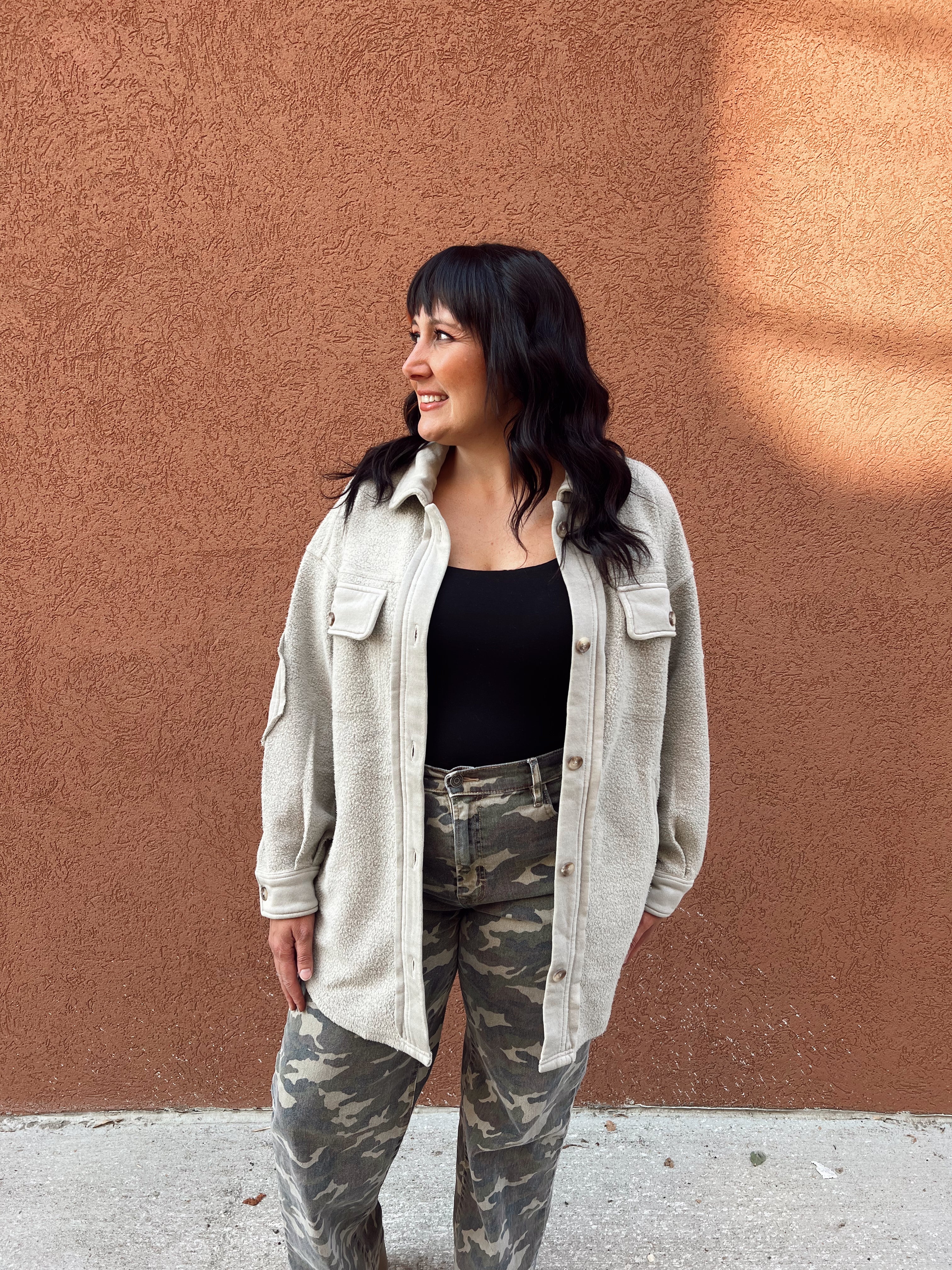 The ultimate blend of shirt-meets-jacket, this neutral shacket is your go-to for fall and beyond. Designed in a soft, cozy fabric with a relaxed fit, it's perfect for throwing on over tees, bodysuits, or lightweight sweaters. Featuring button-front styling, chest pockets, and an easy hip-length cut, this versatile piece pairs effortlessly with denim, leggings, or even camo for a cool, laid-back vibe.