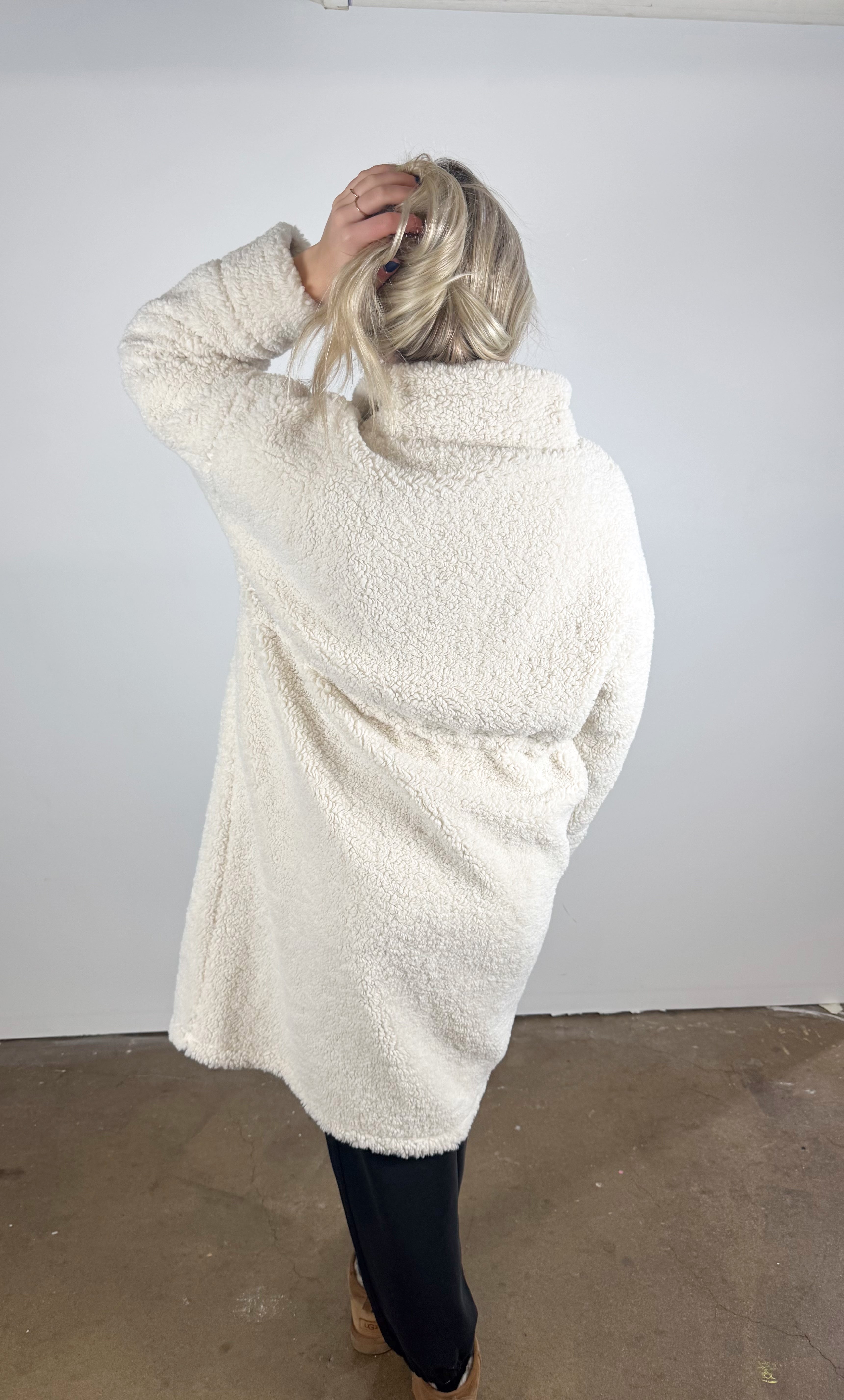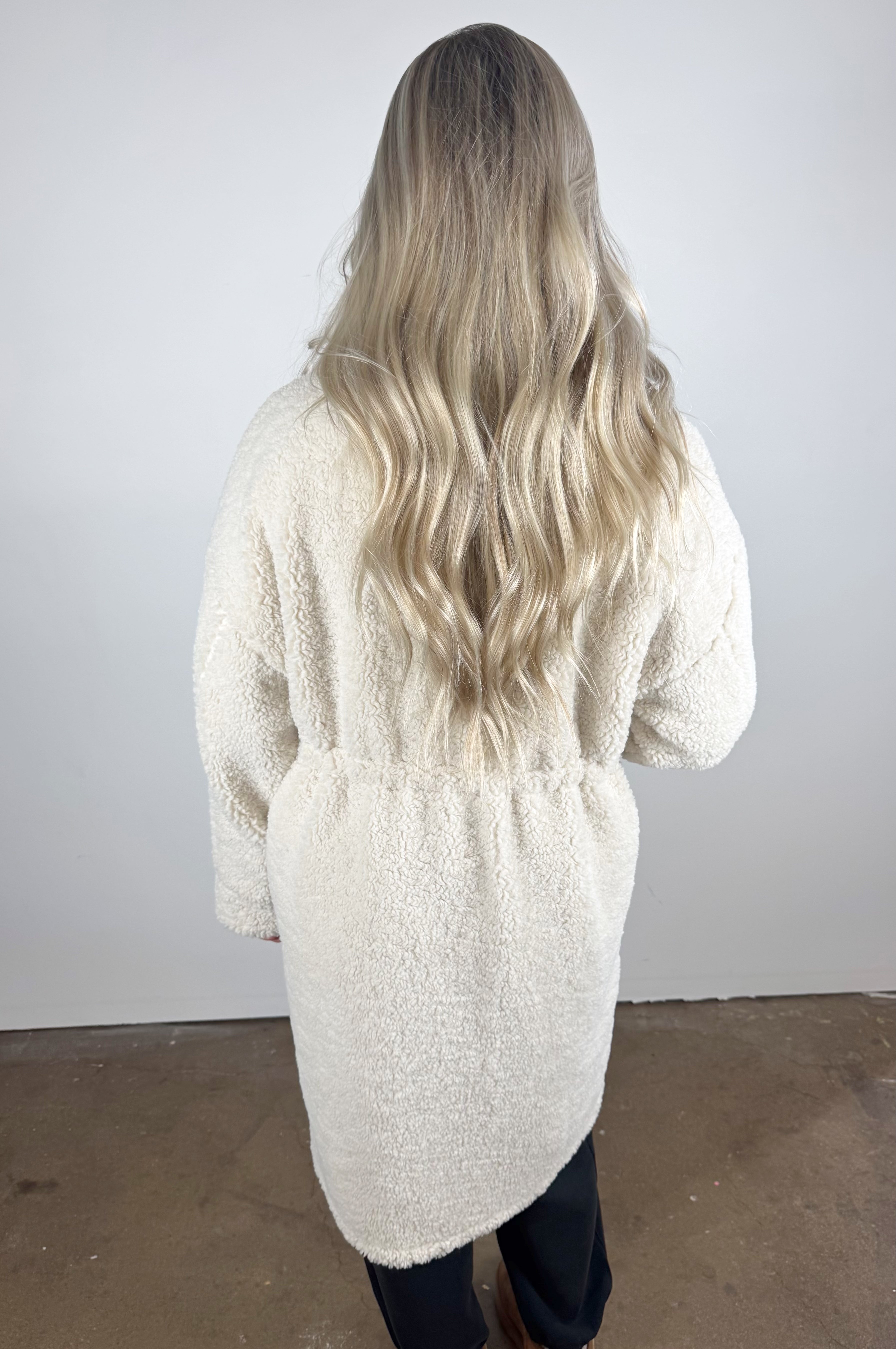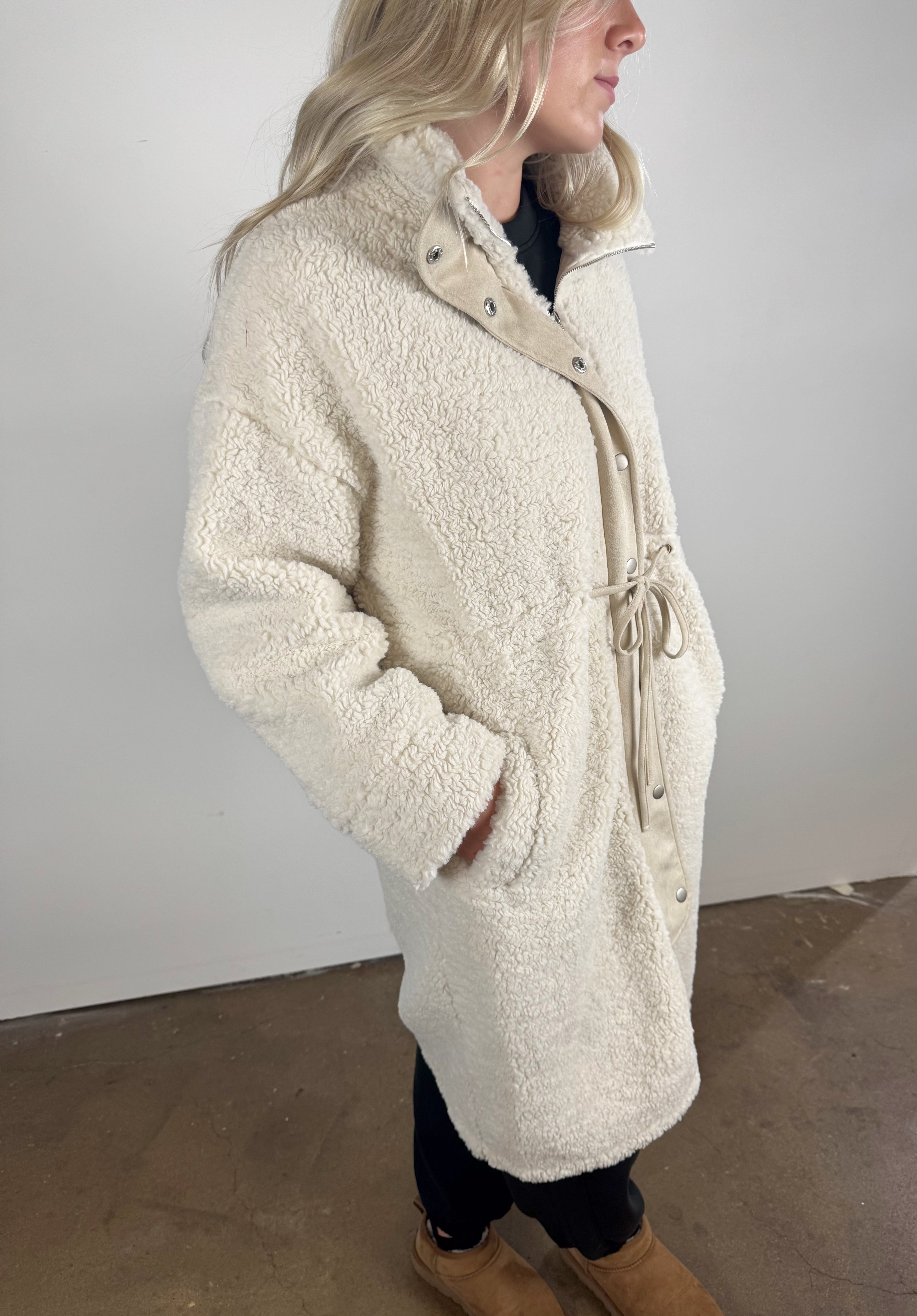 This long sherpa jacket wraps you in cloud-soft warmth with its plush texture and relaxed, easy silhouette. Finished with snap buttons and subtle drawstring details, it’s the perfect cold-weather layer for effortless, comfy-chic style.