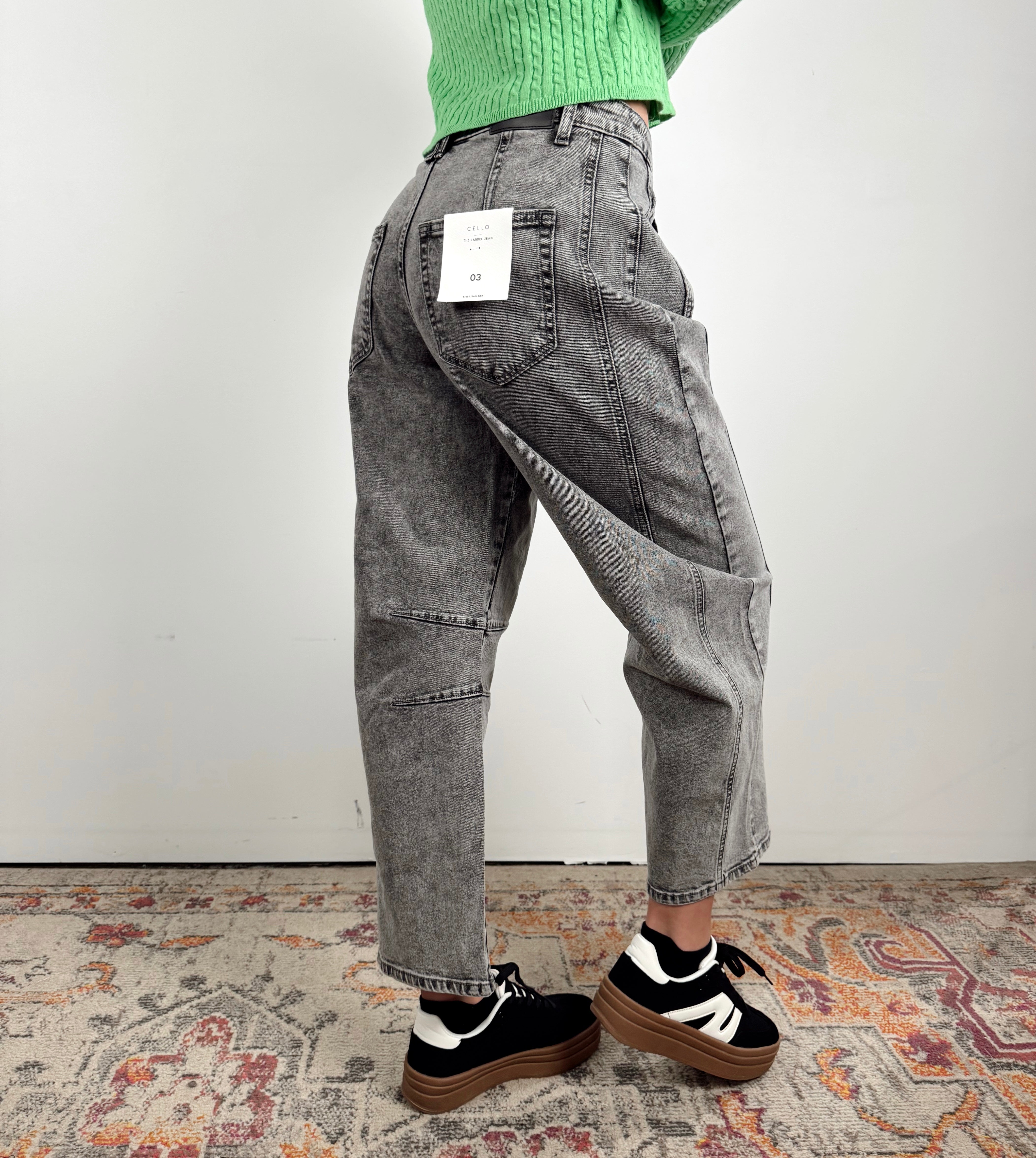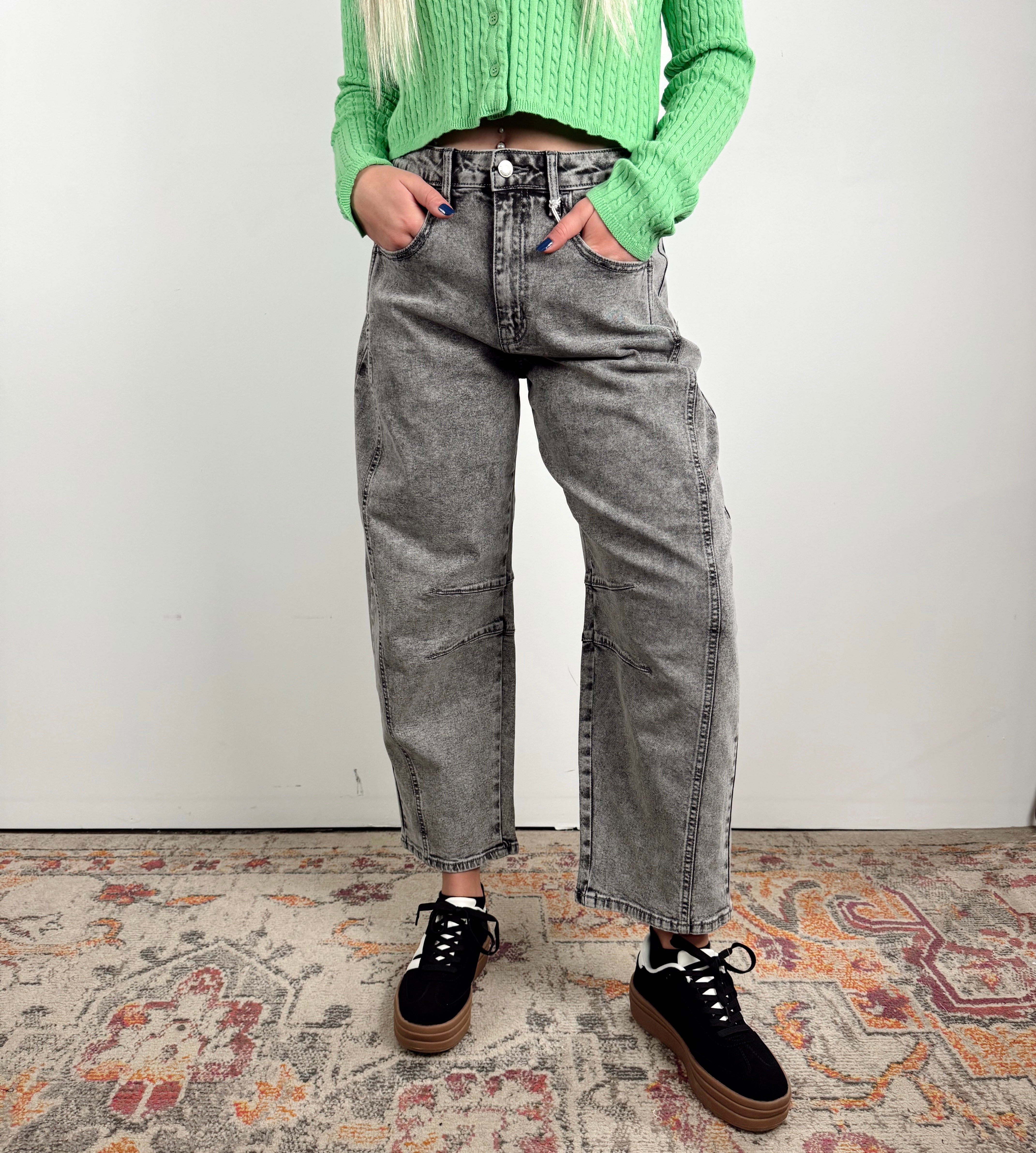 These gray wash barrel jeans bring the perfect mix of cool and comfort. Designed with a relaxed, curved leg silhouette and a high-rise fit, they give off that laid-back, street-style vibe while still feeling polished enough for everyday wear. A must-have denim refresh for your closet.