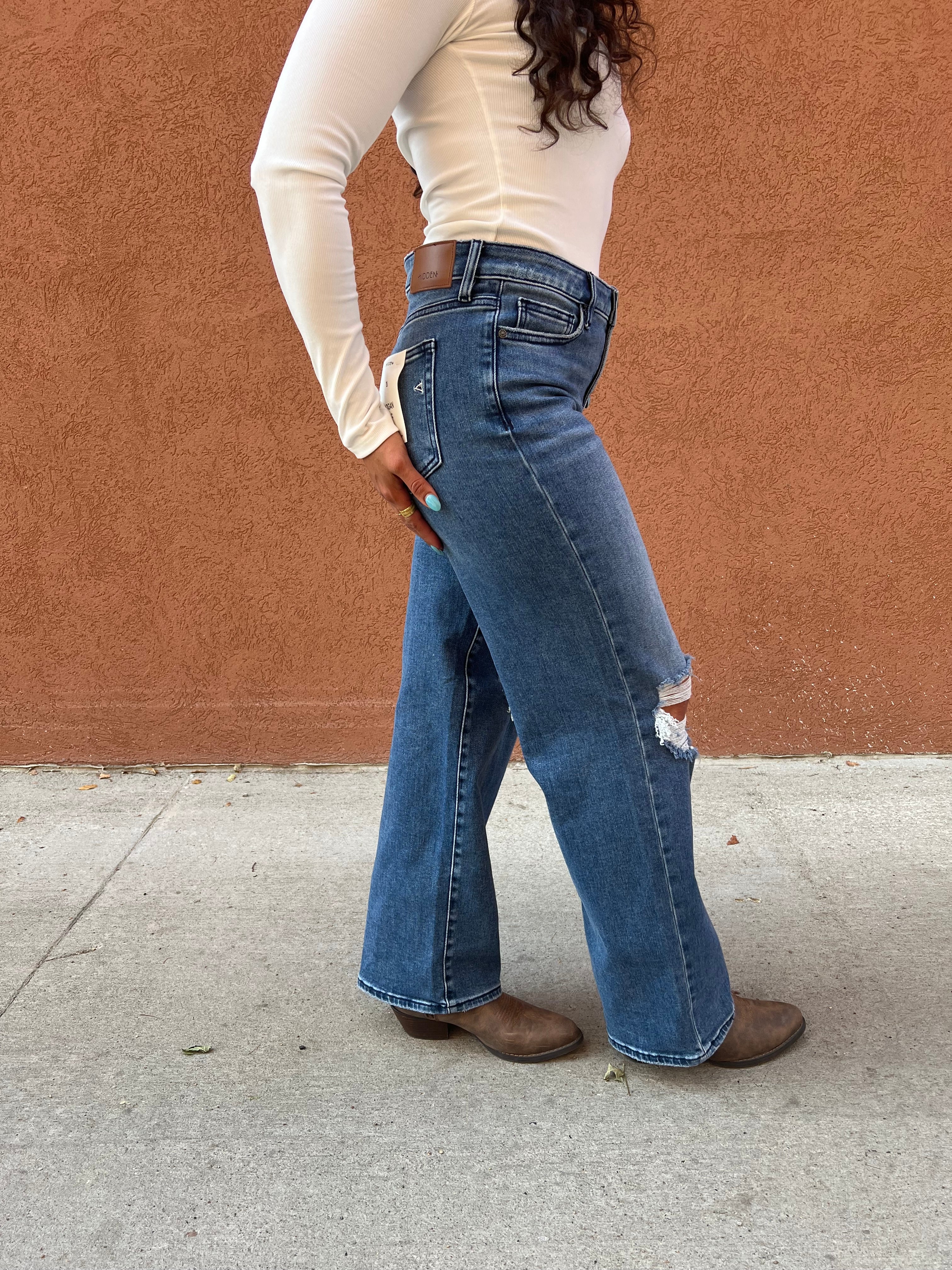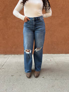 These laid-back dad jeans bring the perfect mix of relaxed vibes and everyday style. Featuring a mid-wash denim with distressed knees, a straight leg fit, and a comfortable mid-rise, they're made for effortless off-duty looks. Pair them with sneakers and a crop tank for a casual day out, or dress them up with a blazer and booties for an easy street-style moment.
