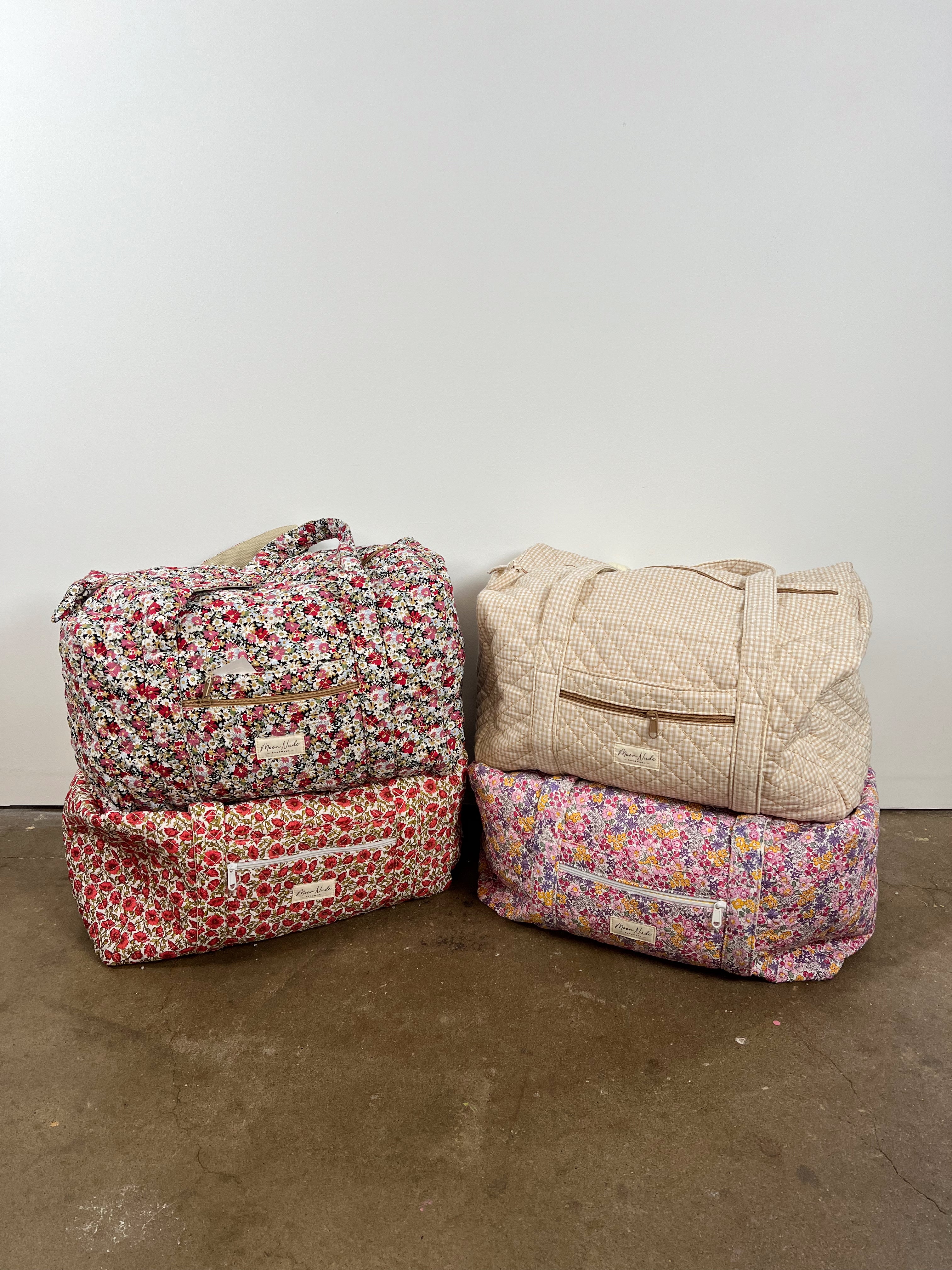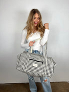 Your new favorite travel buddy is here! This black-and-white gingham duffel is the perfect mix of cute, functional, and effortlessly stylish. The quilted body keeps it soft and lightweight, while the oversized shape gives you all the space you need for weekend trips, gym days, baby essentials, or everyday hauling.