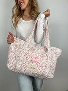 Say hello to your new everyday grab-and-go tote! This quilted floral bag is soft, lightweight, and unbelievably roomy—perfect for tossing in all the things without feeling bulky. The sweet blush floral print and pretty bow detail make it feminine and fun, while the long padded straps keep it comfy on the shoulder.
