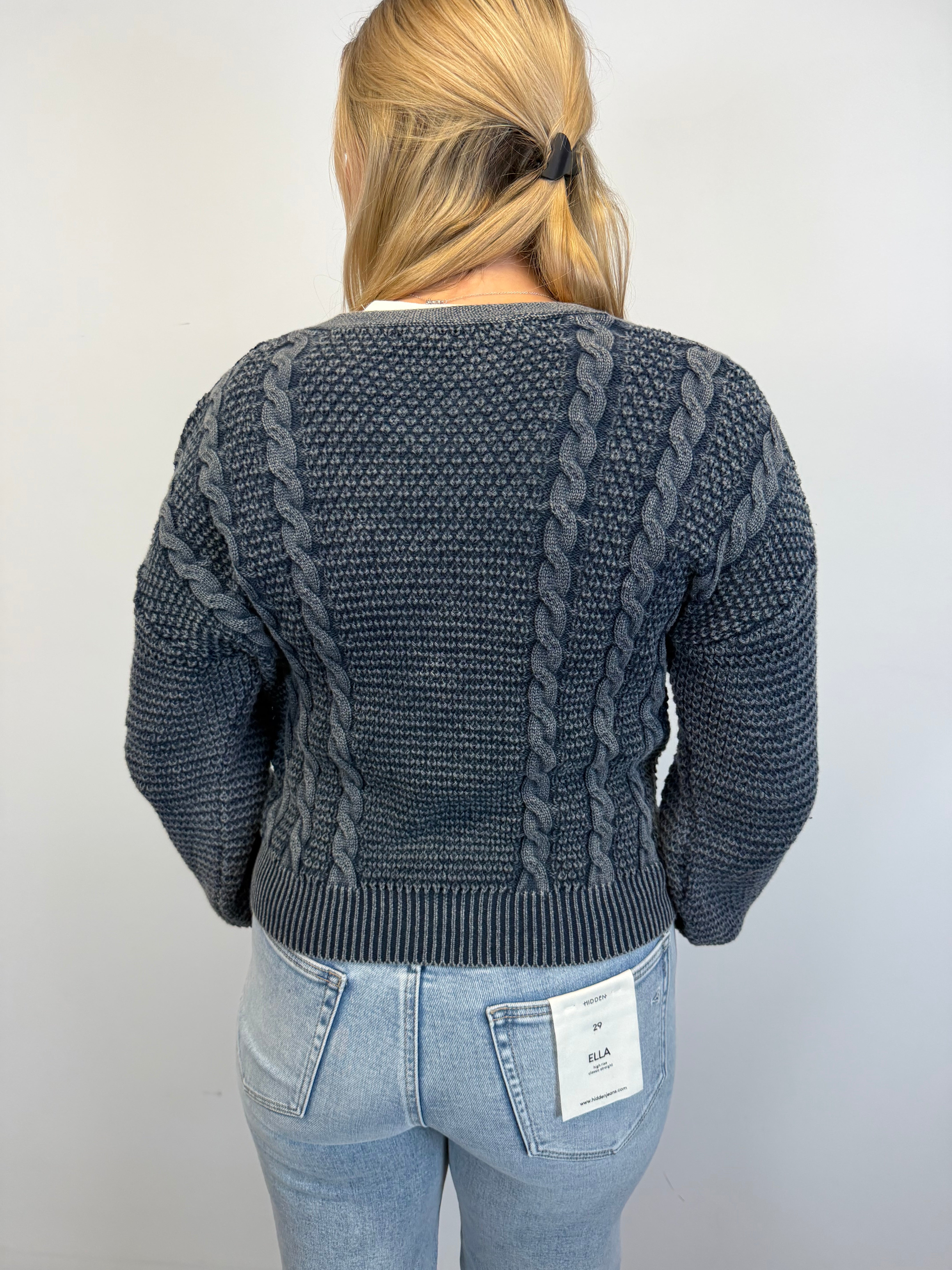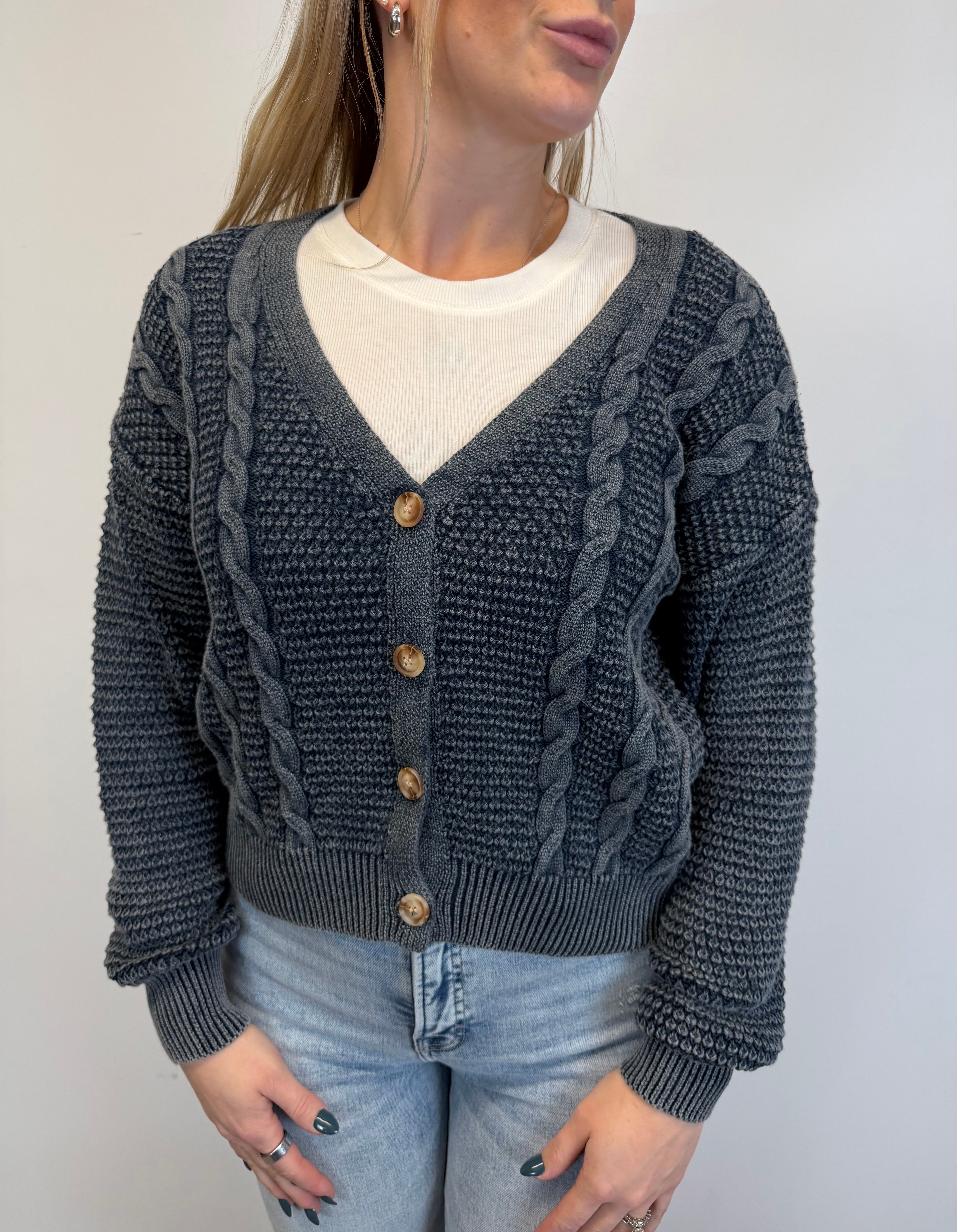 This textured knit cardigan features timeless cable detailing, a flattering V-neckline, and functional button front for easy layering. Soft and versatile, it’s the perfect throw-on piece to elevate your everyday denim or layer over tees and tanks year-round.