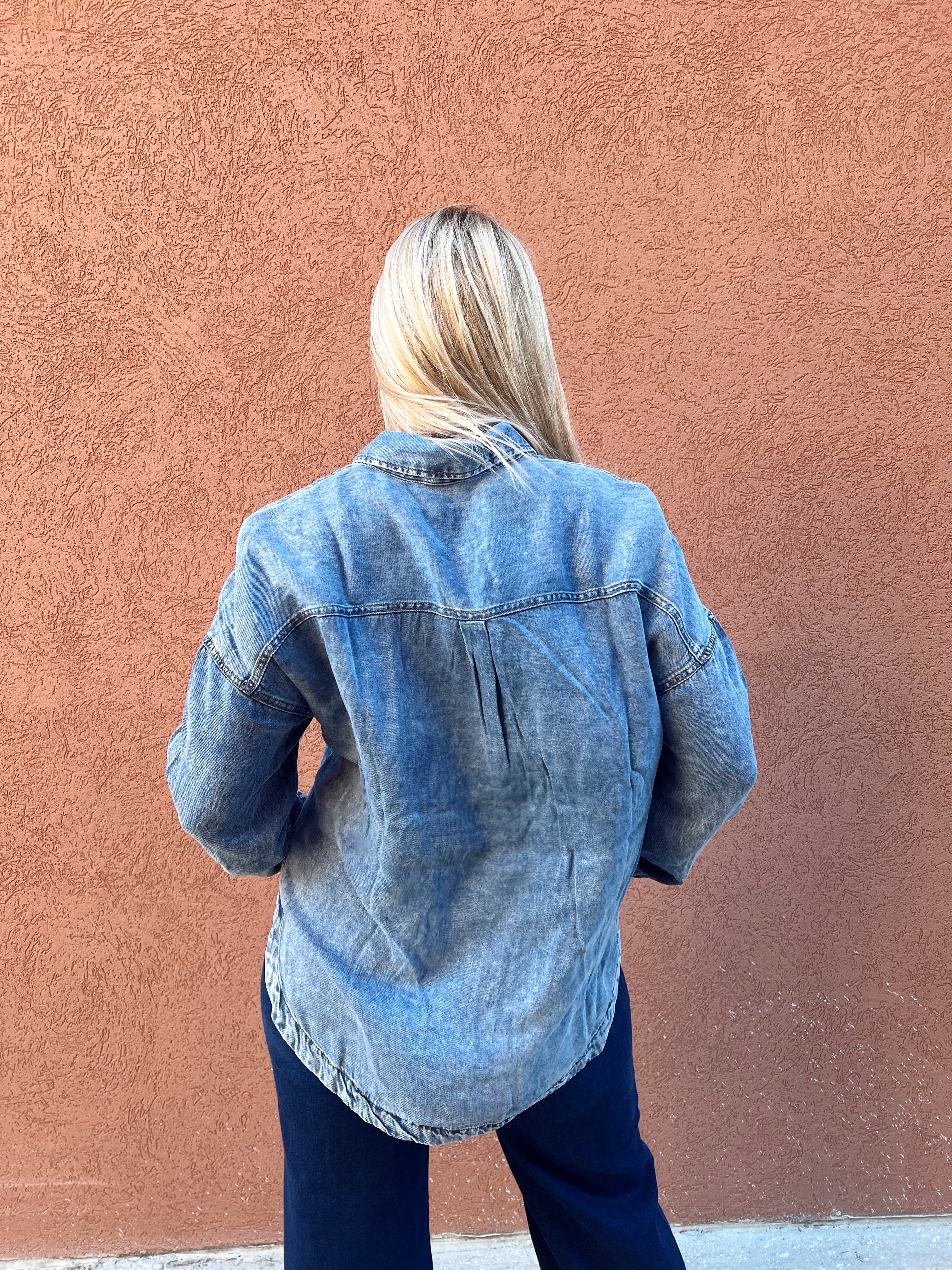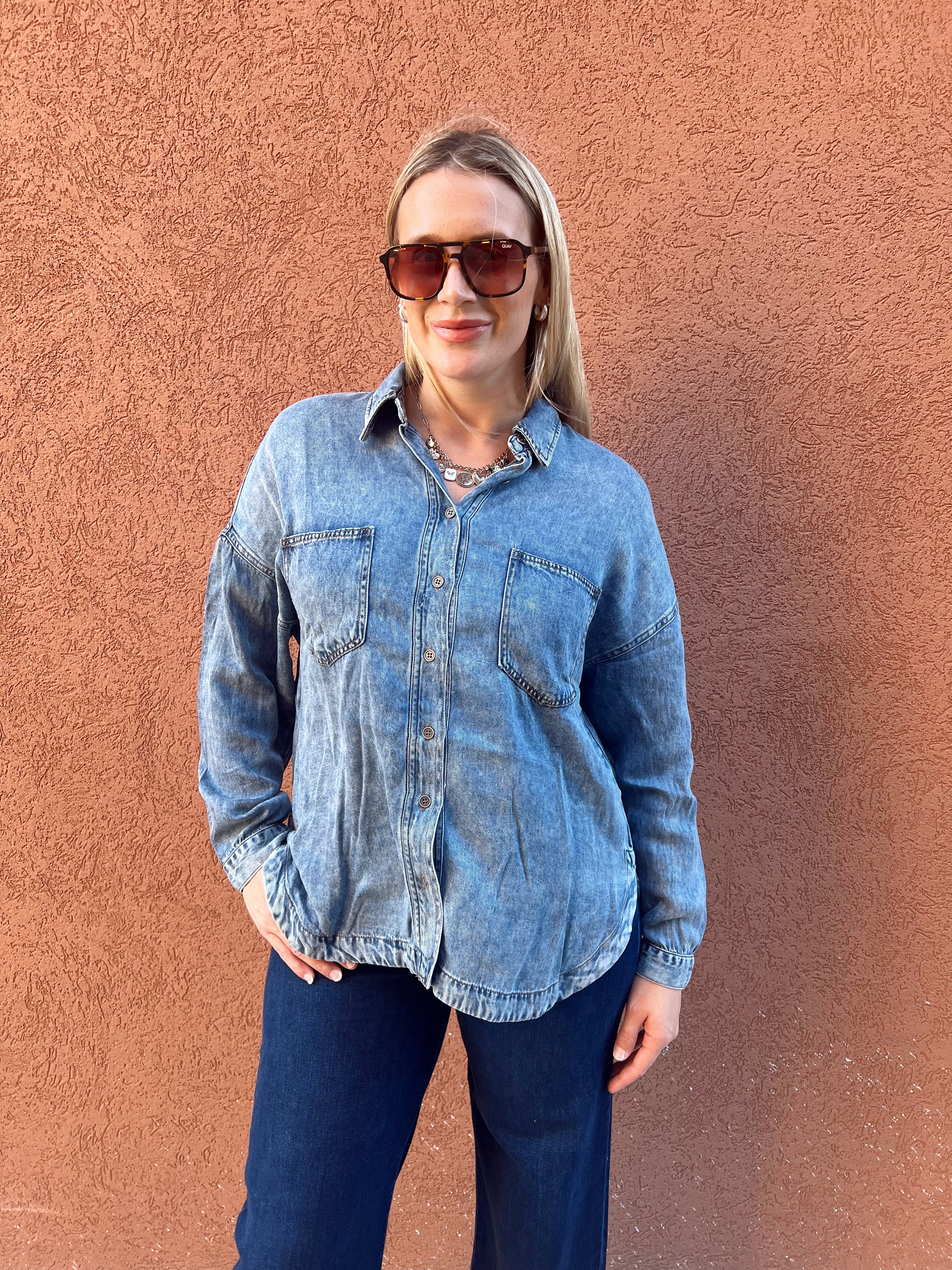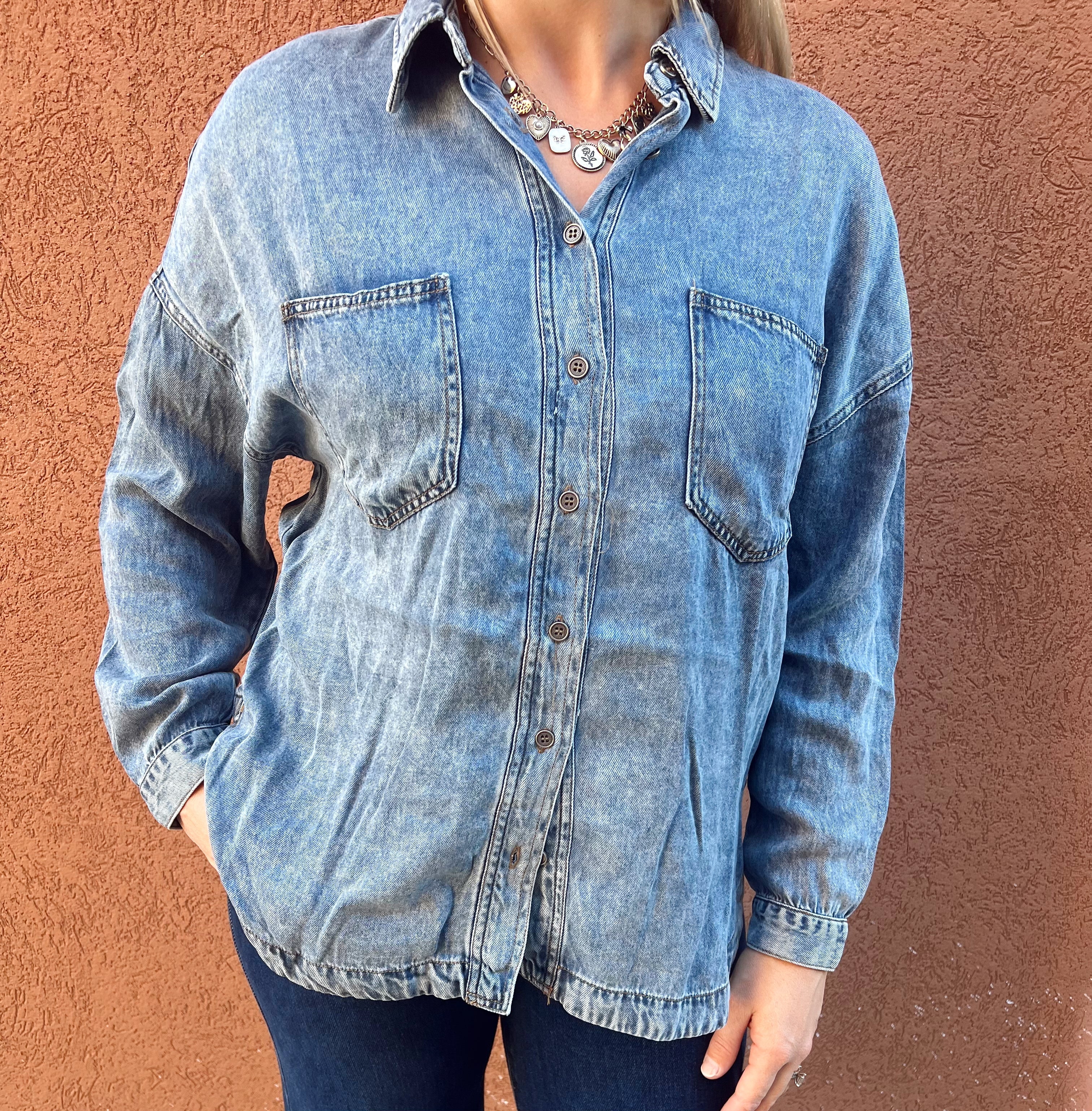 This washed denim button-up brings effortless cool to your everyday look. With a relaxed fit, soft vintage-inspired fabric, and front chest pockets, it’s the perfect mix of timeless and laid-back. Pair it with jeans for a chic denim-on-denim vibe or layer it over your favorite tee for that “off-duty but put-together” feel.