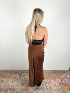 This chocolate satin midi dress features a stunning lace halter neckline with a flattering ruched waist that hugs in all the right places. Elegant yet bold, it’s the perfect statement dress for date nights, weddings, or special occasions where you want to turn heads.