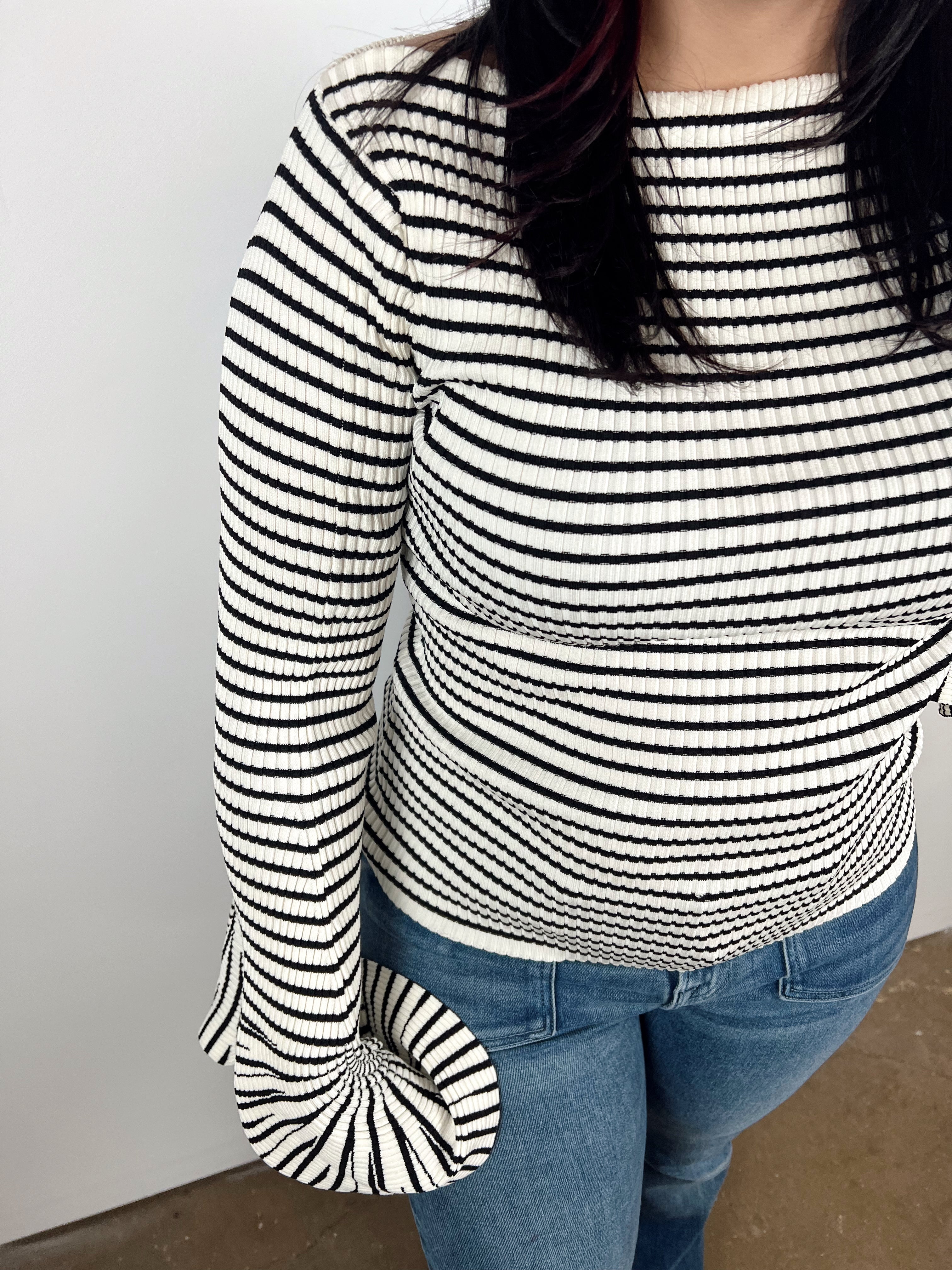 This striped bell sleeve top adds the perfect mix of modern flair and classic charm. With its ribbed texture, flattering fit, and statement flared cuffs, it’s a piece that effortlessly stands out. Dress it up with trousers for the office or keep it casual with denim for weekend plans — either way, it’s sure to turn heads.