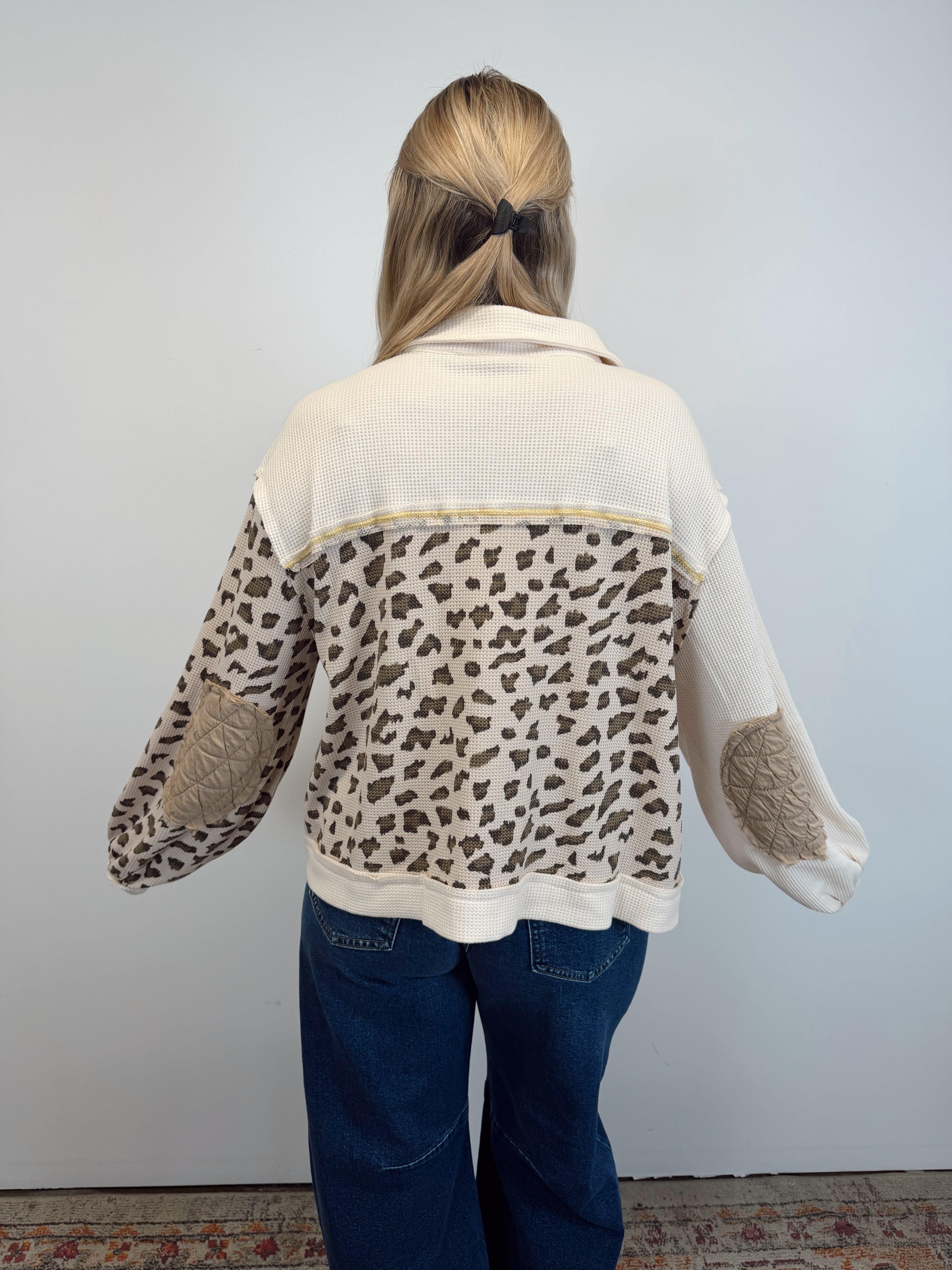 This mixed-fabric jacket brings effortless edge with a cozy twist. Featuring a neutral leopard print paired with quilted detailing and soft waffle-knit accents, it’s the perfect statement layer that still feels easy and wearable—ideal for dressing up your everyday denim.