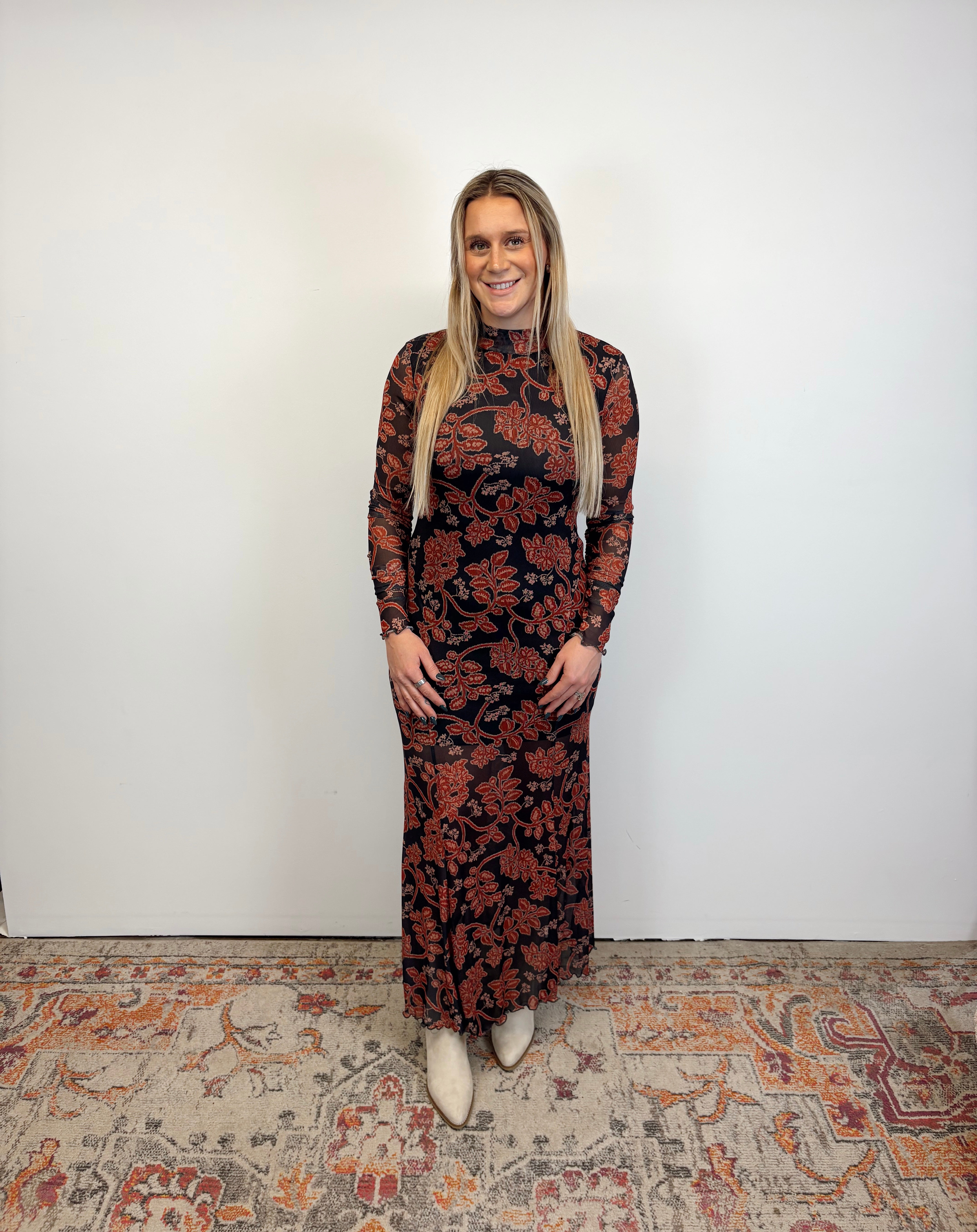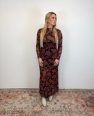 Effortlessly flattering with a romantic feel, this maxi dress features a rich floral print on a sleek, body-skimming silhouette. The stretchy fabric and long sleeves make it comfortable yet elevated—perfect for date nights, fall events, or dressed down with boots for everyday wear.