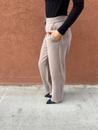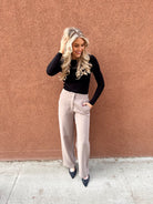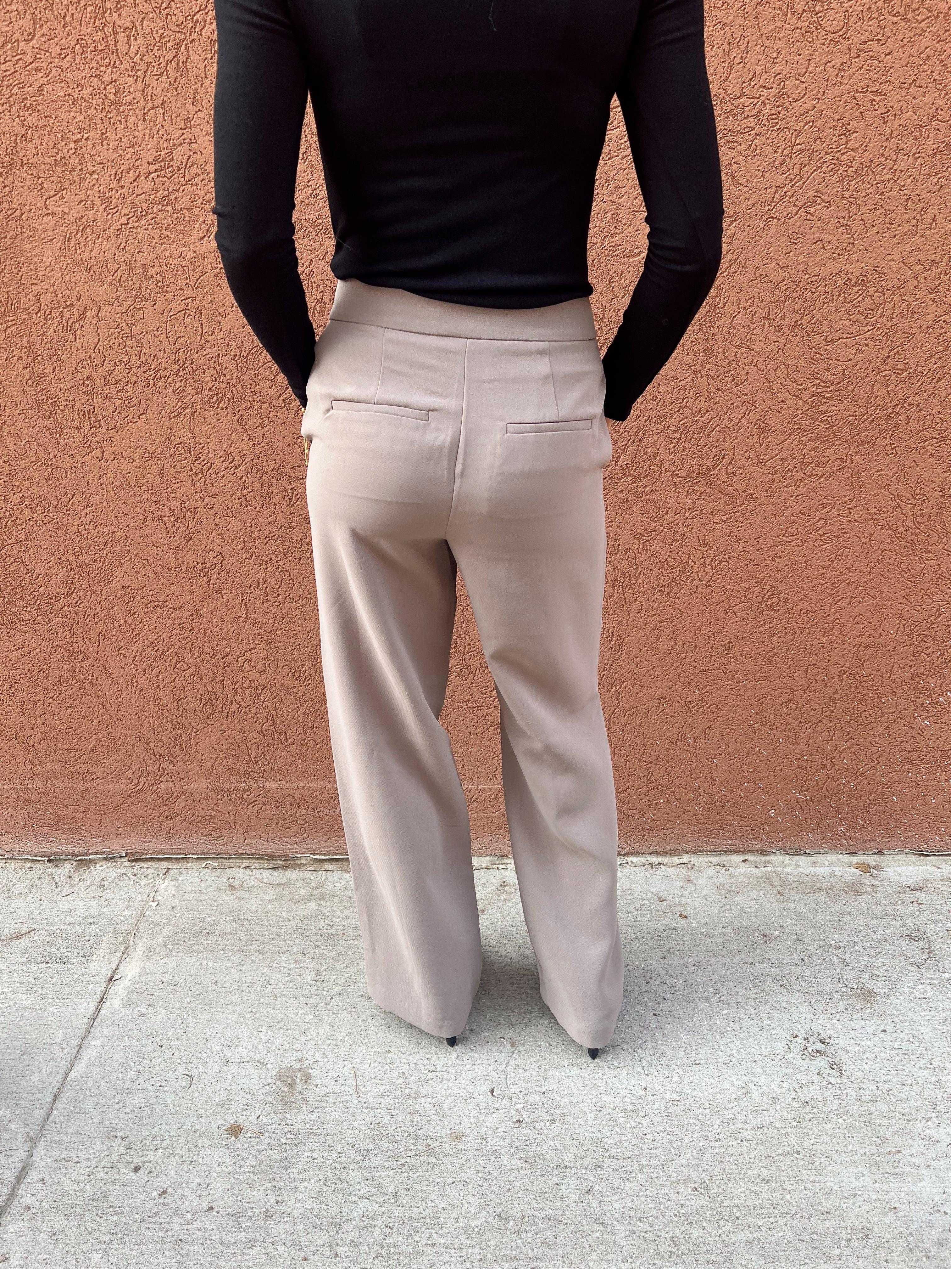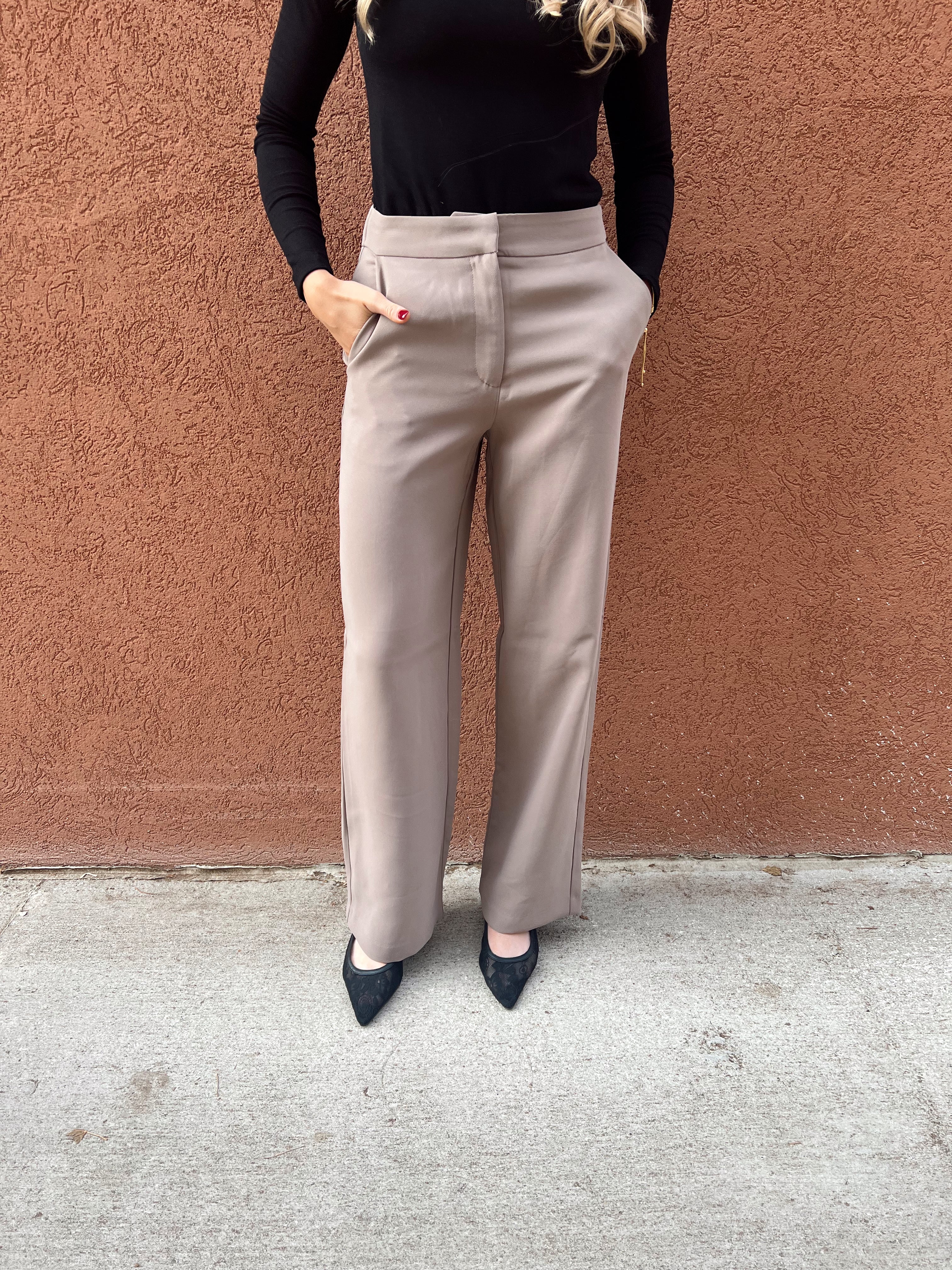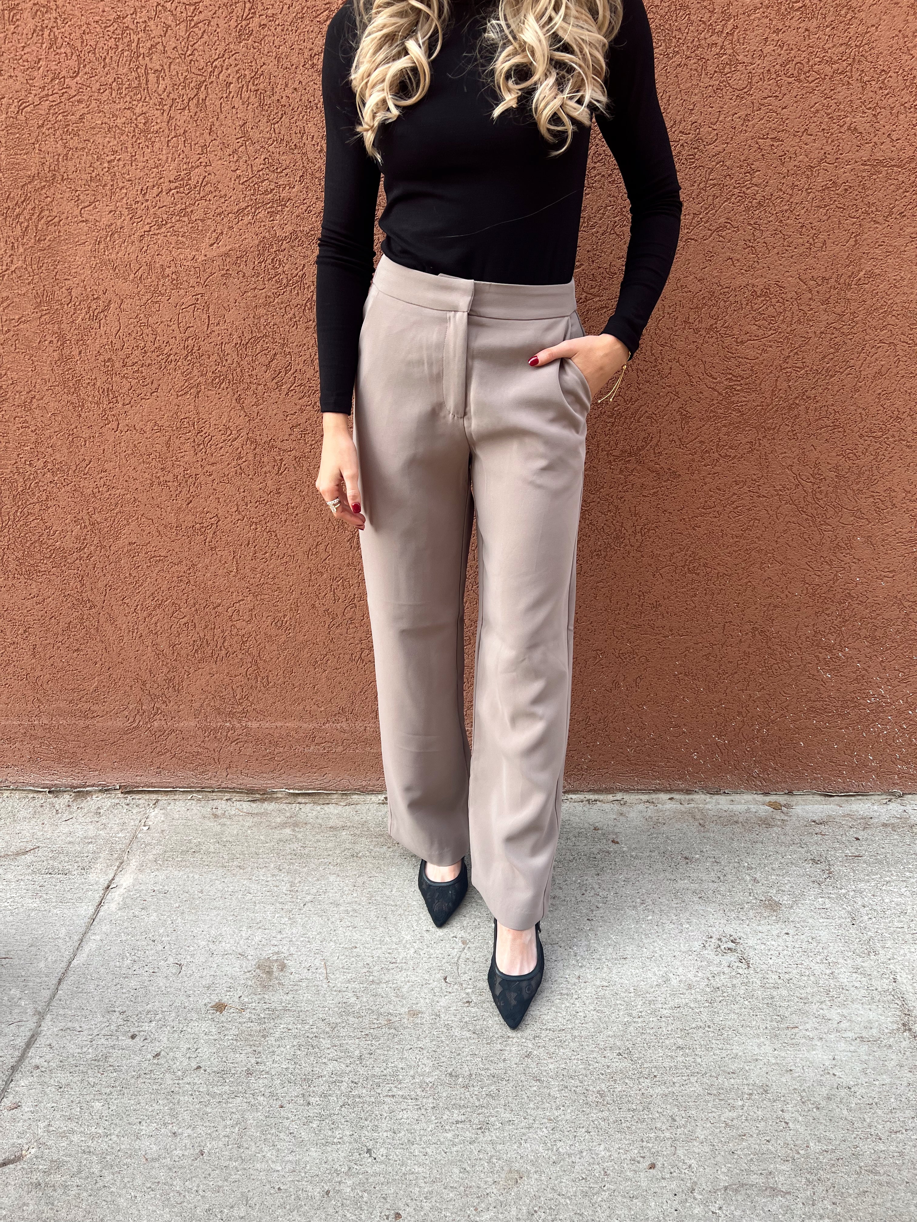 Meet your new go-to polished trouser—the pair that instantly elevates every outfit without trying too hard. These taupe straight-leg trousers feature a clean front, subtle tailoring, and a flattering high-rise fit that smooths and elongates. The drapey woven fabric gives them that effortless, sophisticated look while still feeling comfortable for all-day wear. Perfect for the office, brunch dates, or dressing up your basics, they’re the definition of chic, modern, and timeless.