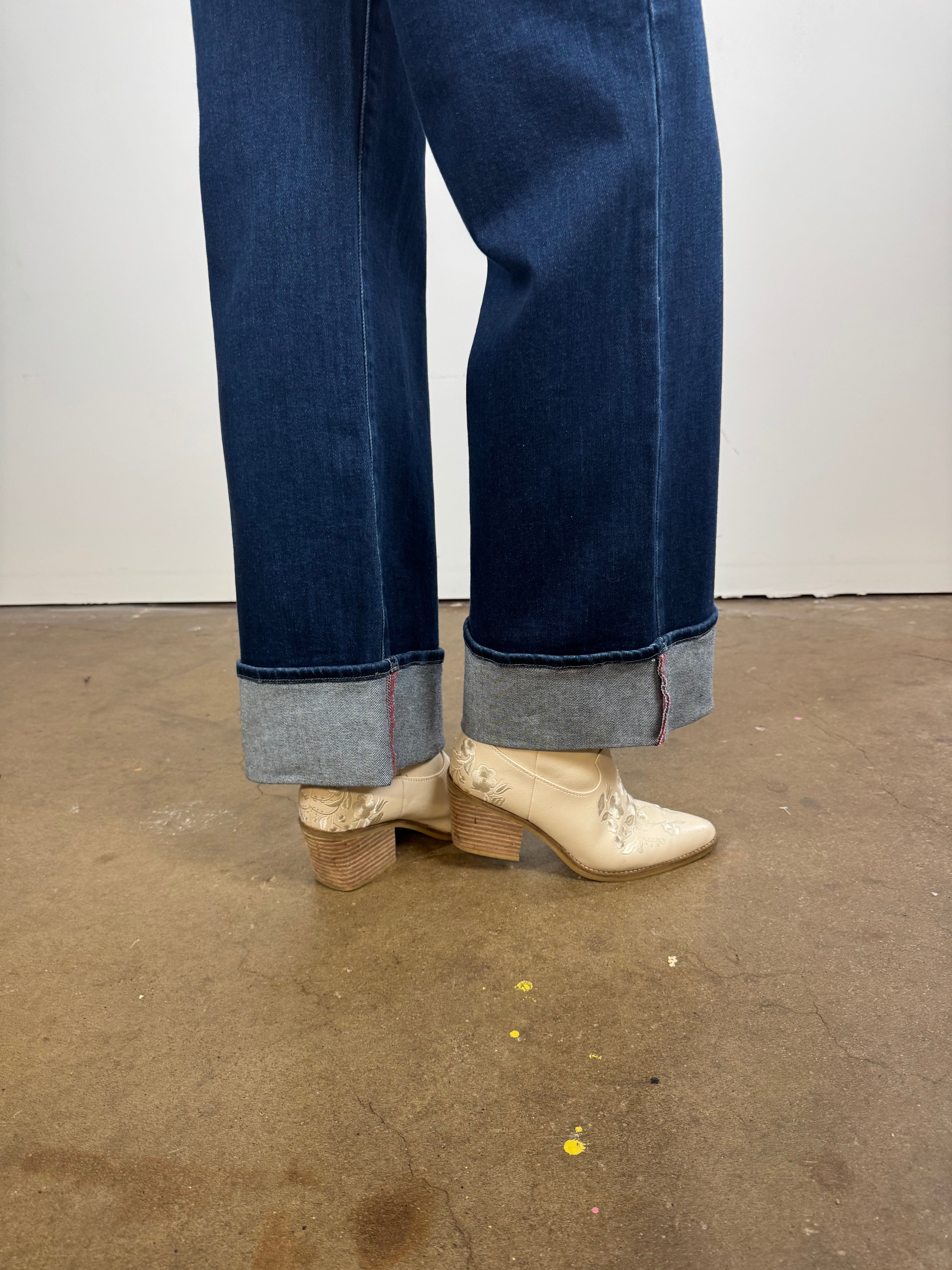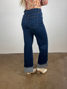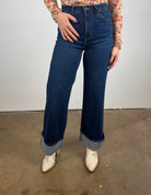 Make a statement with these cuffed palazzo jeans that blend retro-inspired drama with everyday wearability. Designed in a deep indigo wash with wide-leg structure, these jeans feature an exaggerated cuff that instantly elevates even the simplest look. Their high-rise fit cinches at the waist, creating a flattering silhouette that pairs perfectly with tucked-in tops and bodysuits.