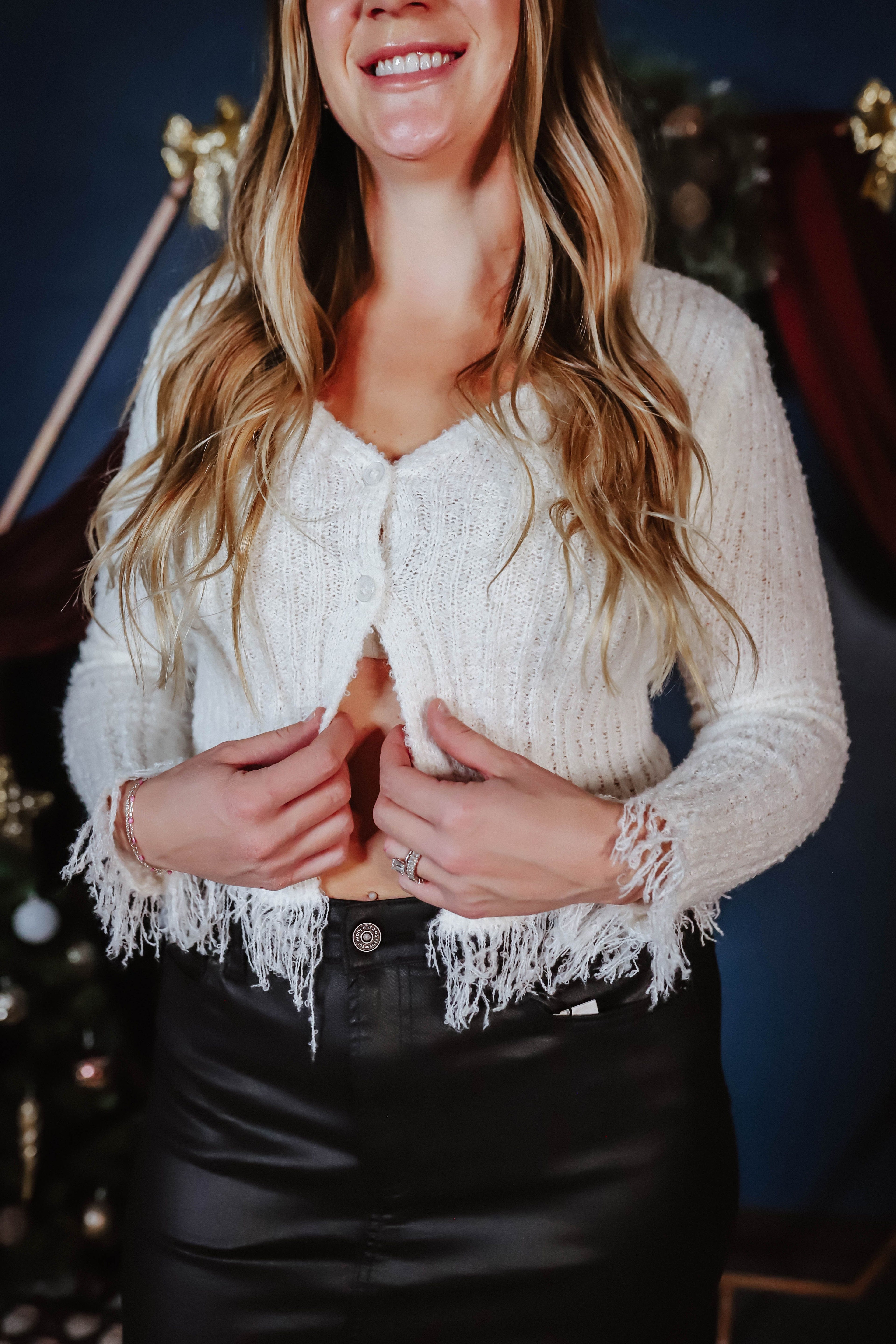 Wrap yourself in effortless style with this knit open-front cardigan. Featuring playful fringe details and a relaxed silhouette, it's the perfect layer for cozy evenings or breezy days. Versatile, chic, and made to compliment any outfit!
