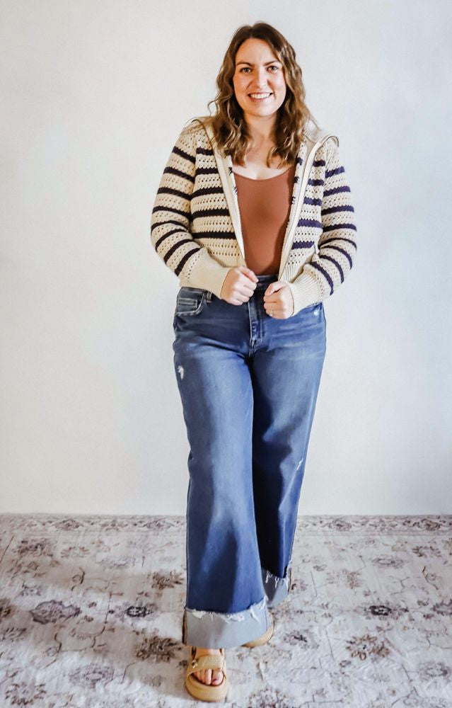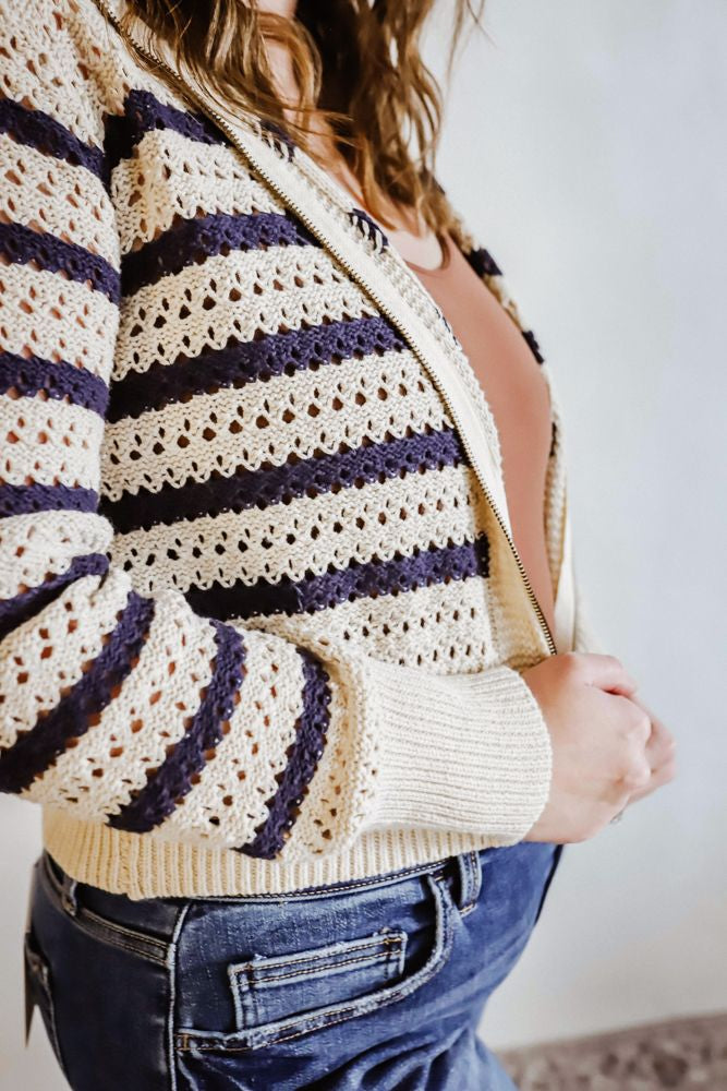 Add a touch of textured sophistication to your wardrobe with this open knit zip-up jacket. The intricate open-knit design offers a breezy, lightweight feel—ideal for layering during transitional weather.