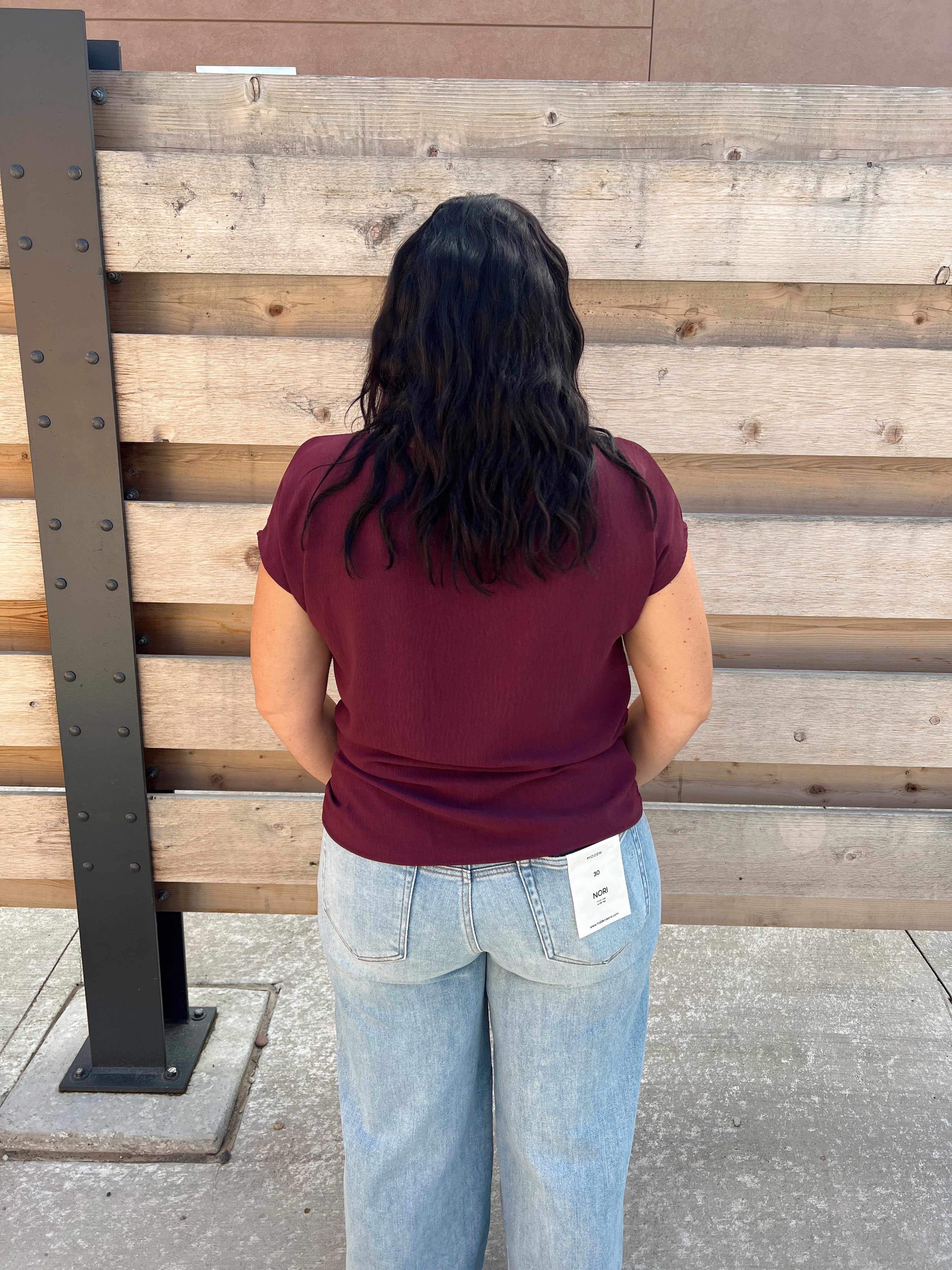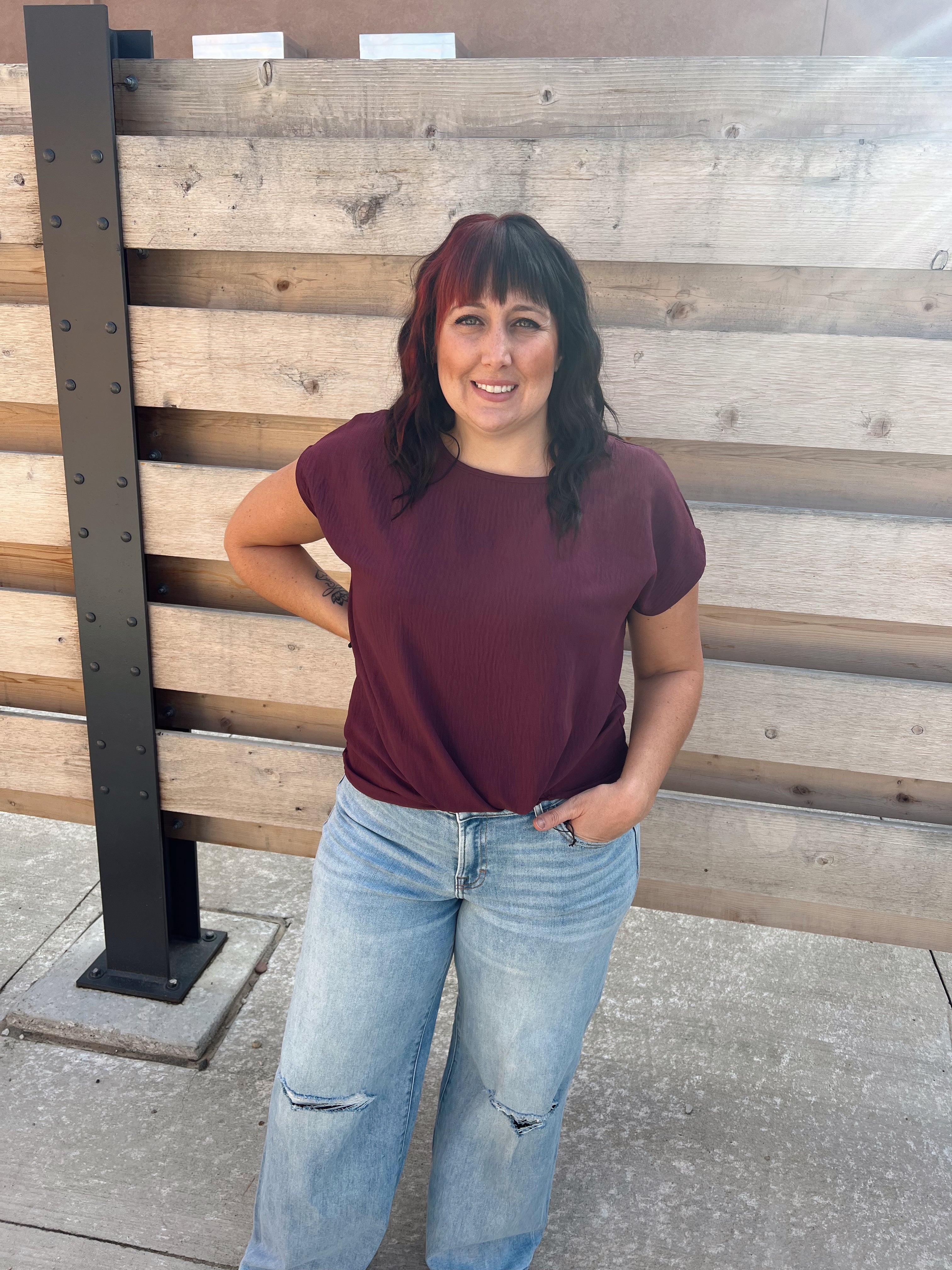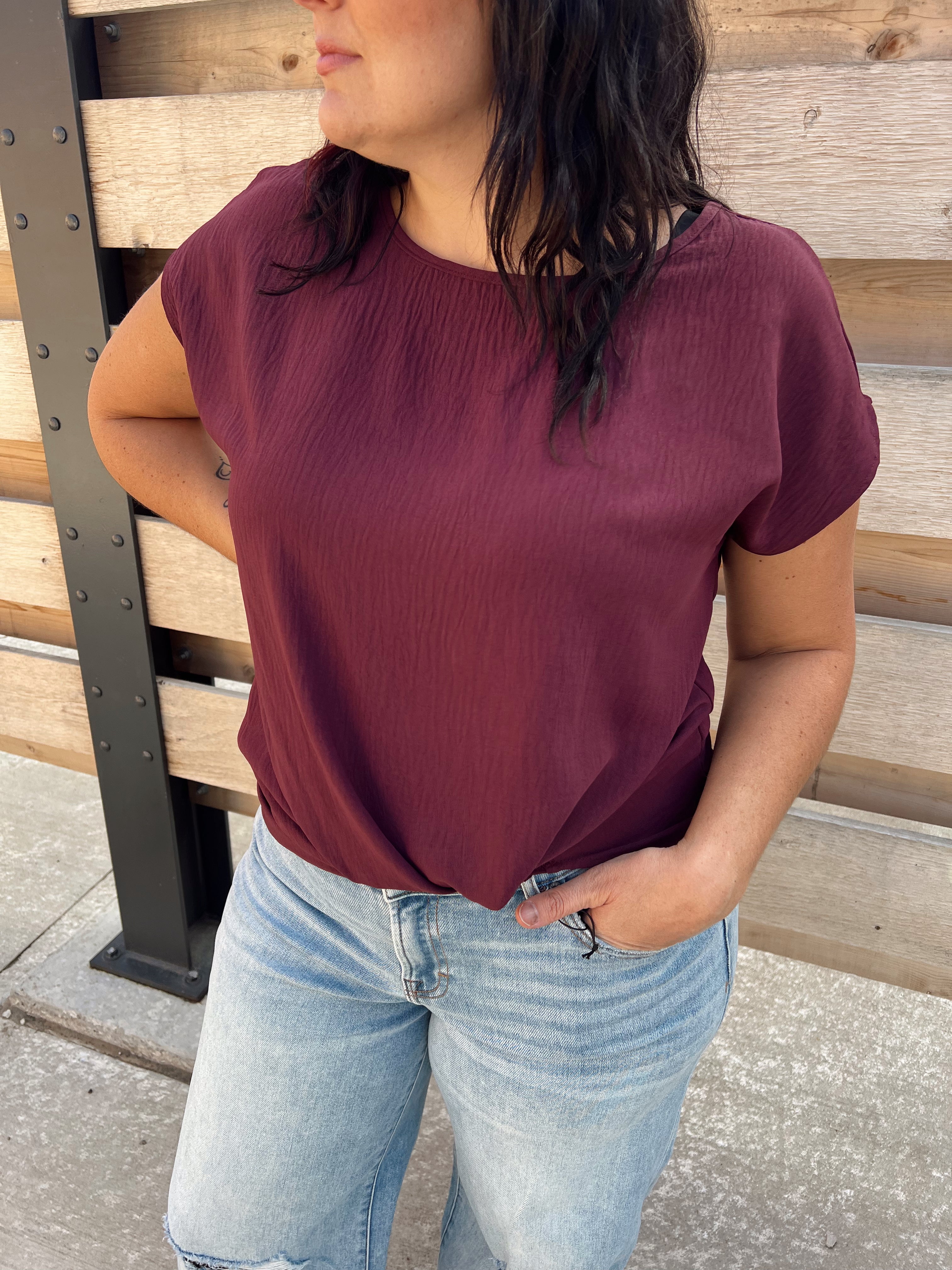 This blouse features a rich burgundy hue with a subtle textured finish, offering a lightweight and relaxed fit that drapes beautifully for an easy, put-together look. Perfect for both casual days and dressed-up evenings, it's a versatile wardrobe staple that pairs with denim or tailored pieces.