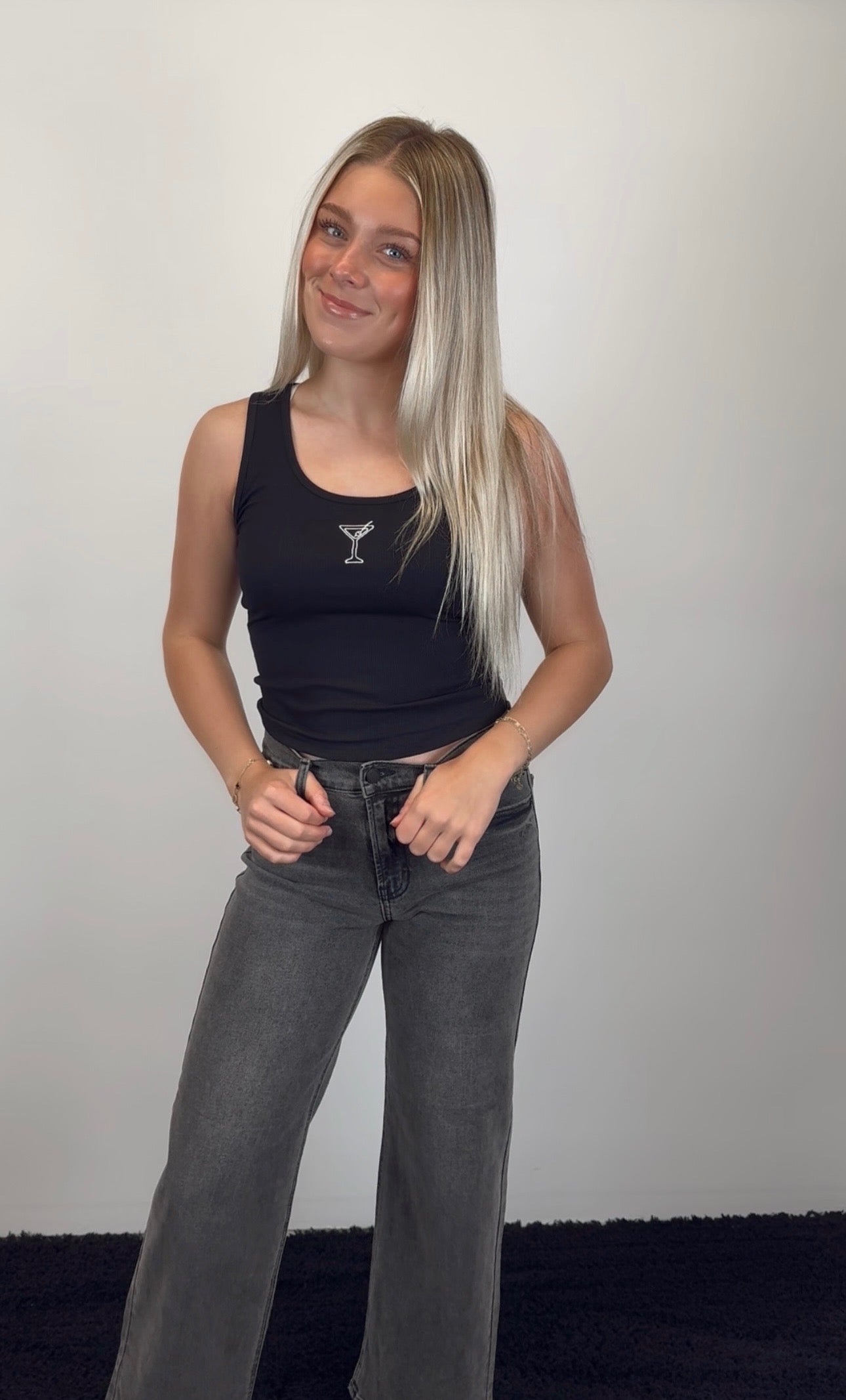 Shaken, stirred, and seriously cute. This black crop tank brings the party with a playful embroidered martini glass that adds just the right splash of fun. With its flattering fit and cheeky charm, it's made for girls' nights, bachelorette weekends, or anytime you're feeling a little extra.