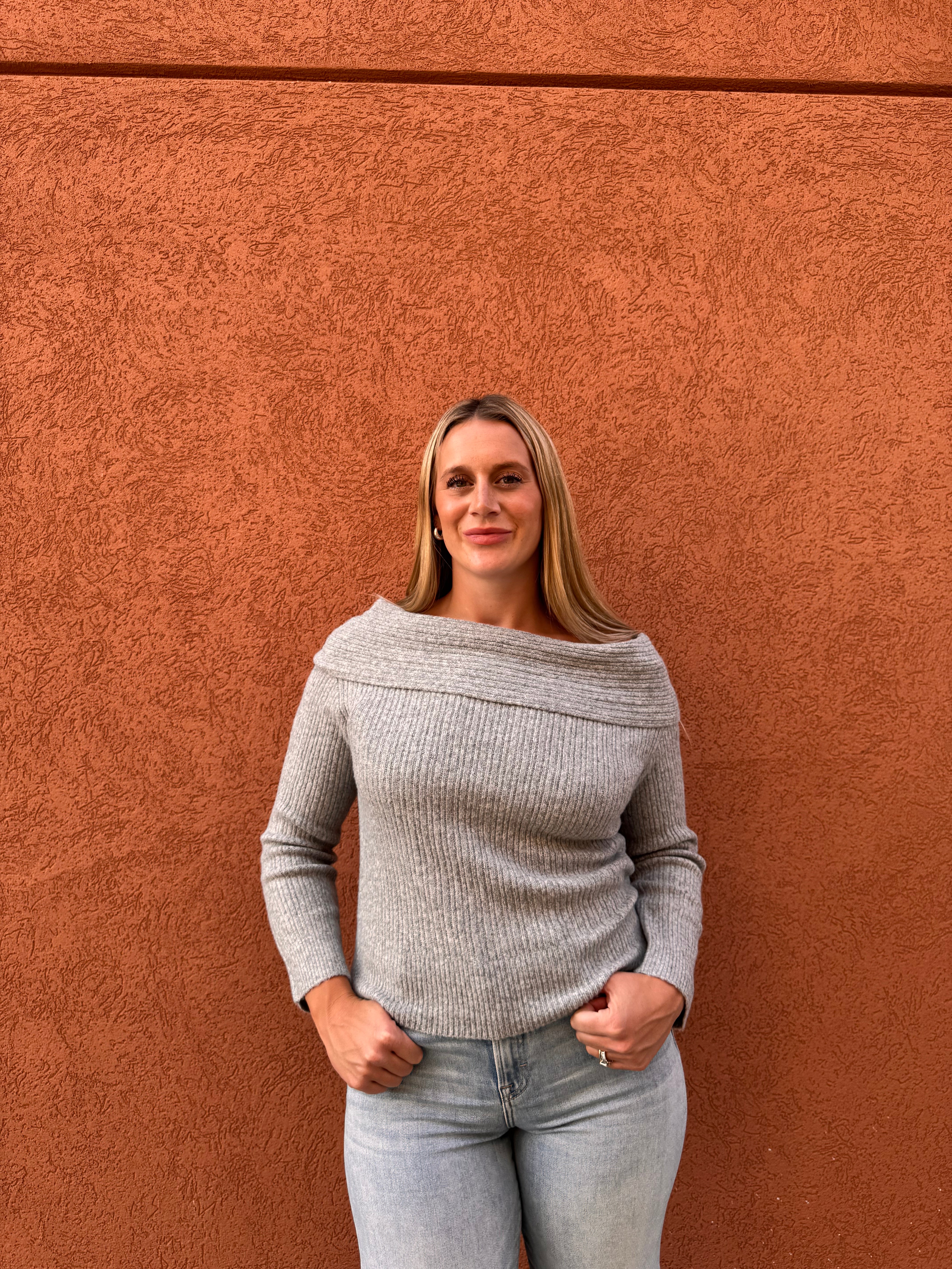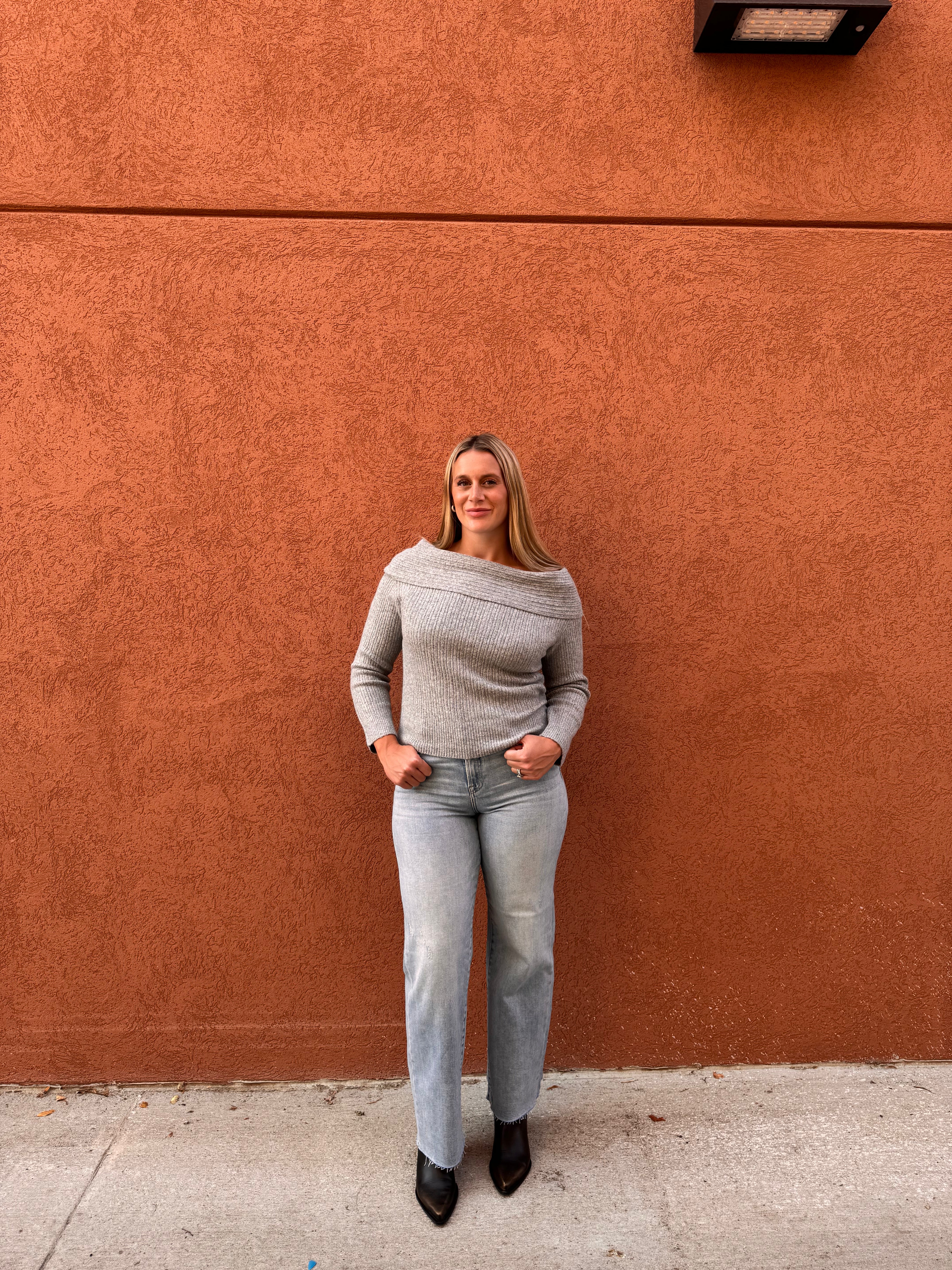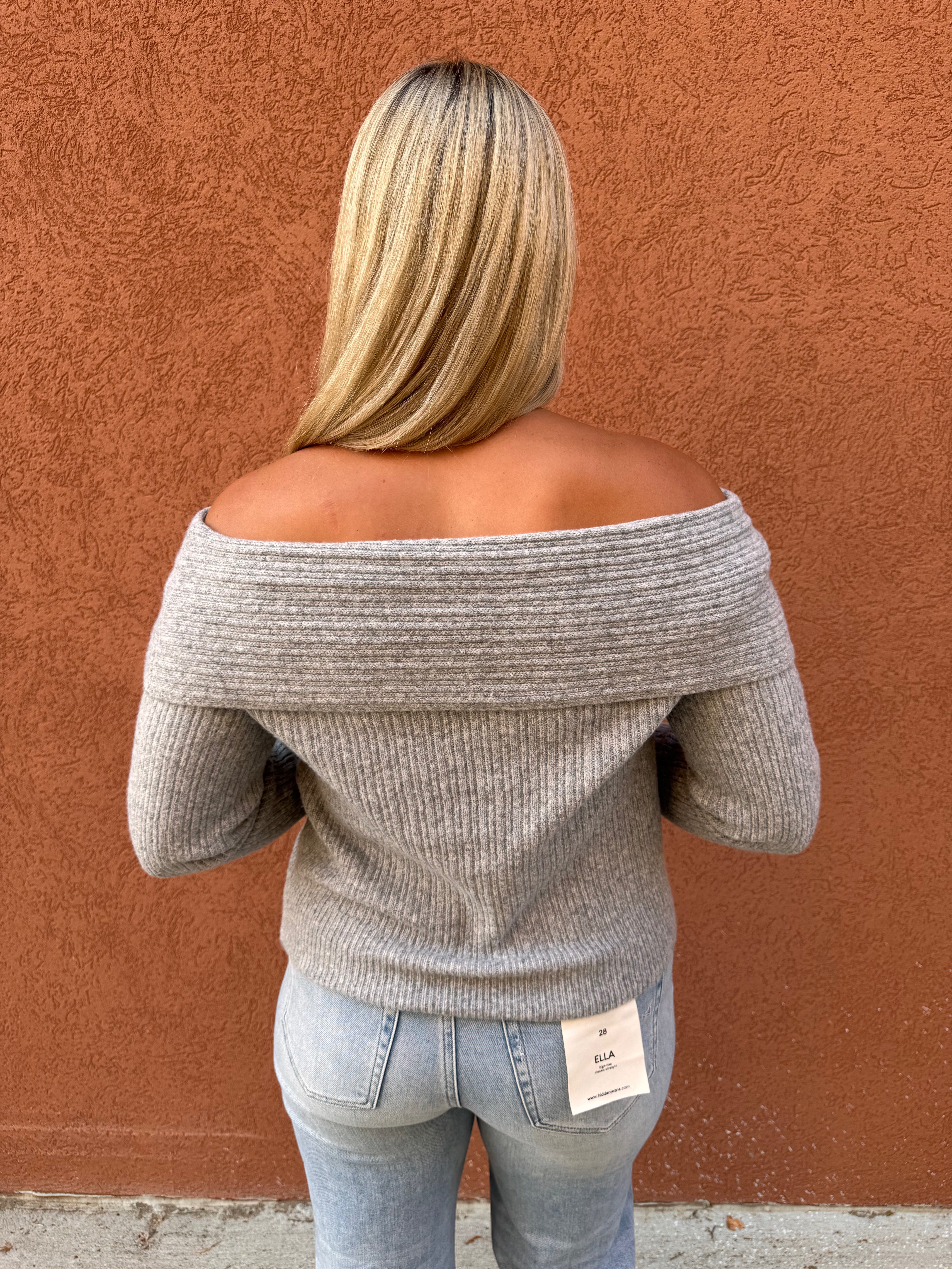 This ribbed off-the-shoulder sweater is the perfect mix of elegance and comfort. With its flattering fold-over neckline and soft knit fabric, it's a versatile piece you can wear casually with denim or dress up for a night out. A timeless neutral that belongs in every wardrobe.