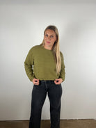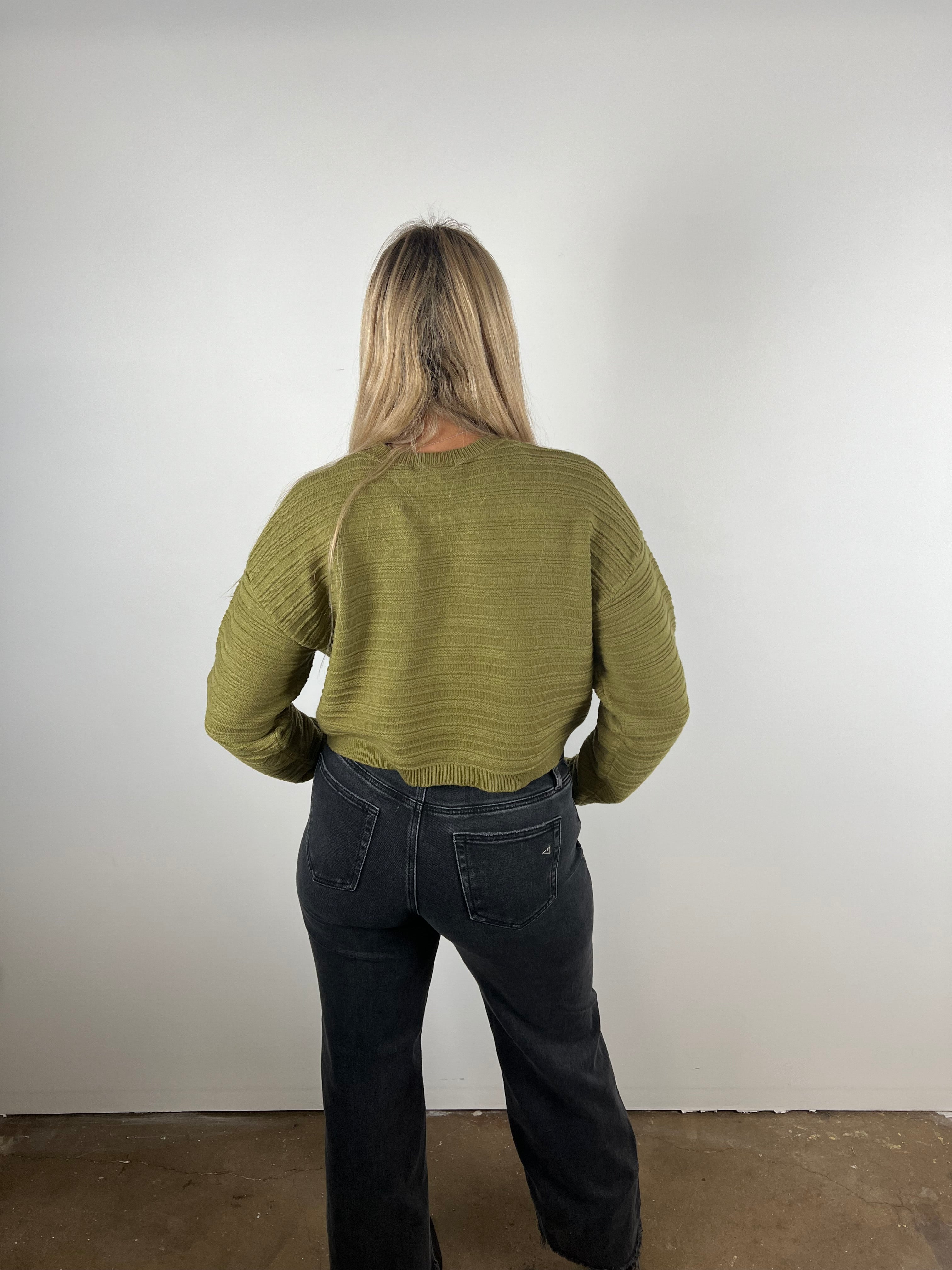 This olive textured knit sweater is the definition of laid-back chic. With a soft ribbed pattern, relaxed fit, and cropped length, it's an easy everyday piece that pairs perfectly with your favorite denim. Dress it up with gold jewelry or keep it casual with sneakers - either way, it's your new go-to for cozy, effortless style.