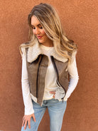 This faux suede and sherpa vest is the ultimate layering piece for fall and winter. The soft taupe suede exterior gives it a luxe, polished look, while the plush sherpa lining adds all the cozy feels. Featuring a zip front and structured fit, it instantly elevates any outfit- from a basic long sleeve and jeans to a turtleneck dress and boots. A statement piece that's equal parts trendy and timeless!