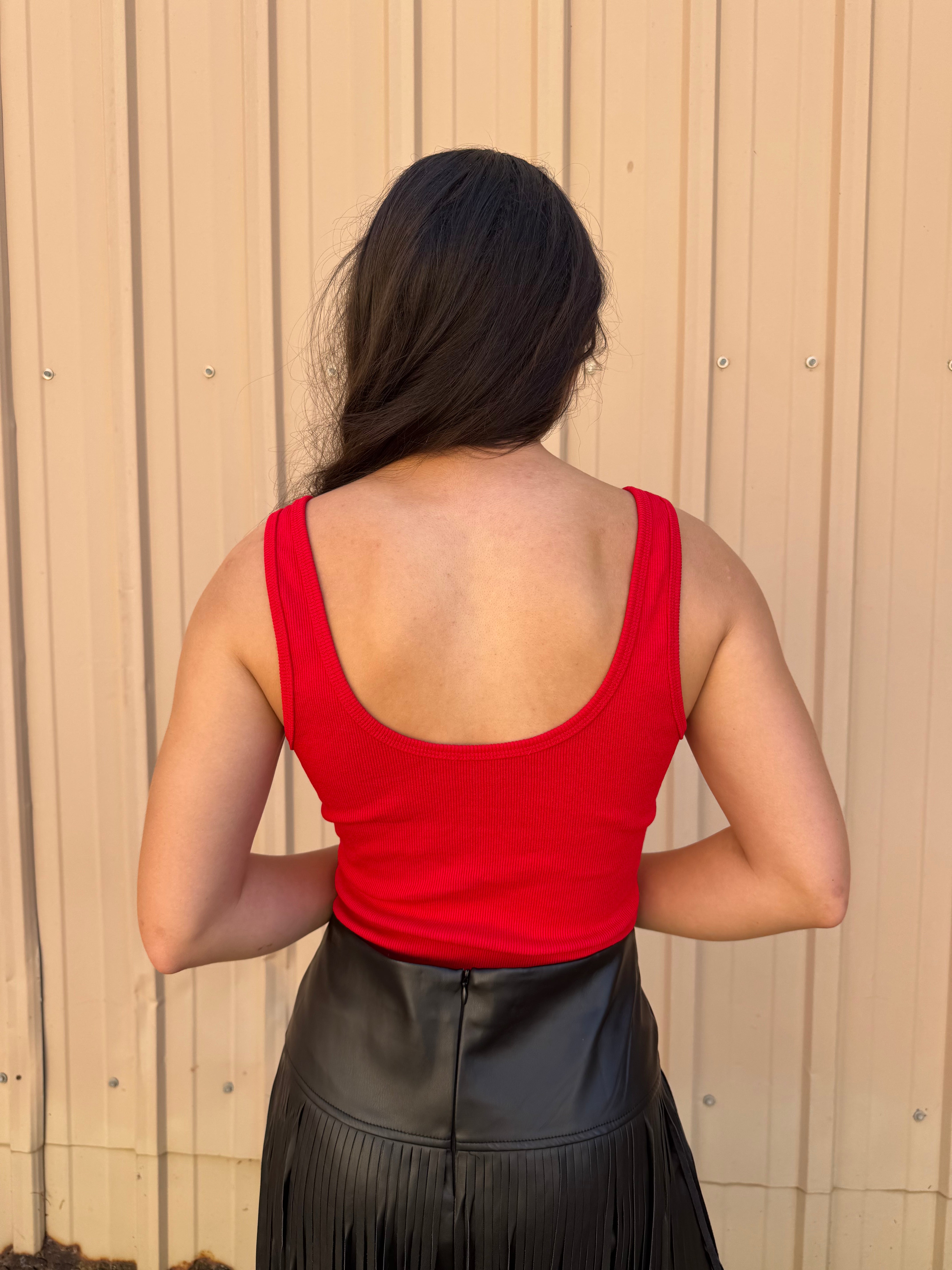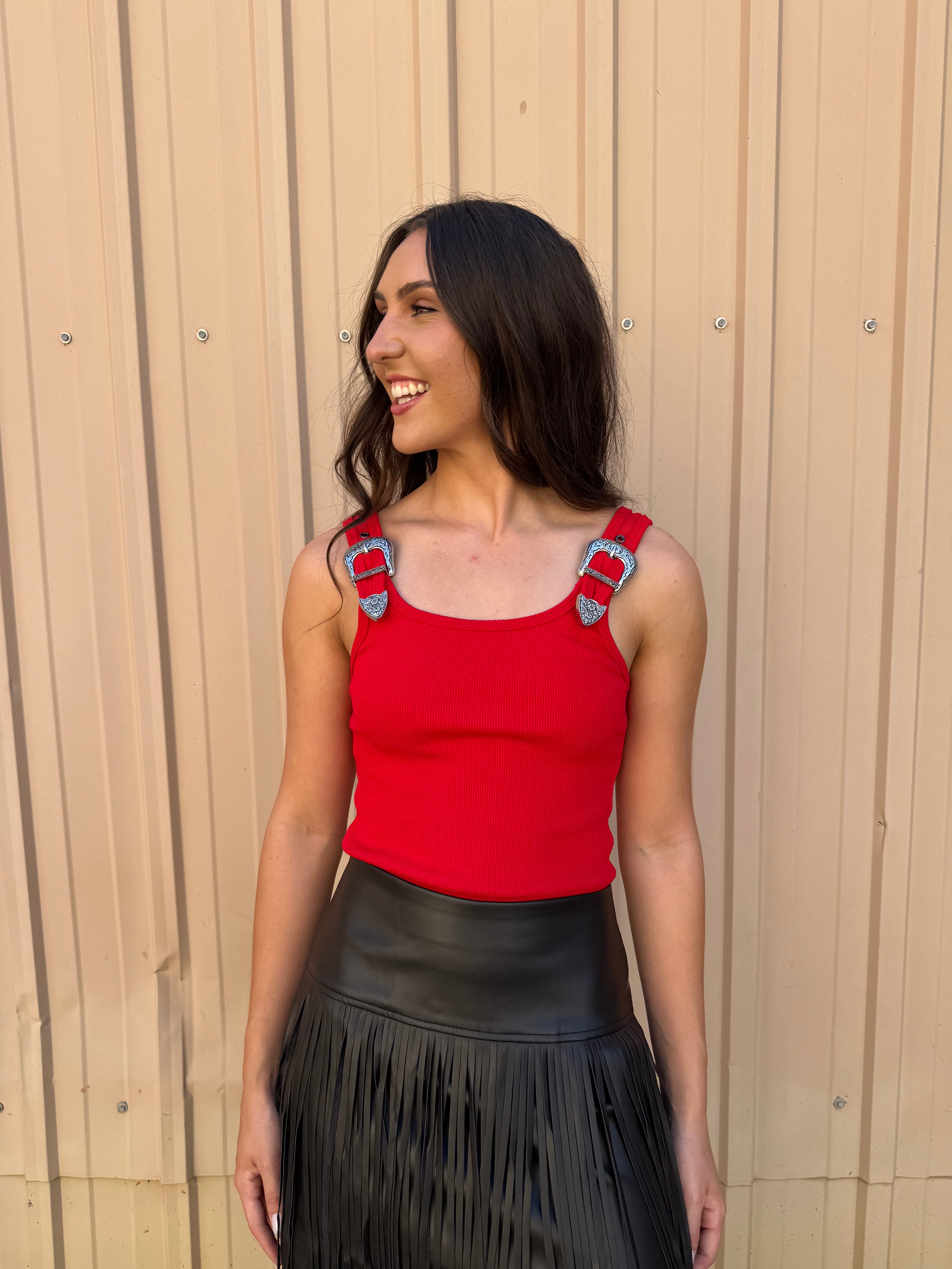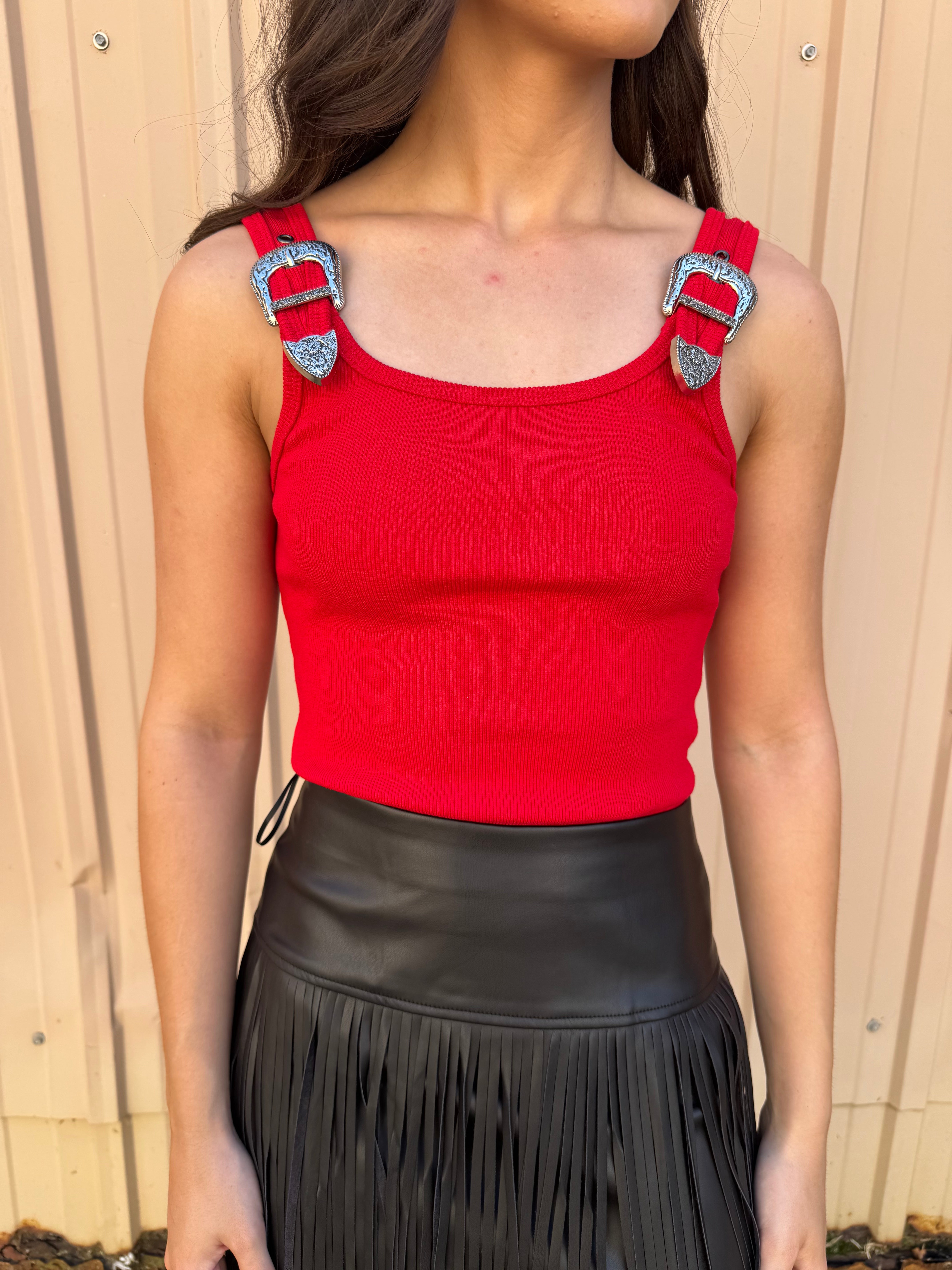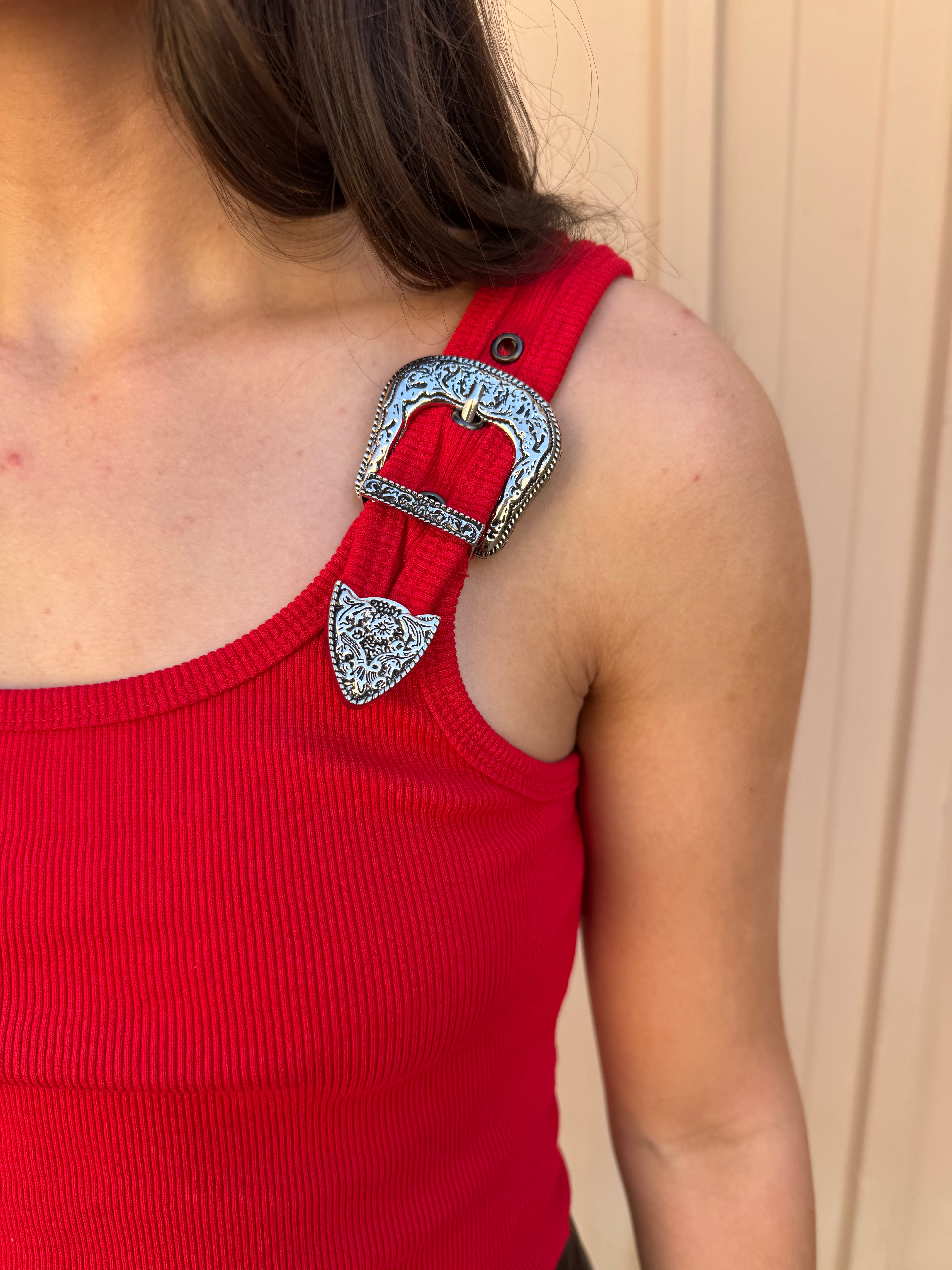 Turn heads in this Western Buckle Bodysuit, where bold meets chic. Designed with a ribbed, body-hugging fit, this striking piece features statement silver buckle details on the straps for a modern, edgy twist. The vibrant red hue adds the perfect pop of color, making it a standout piece whether worn solo or layered. Pair it with denim for a casual-cool vibe or a sleek skirt for a night-out look.