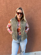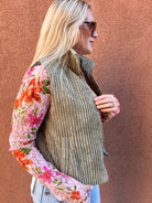 This corded zip-up vest is the perfect mix of style and comfort for cooler days. Designed in a soft olive hue with plush ribbed texture, it adds just the right amount of warmth without feeling bulky. Layer it over long sleeves or lightweight knits for that effortlessly put-together fall look that’s equal parts casual and chic.