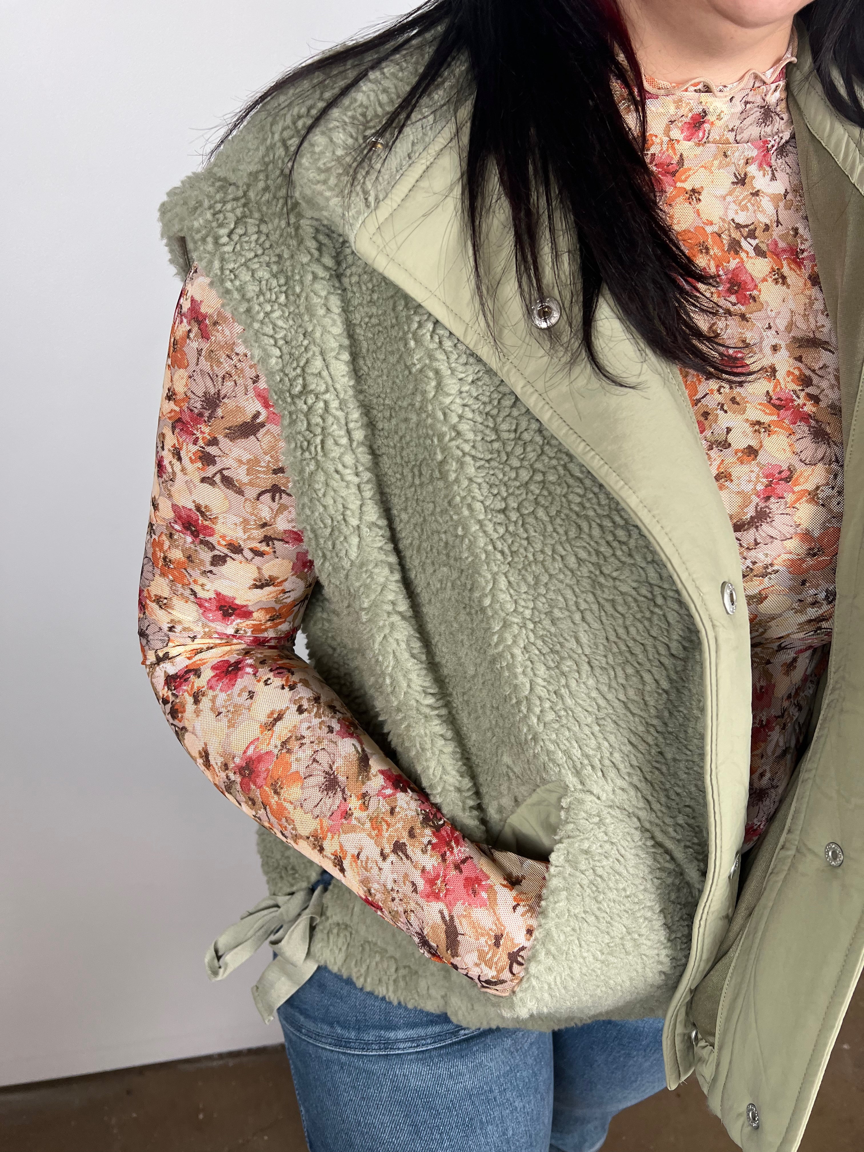 Wrap yourself in warmth and style with this ultra-soft sherpa vest in a dreamy sage hue. Designed with a plush teddy texture, side tie details, and snap-button closure, it’s the perfect blend of casual comfort and modern flair. Layer it over your favorite turtlenecks, flannels, or long sleeves for that effortlessly cozy-girl vibe that looks as good as it feels.