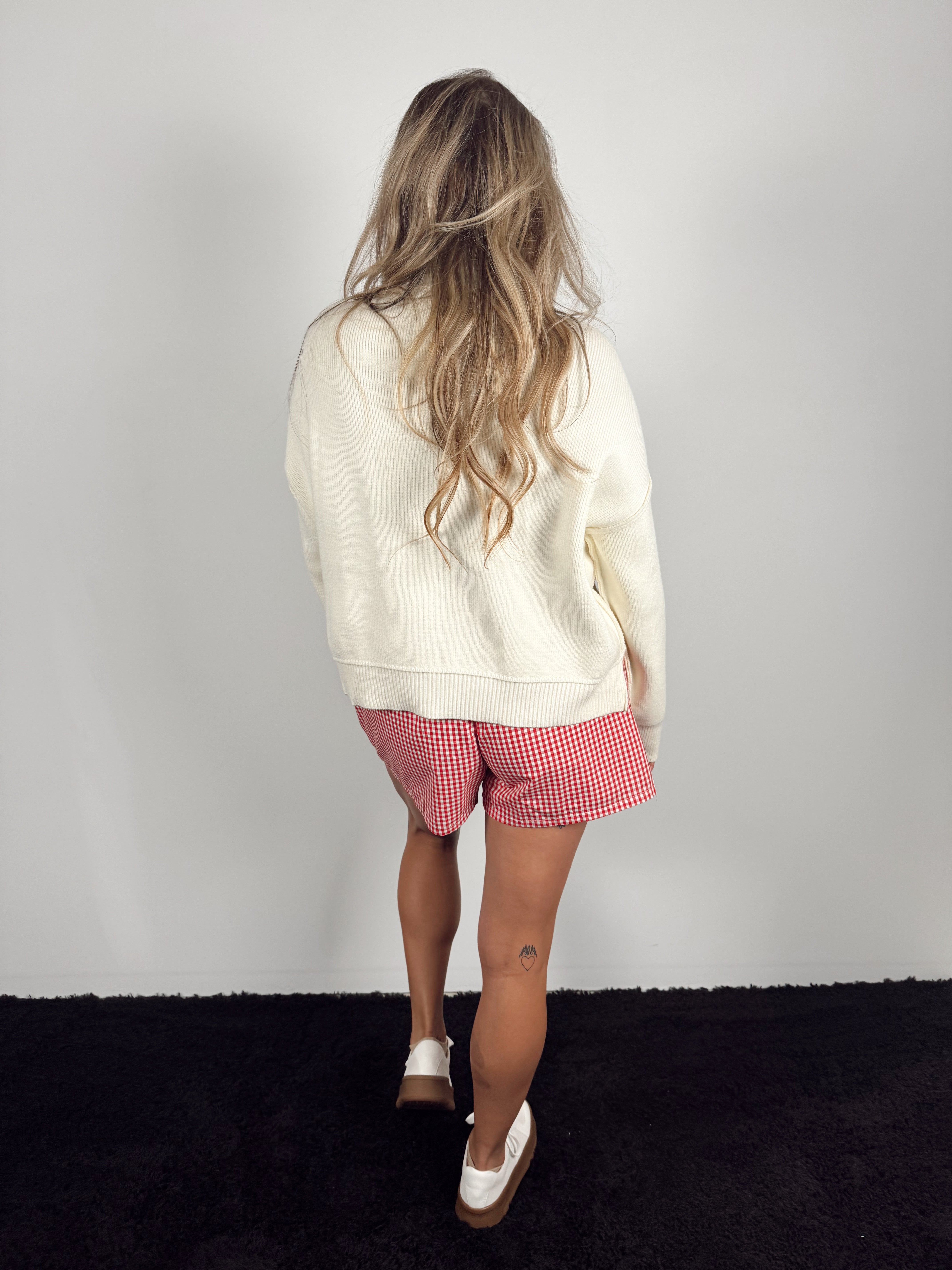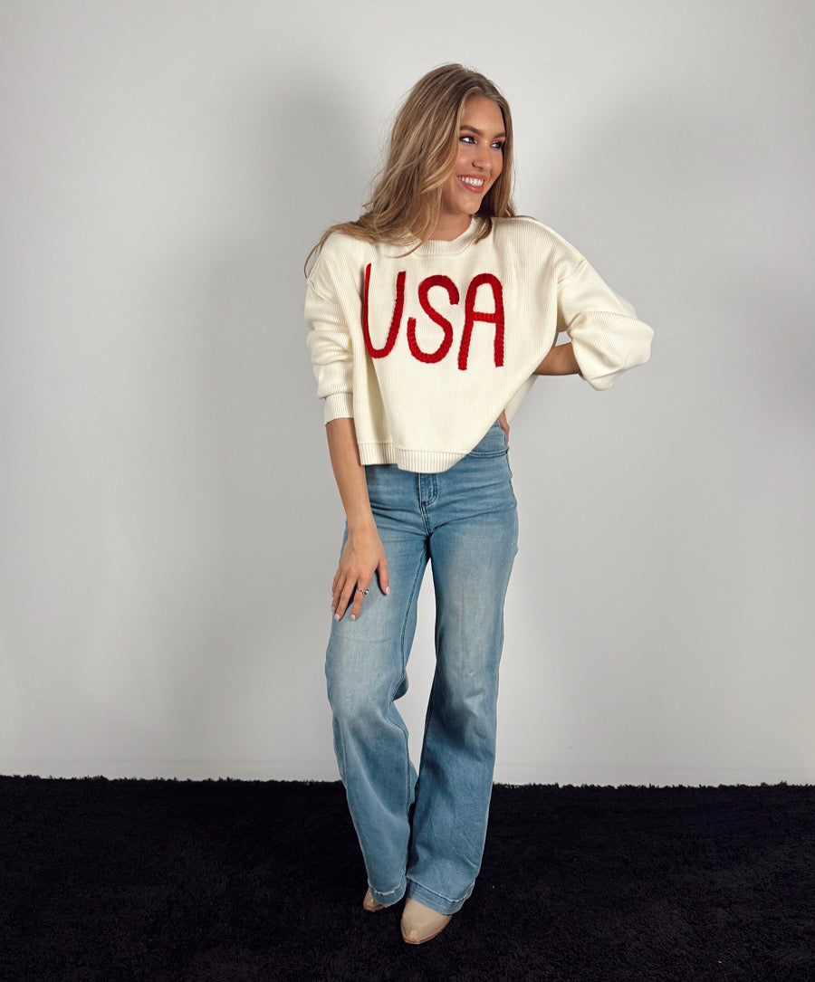Stars, stripes, and cozy vibes. This braided USA knit sweater is the perfect blend of comfort and American charm. With its textured knit details and bold patriotic lettering, it's made for lake days, fireworks, and everything red, white, and you. Layer it up or wear it solo-- either way, you're repping the USA in style.