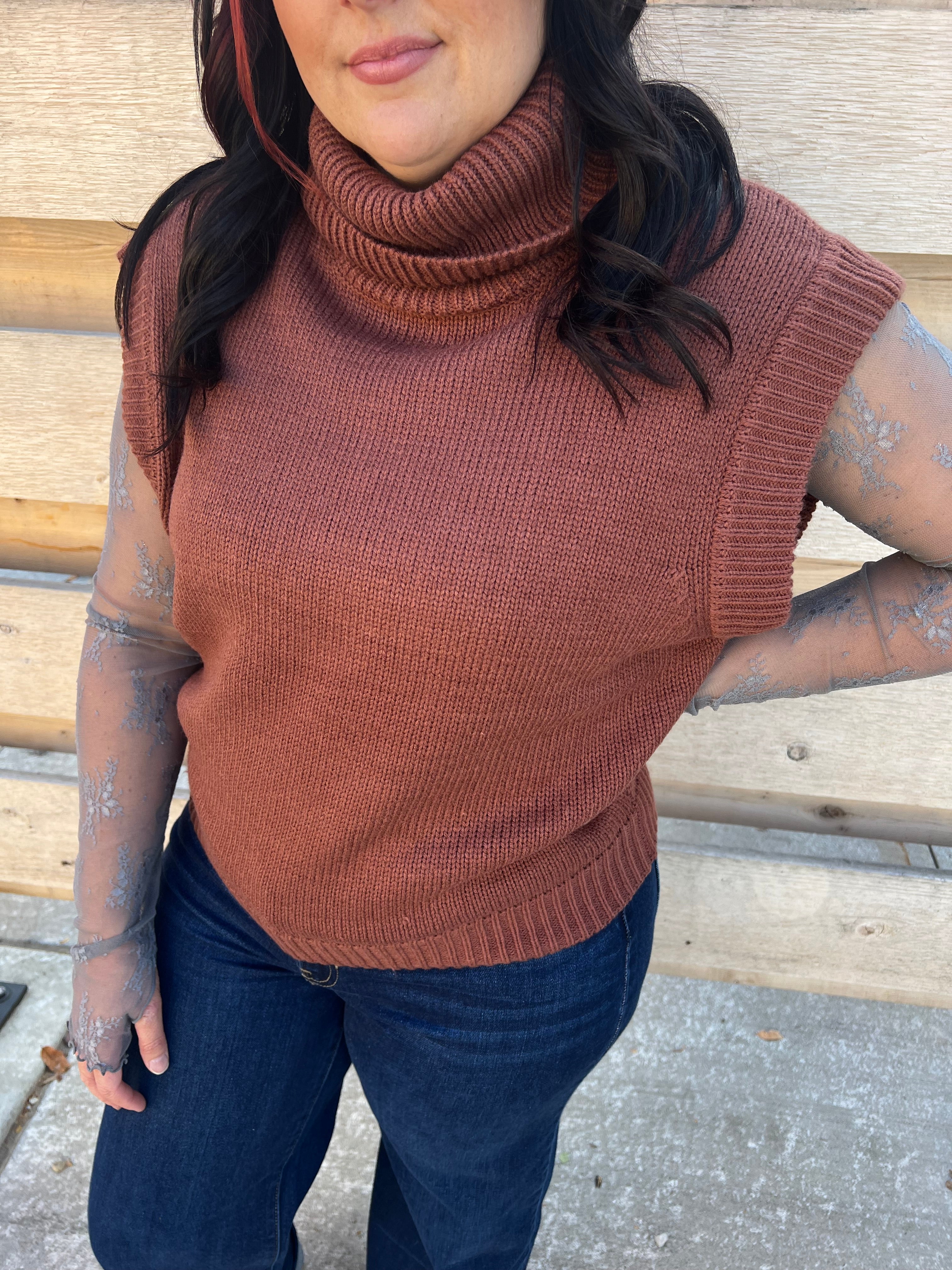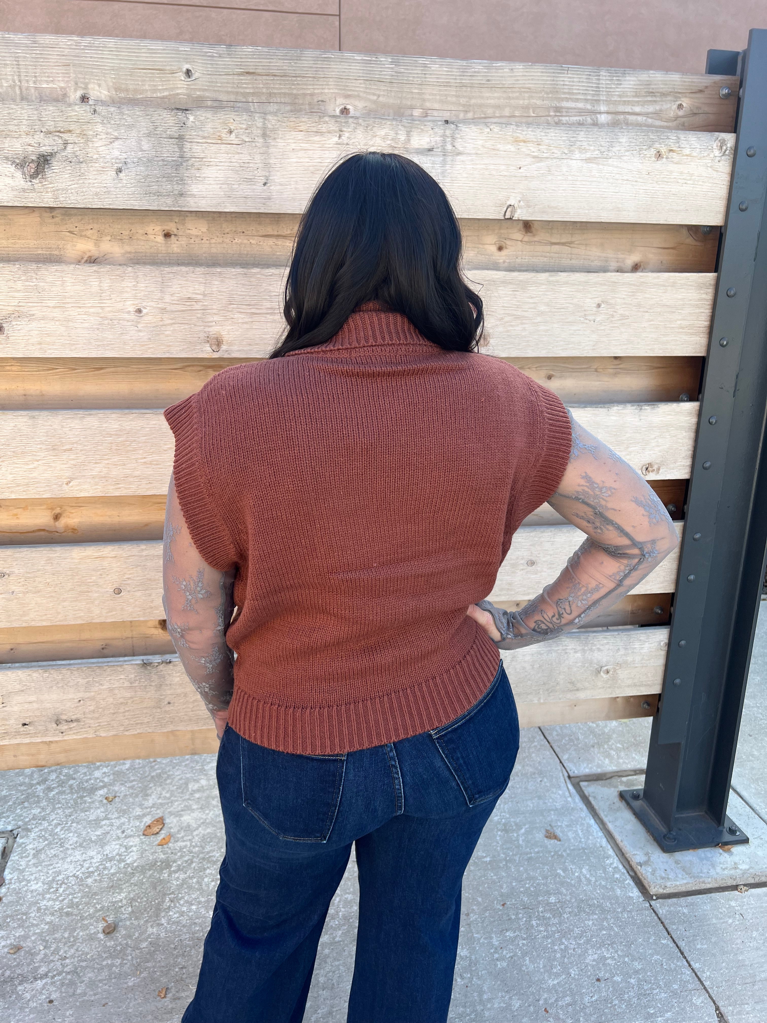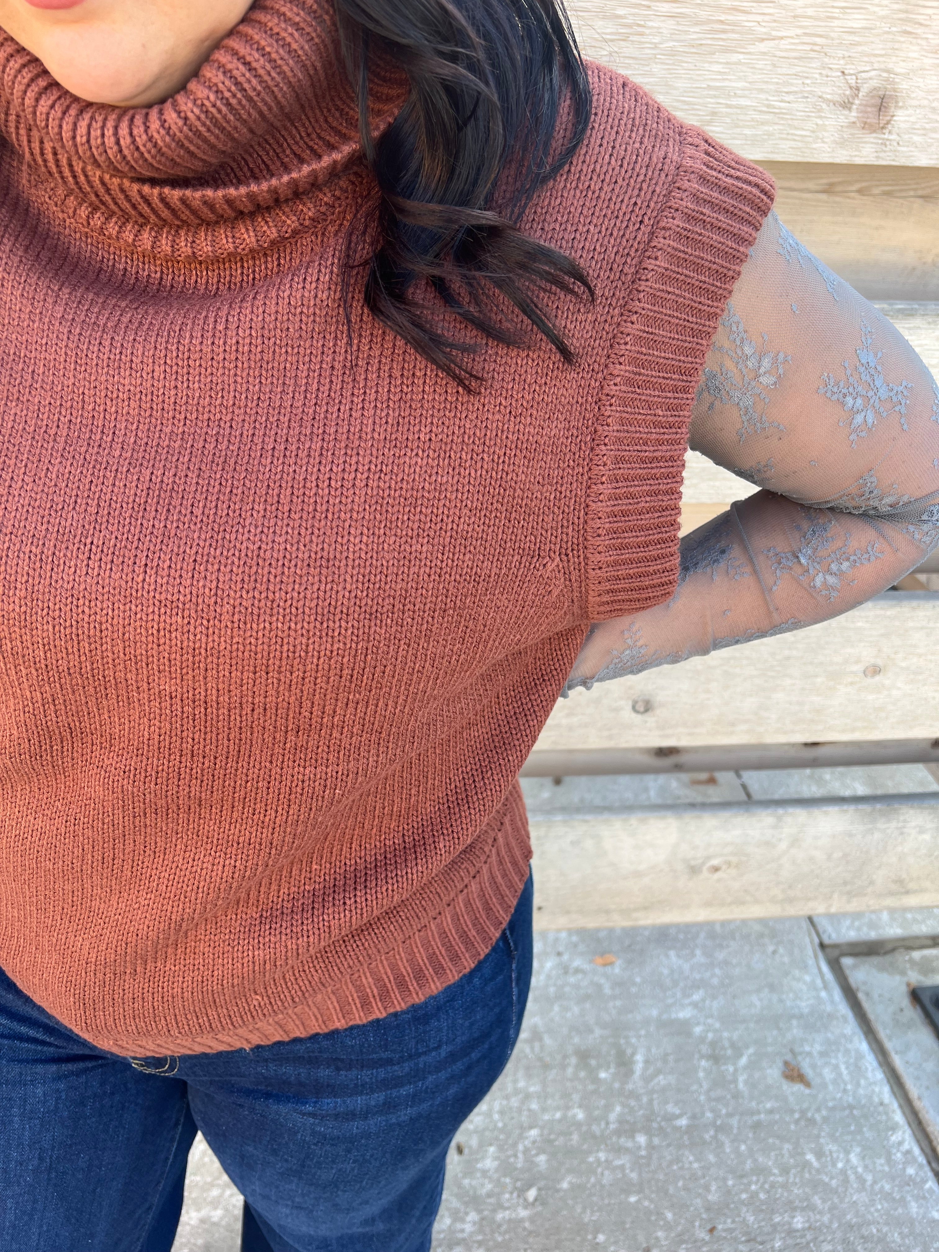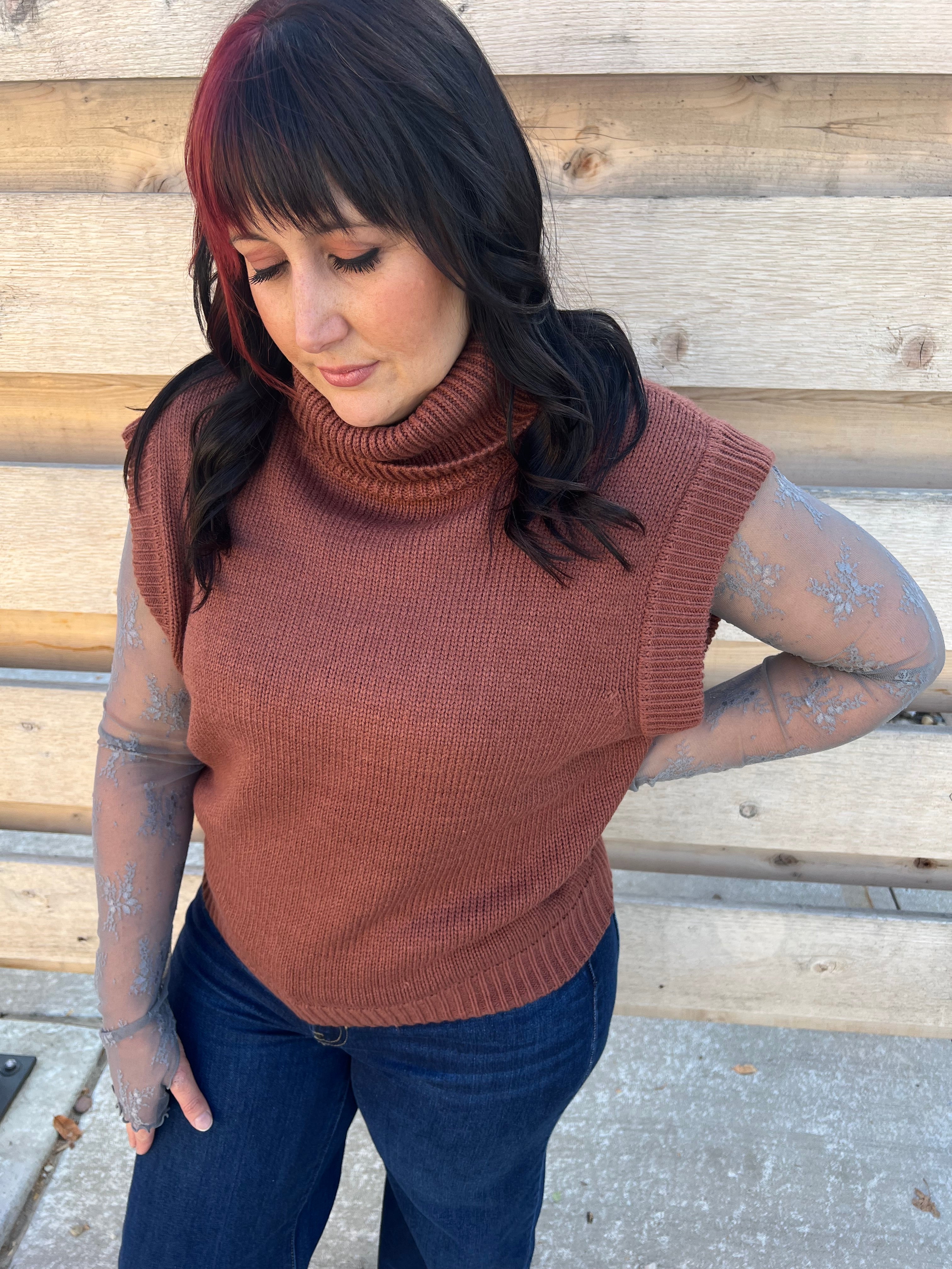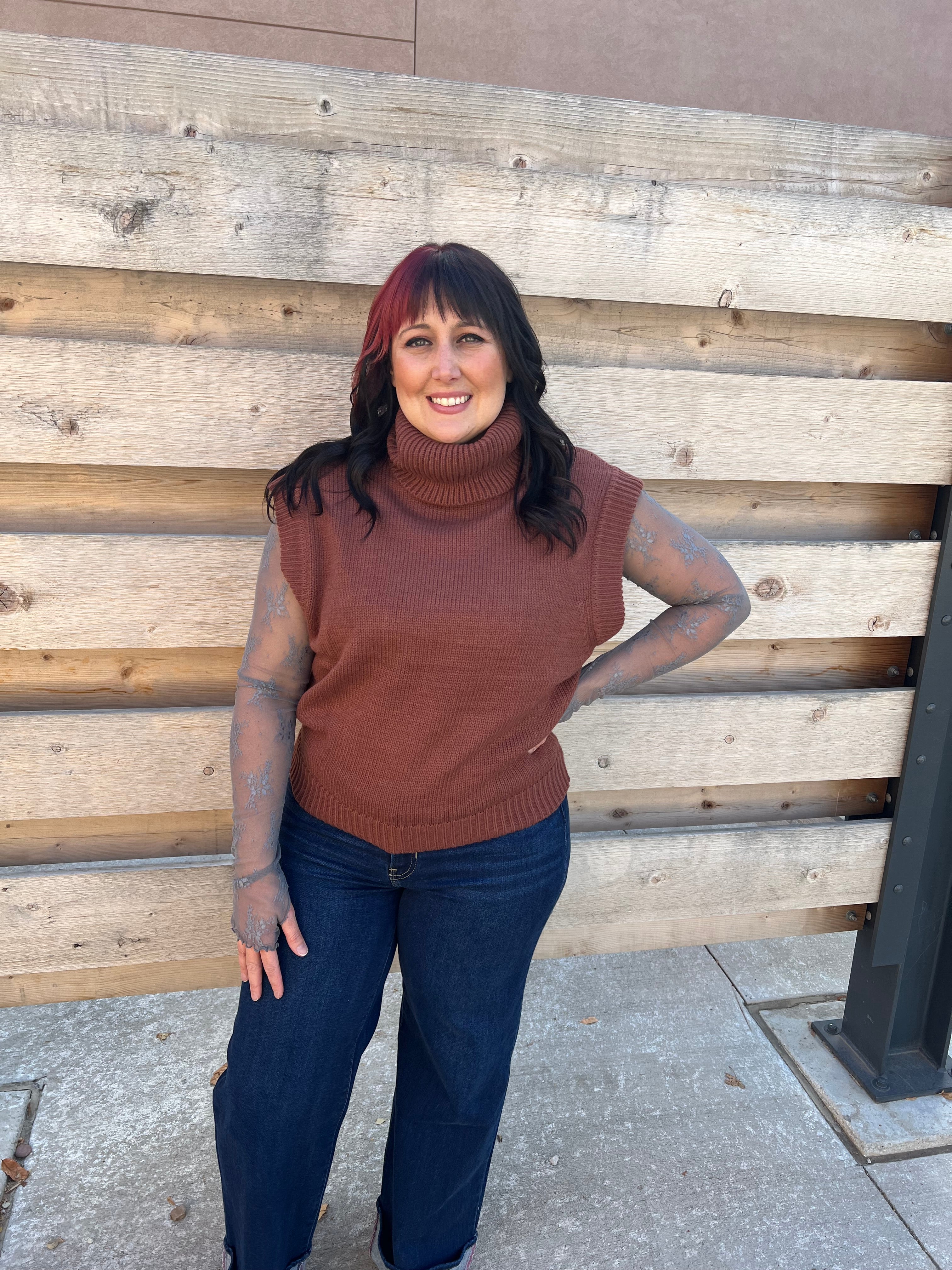 This sleeveless turtleneck sweater top is the perfect mix of chic and cozy. Featuring a rich rust hue and soft ribbed knit, it’s designed with a relaxed fit and high neckline for an elevated fall look. Style it solo or layer it over a mesh or long-sleeve top for a trendy, transitional vibe that’s effortlessly polished.