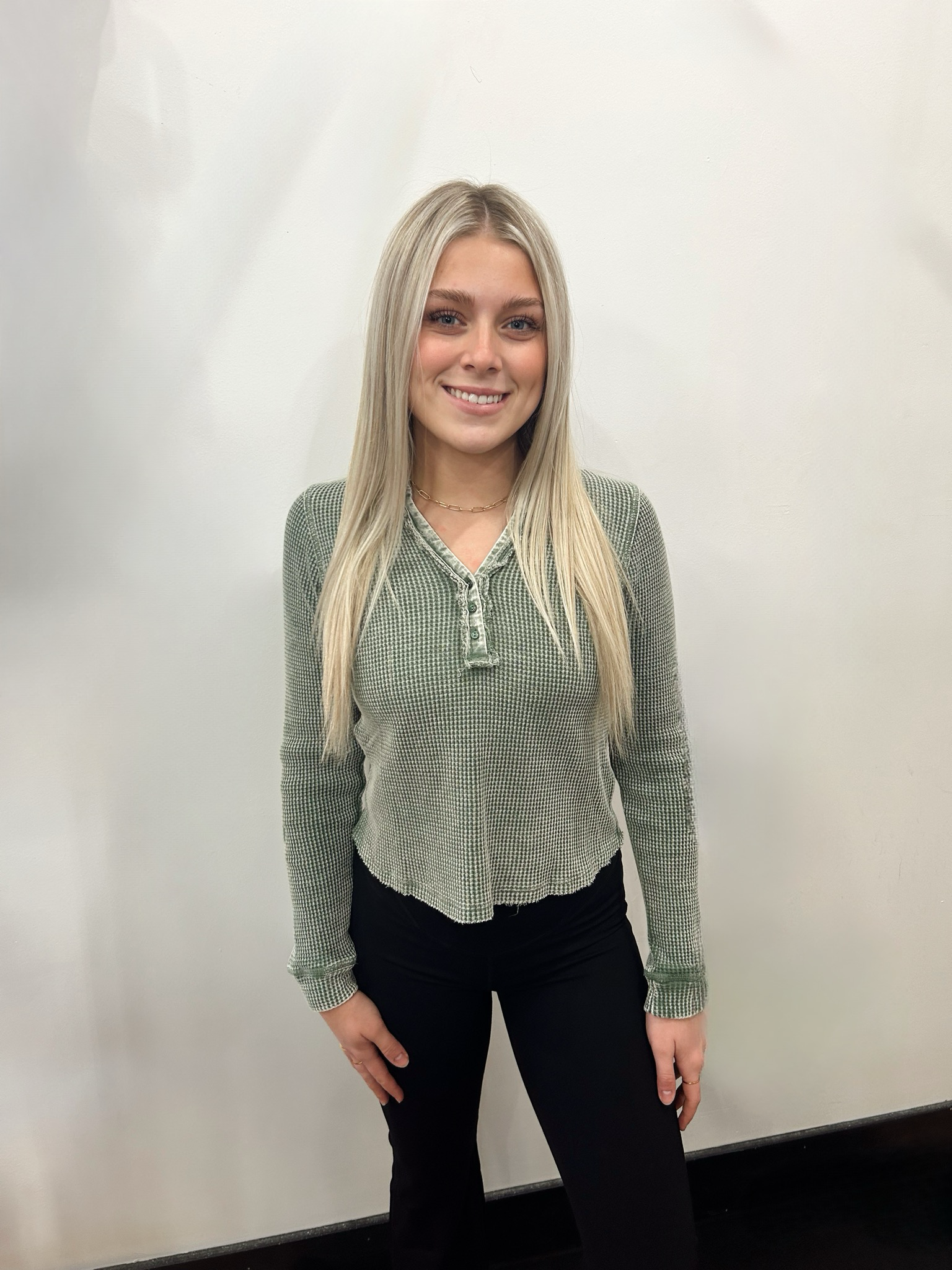 Comfortable meets chic in our Distressed Waffle Knit Top. Designed with a waffle texture, this piece offers the perfect balance of comfort and effortless style. Pair with your favorite denim or leggings!