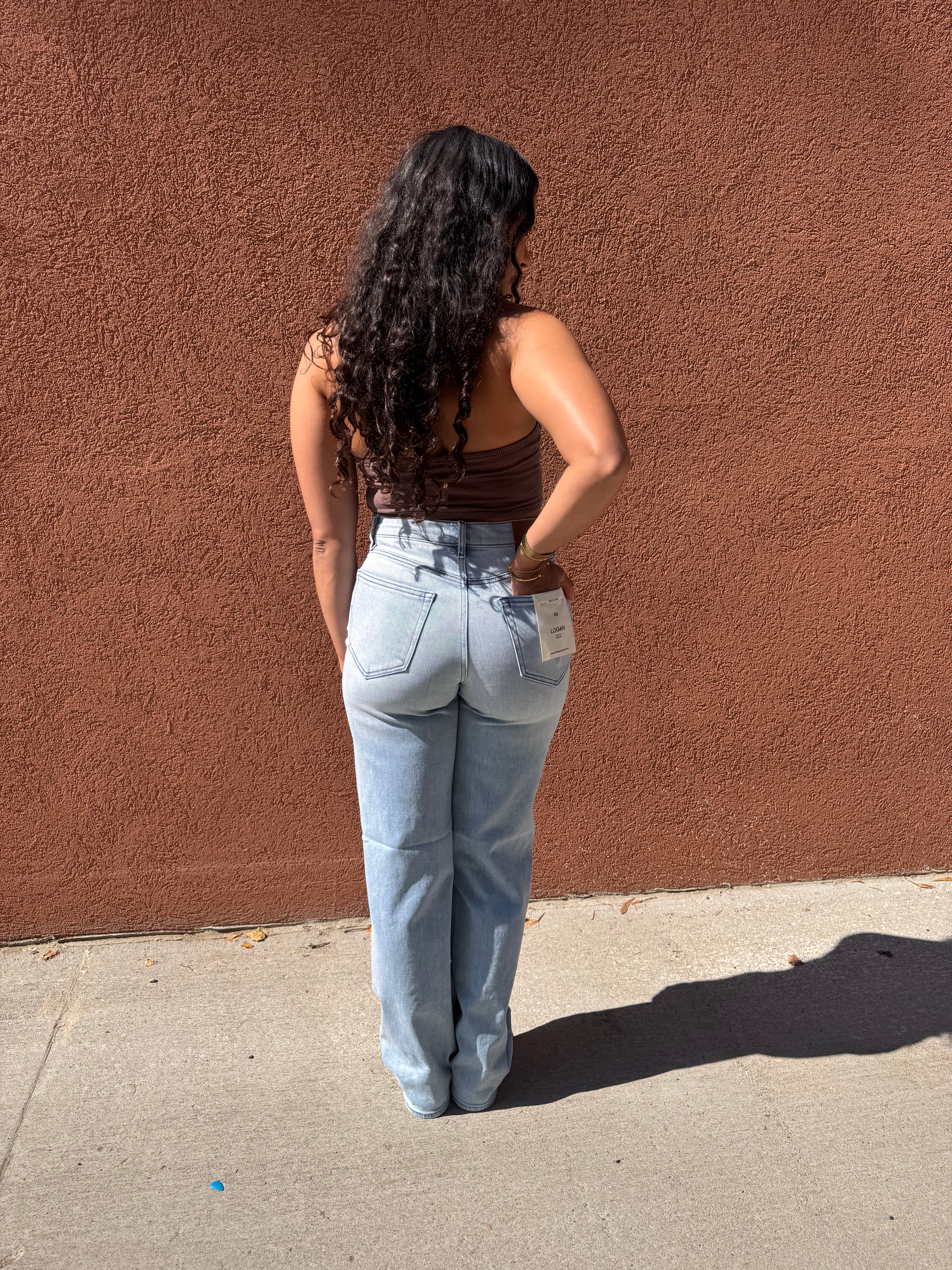 Our high-rise light wash jeans are the perfect mix of laid-back and polished. Designed with a flattering double-button waist, subtle distressing, and a straight-leg silhouette, they give you that easy-going vibe. Pair them with sneakers for a casual days or dress them up with heels for a night out- the styling options are endless.