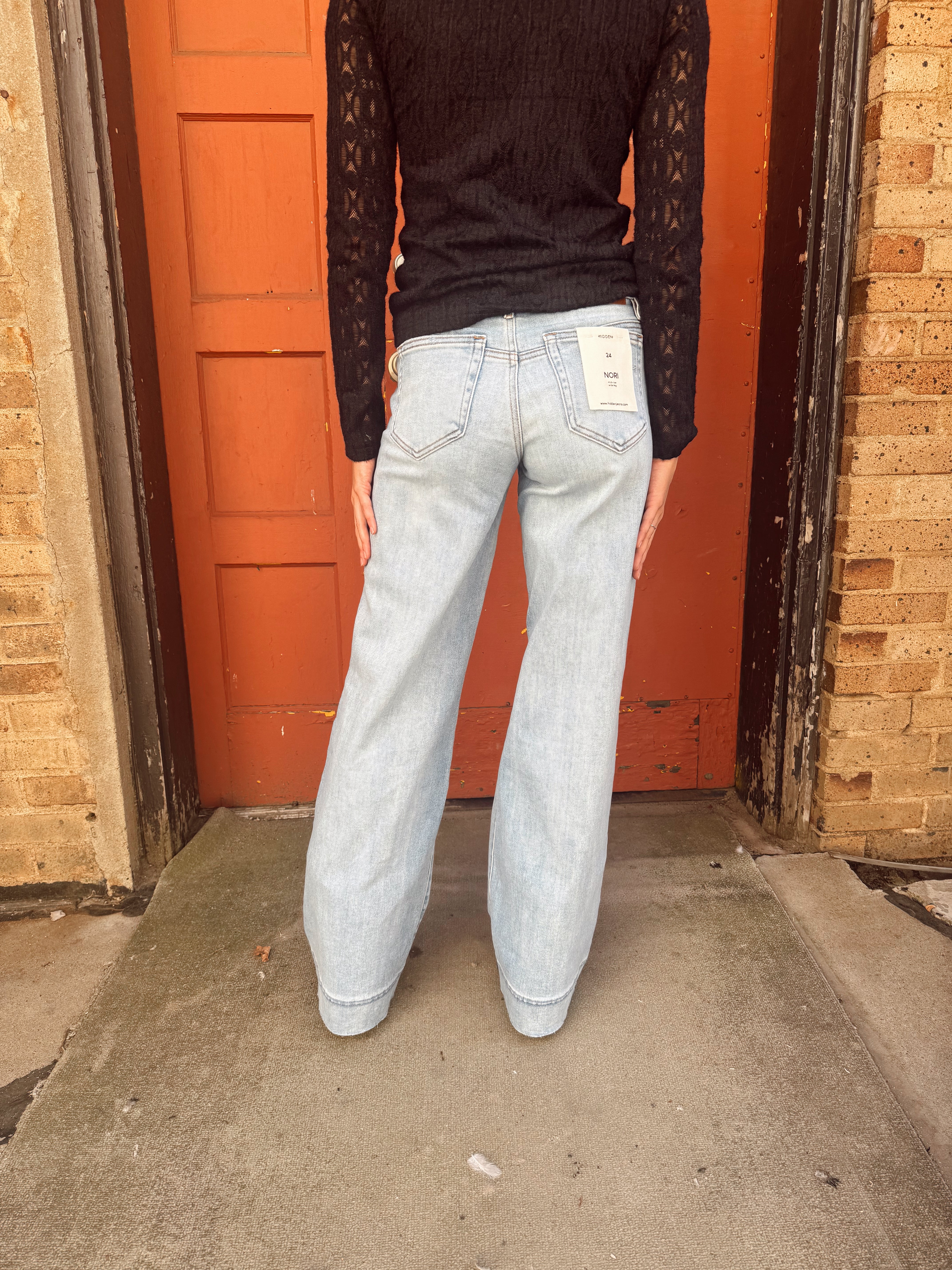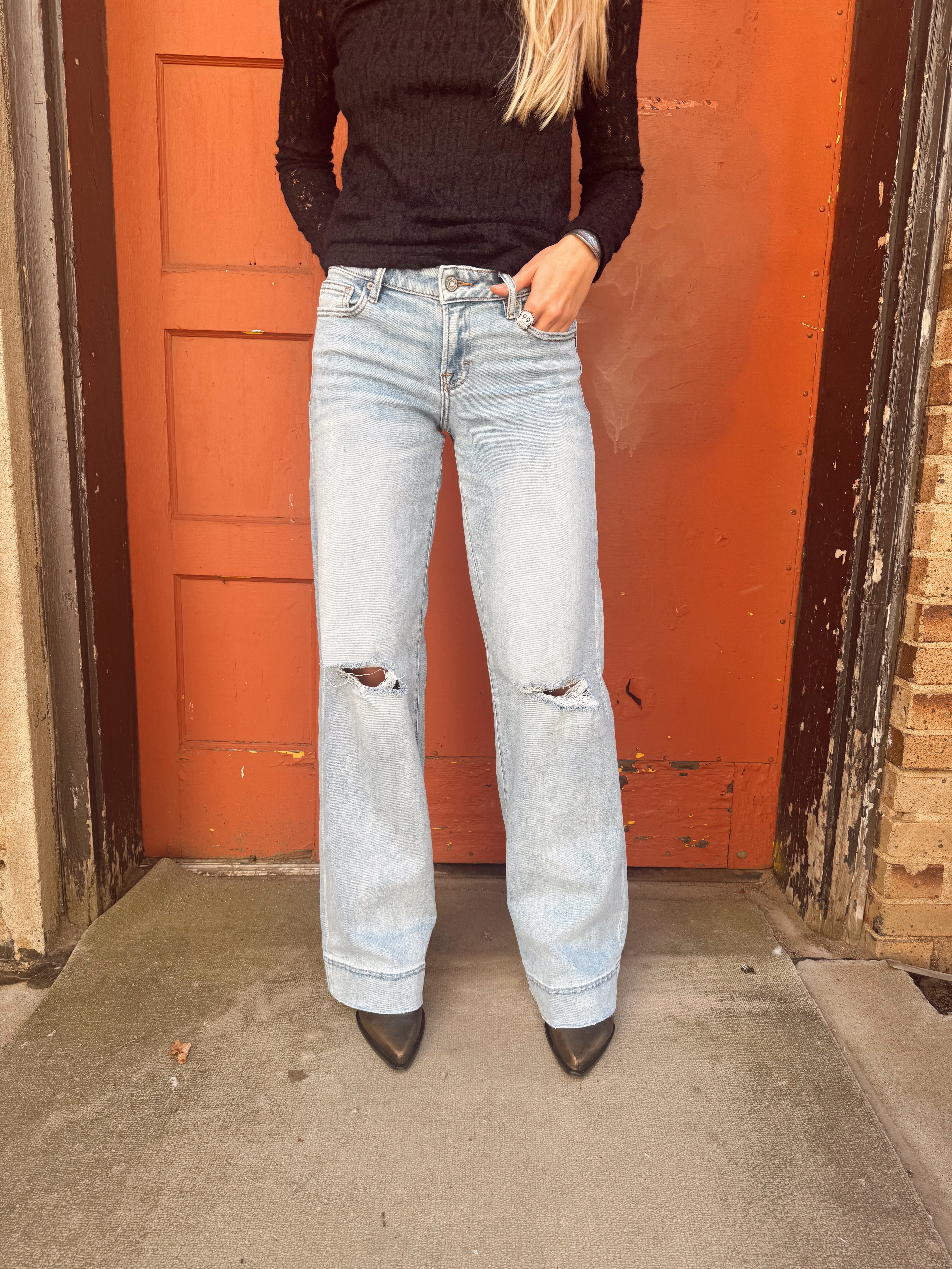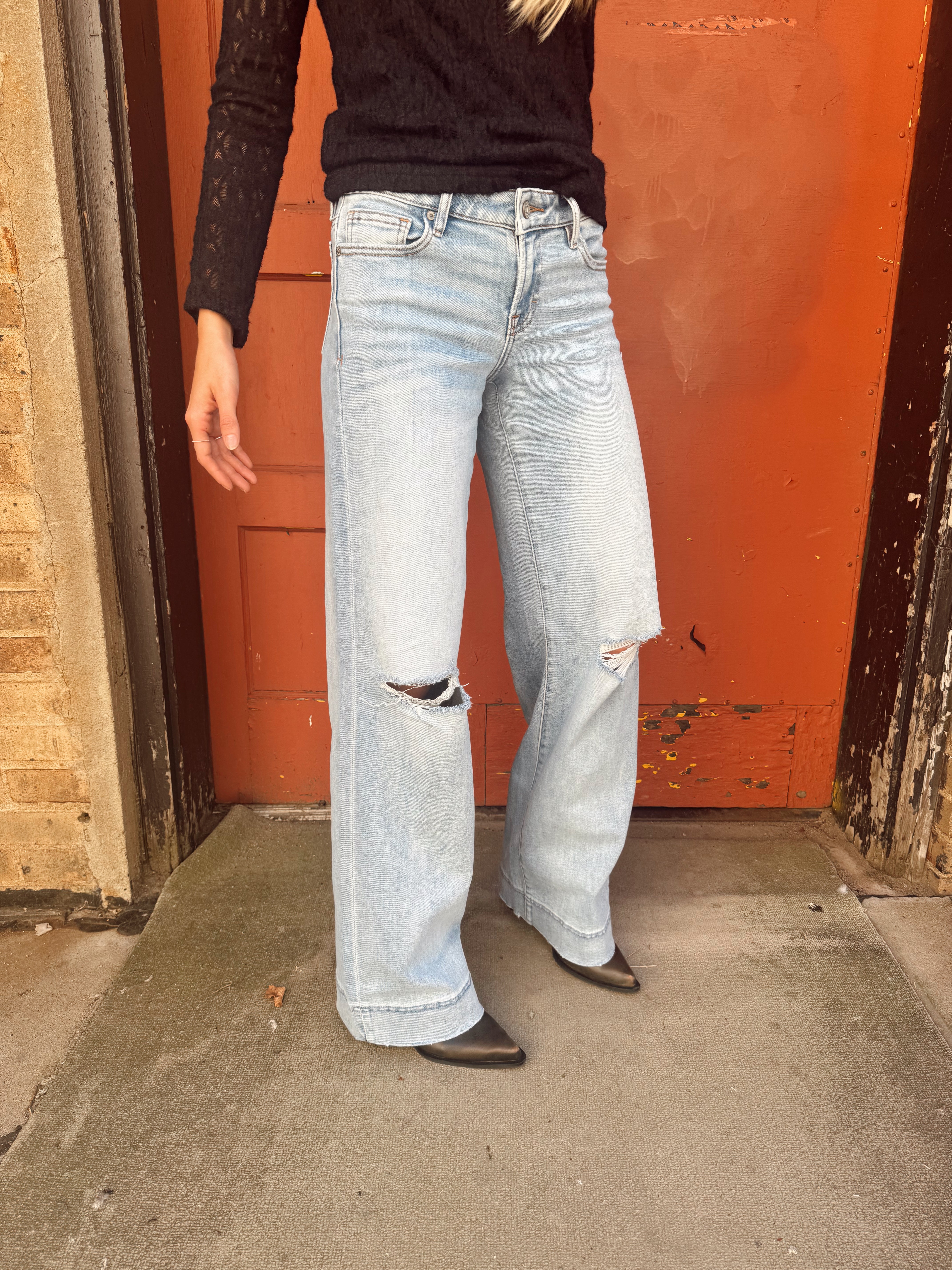 These light-wash distressed jeans feature a relaxed, slightly flare fit with just the right amount of edge. Designed with knee rips and a soft, lived-in feel, they bring that perfect balance of comfort and trend—style them with sneakers for casual days or dress them up with heels and a sleek top for an elevated vibe.