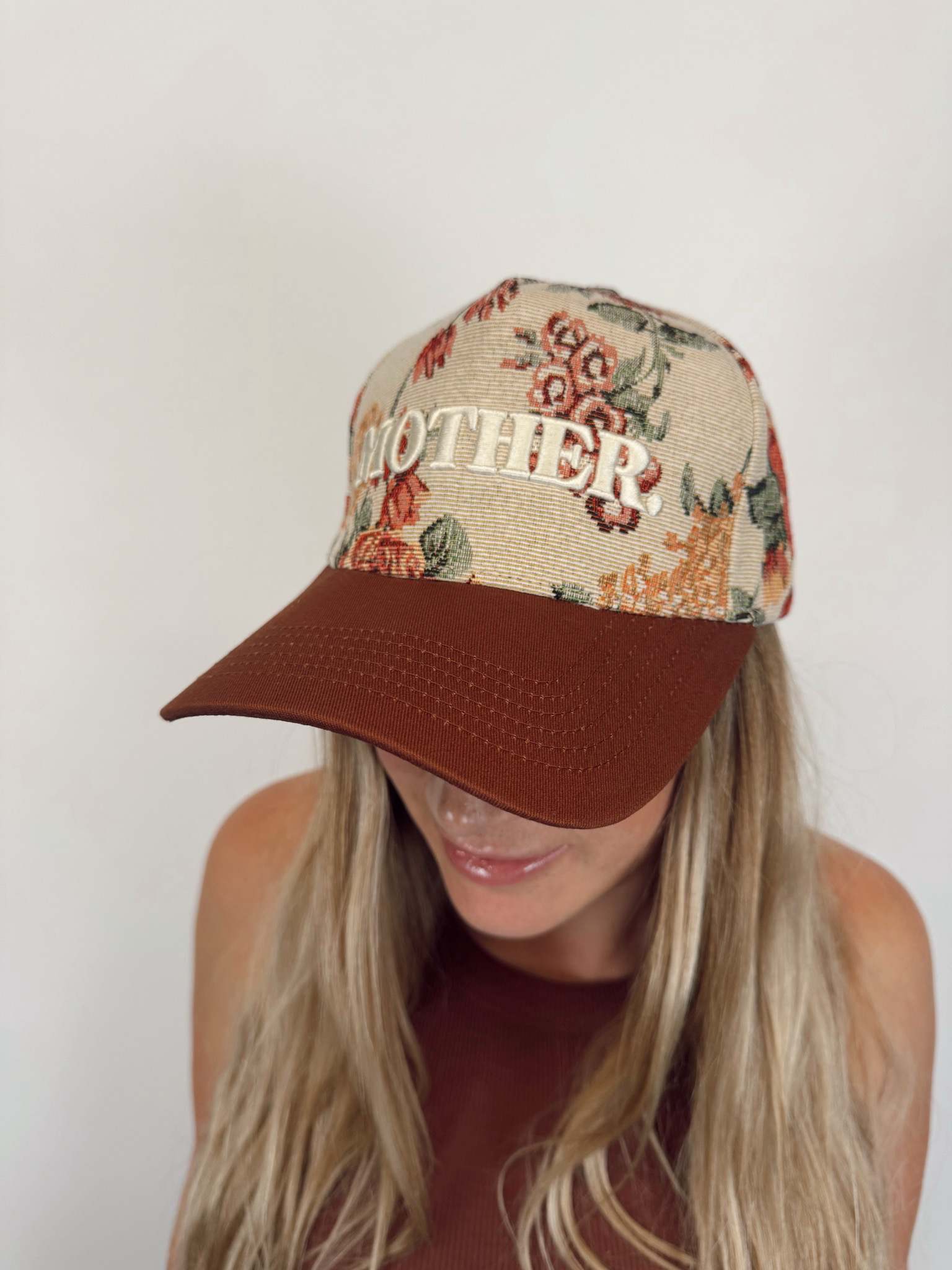 Top off your look with a sweet touch of motherhood. This floral "Mother" hat combines a soft, feminine print with everyday style-- perfect for sunny days, errands, or gifting the mama who does it all.