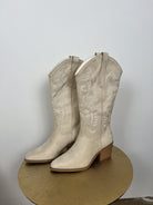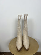 Step into effortless style with these creamy suede western boots — a timeless blend of modern charm and cowboy flair. Featuring intricate stitched detailing, a classic pointed toe, and a stacked block heel for all-day comfort, they’re the perfect mix of rustic and refined. Whether you’re dressing up denim or adding an edge to a dress, these boots are your go-to for every season.